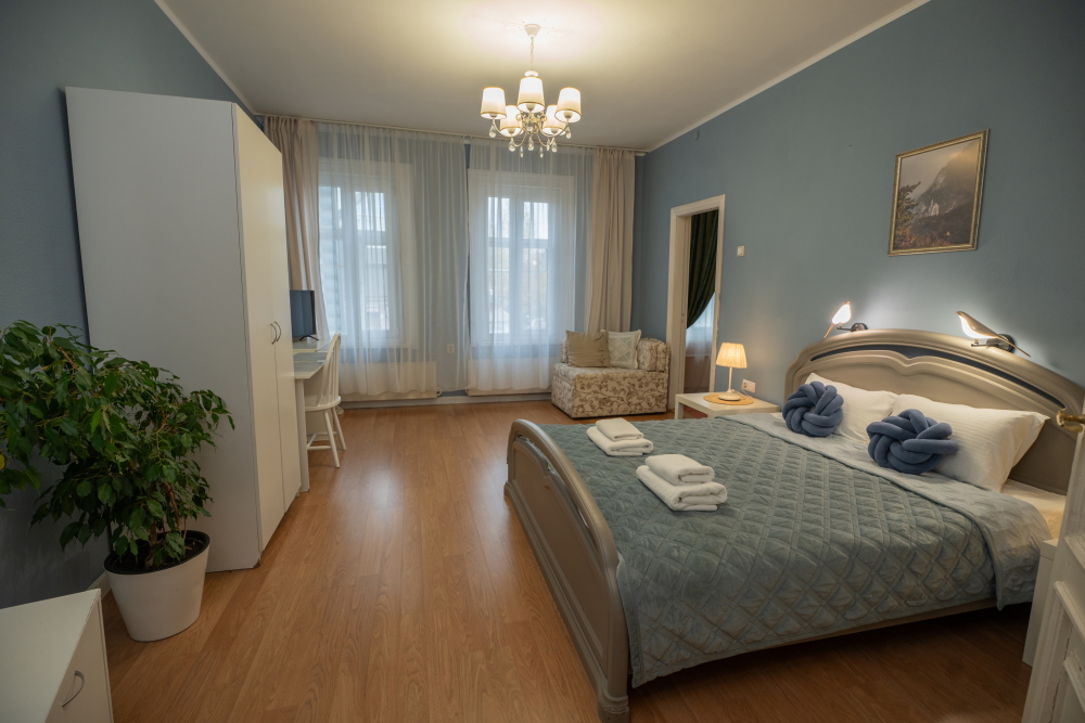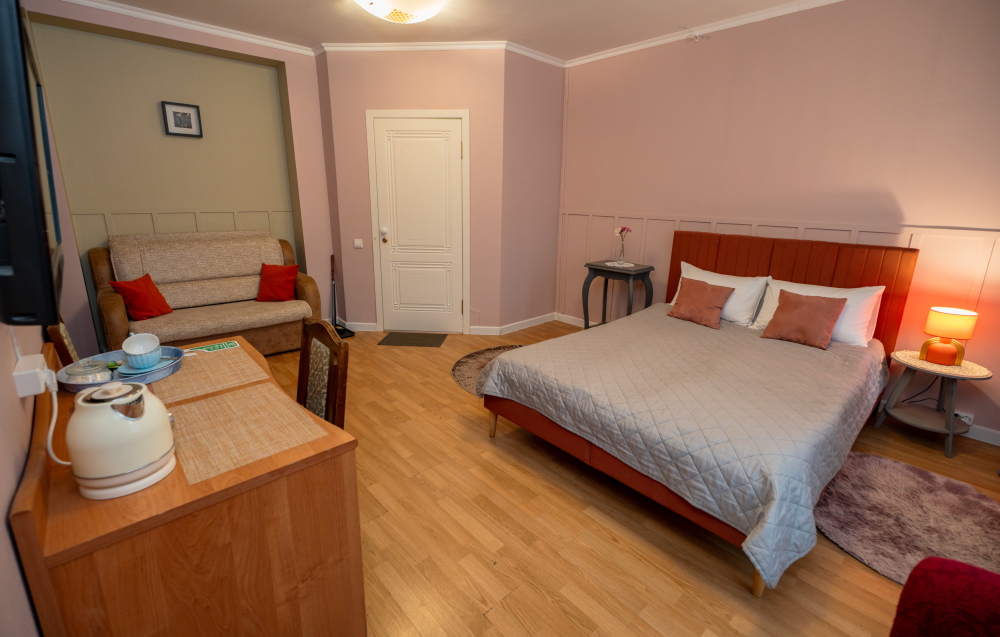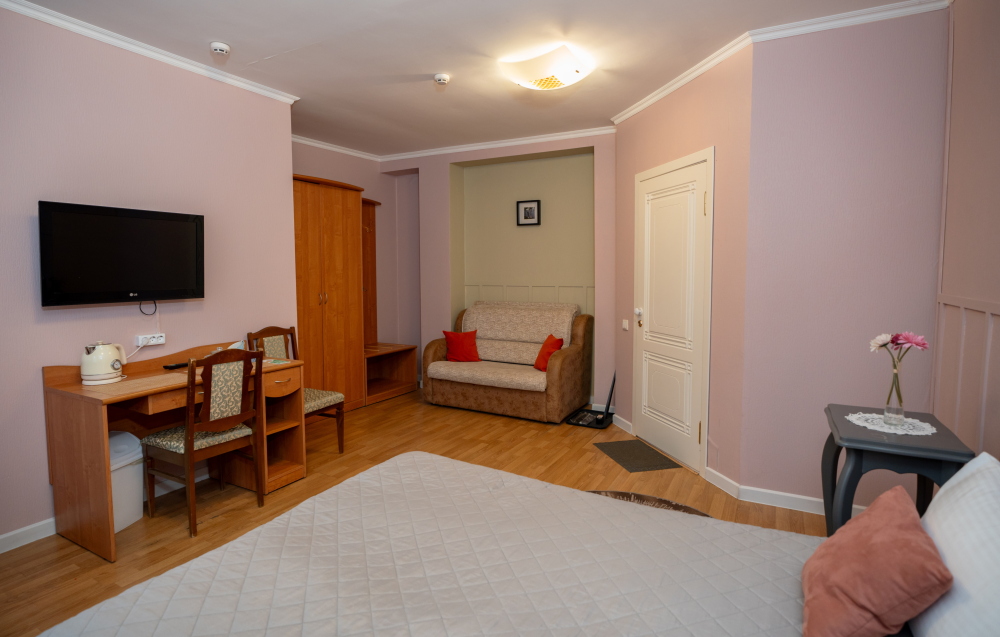В номере Вас ждет уютная двуспальная кровать и компактный одноместный диван.