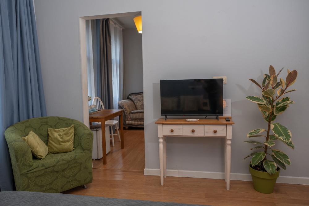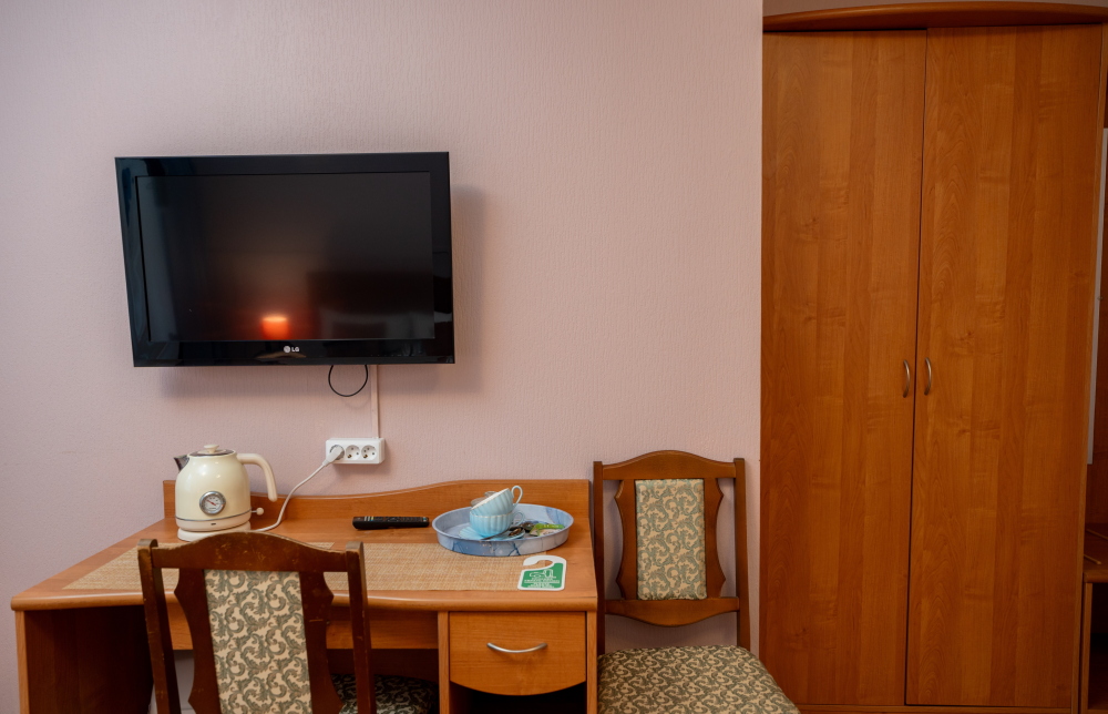 В номере есть всё для отдыха и быта: шкаф, телевизор, стол, стулья.