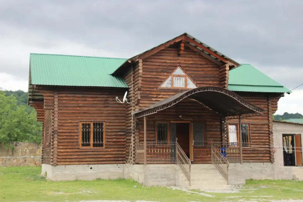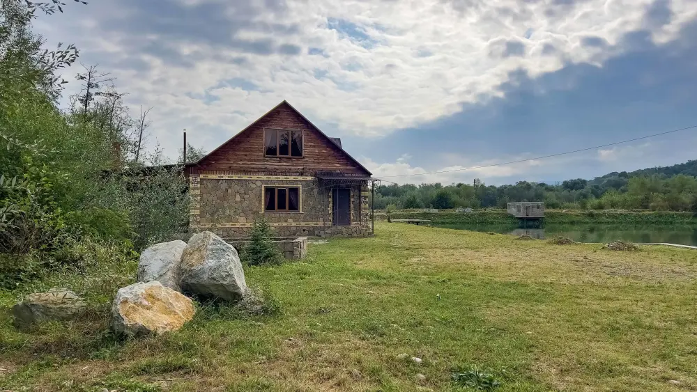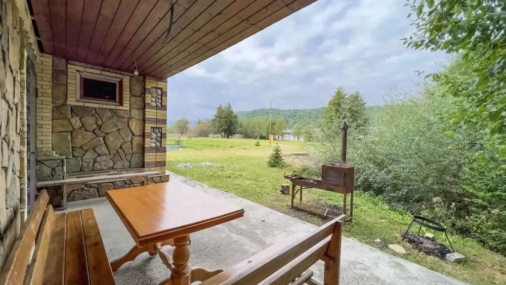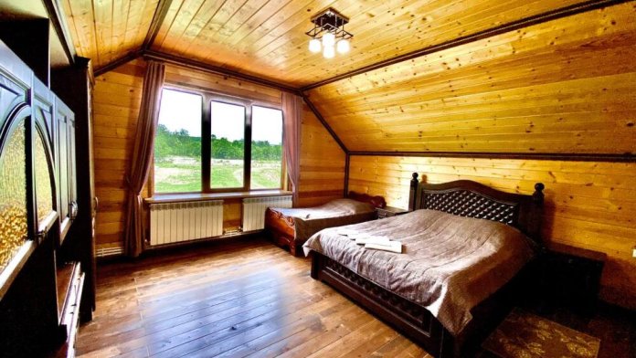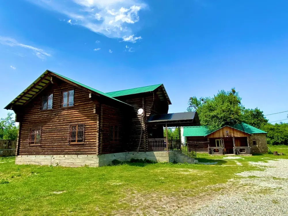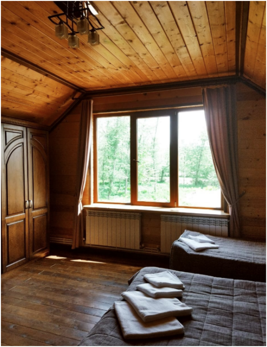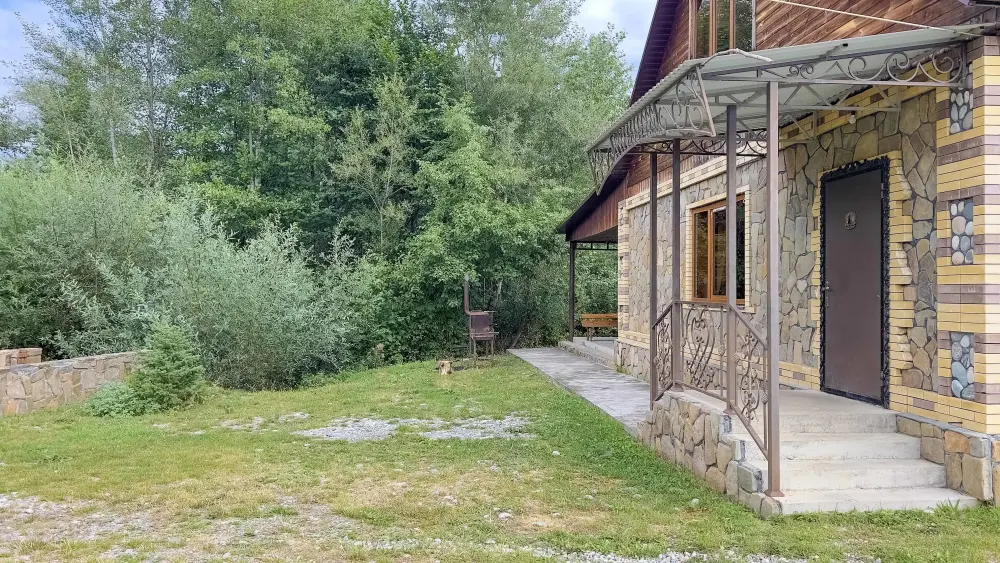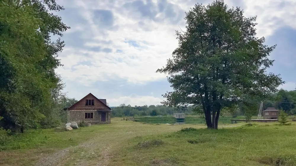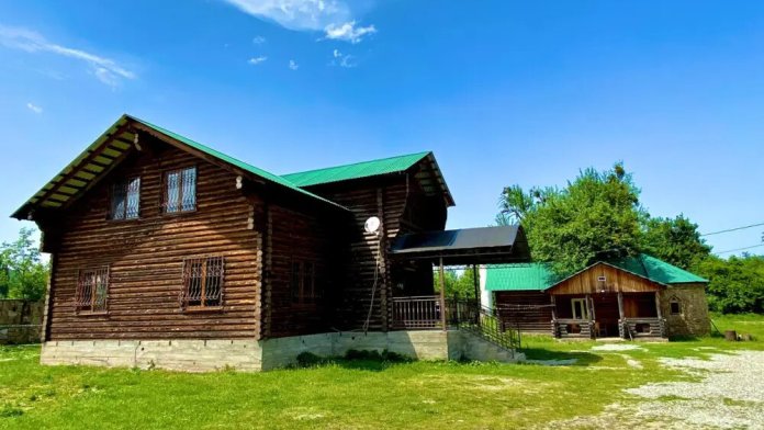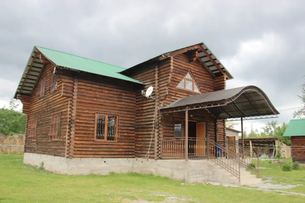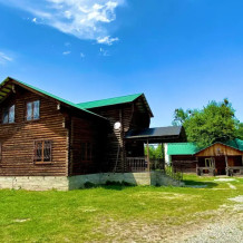Дома из соснового сруба расположены в лесу, на берегу горной реки, есть озеро с рыбами, из окон открывается потрясающий вид на горы.
