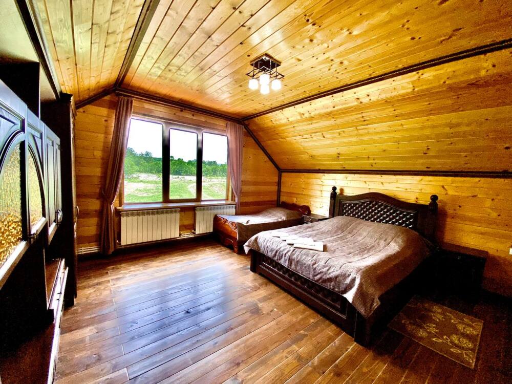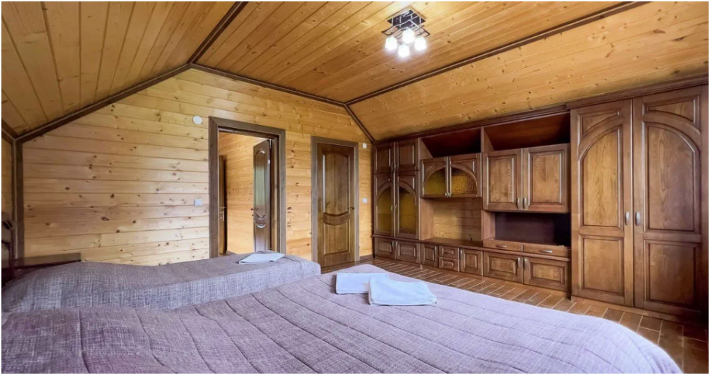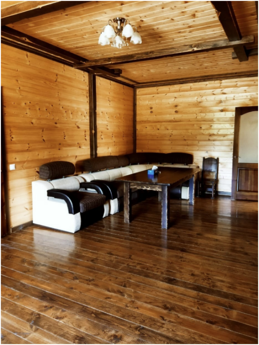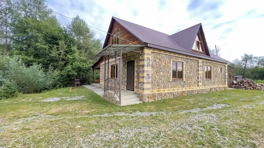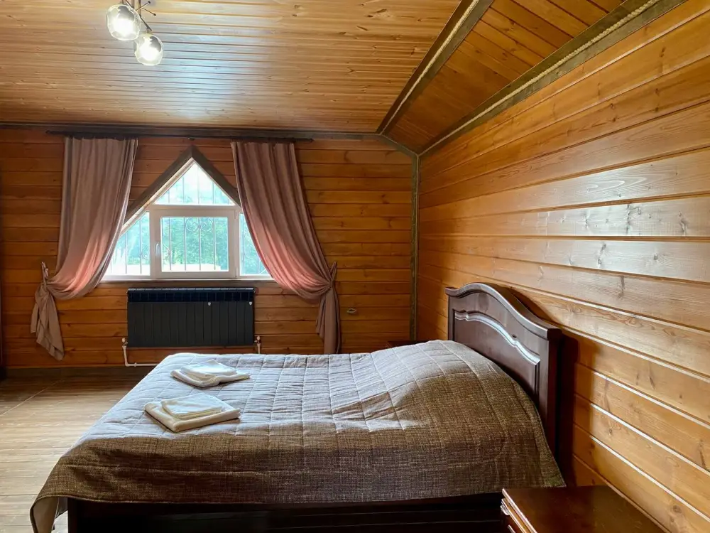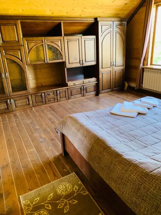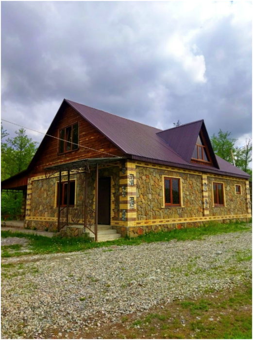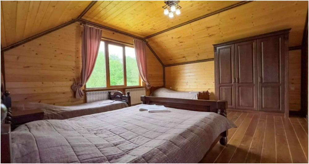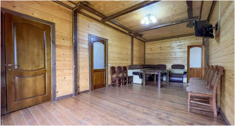 Дома из соснового сруба расположены в лесу, на берегу горной реки, есть озеро с рыбами, из окон открывается потрясающий вид на горы.