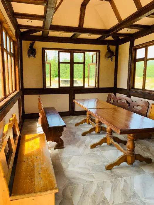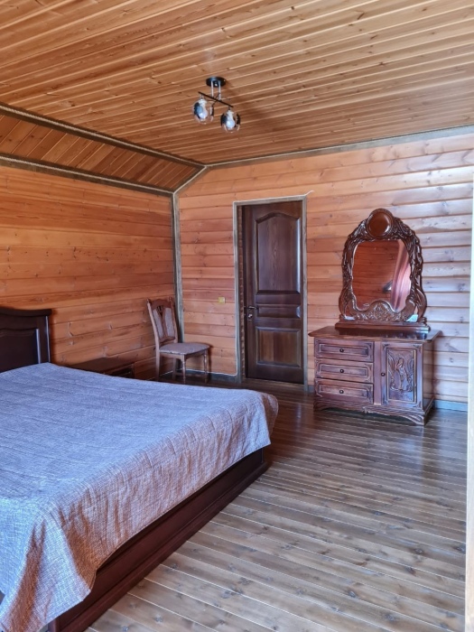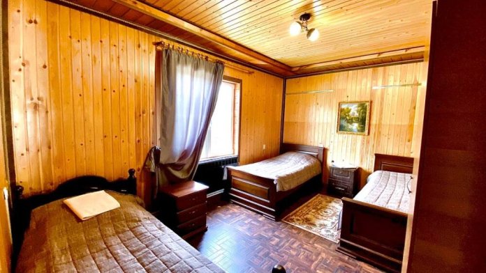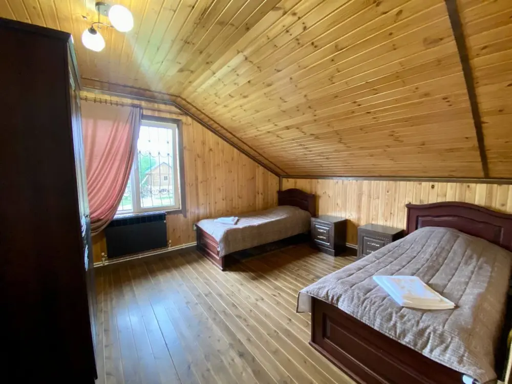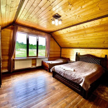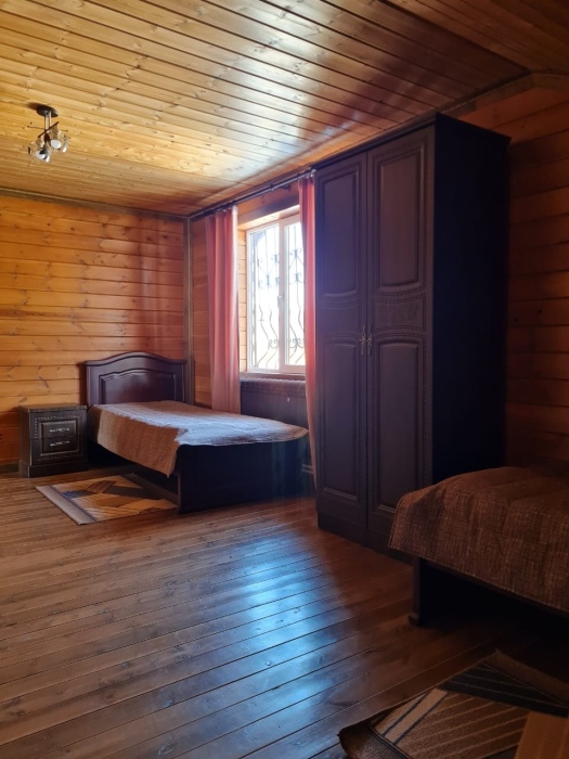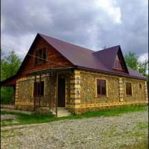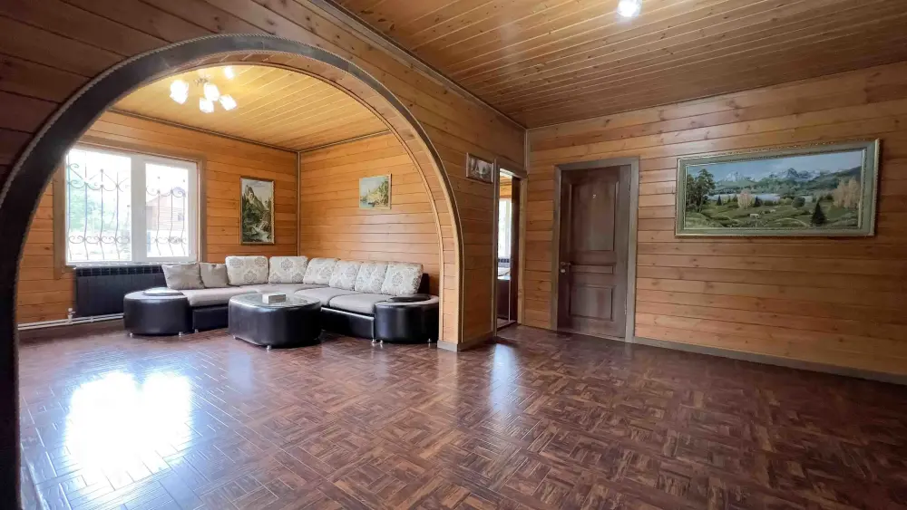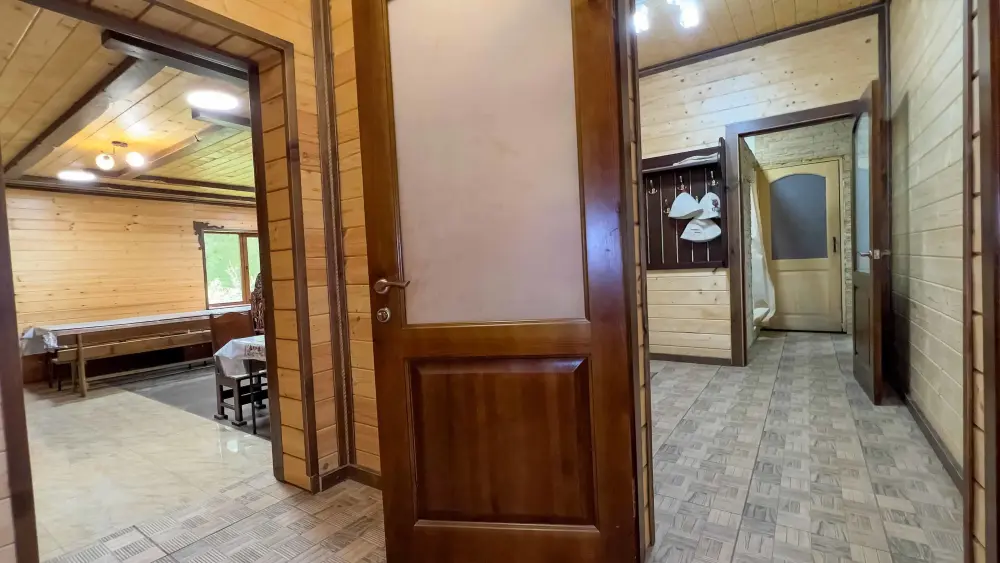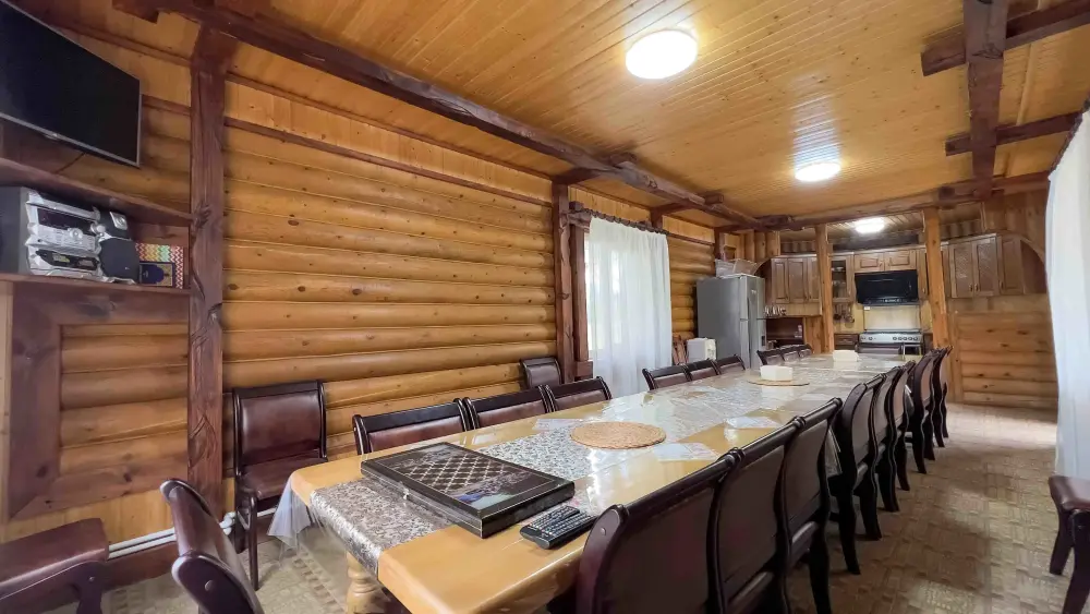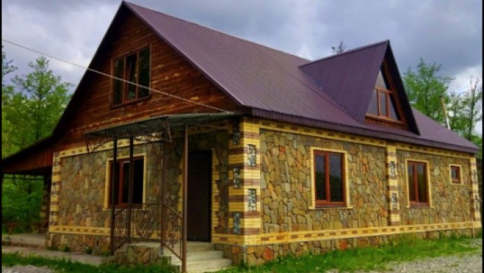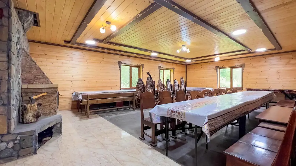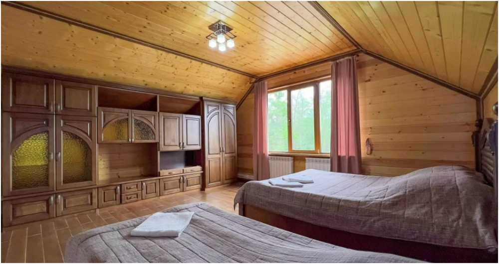 Дома из соснового сруба расположены в лесу, на берегу горной реки, есть озеро с рыбами, из окон открывается потрясающий вид на горы.