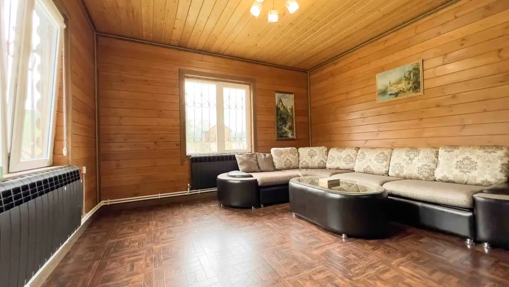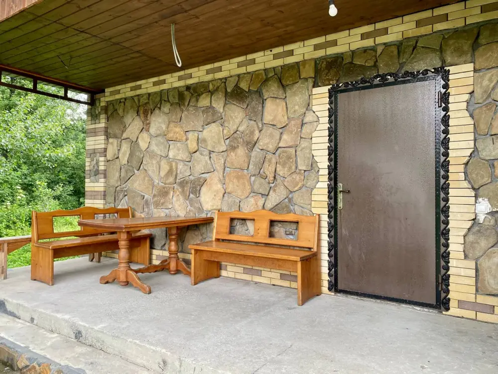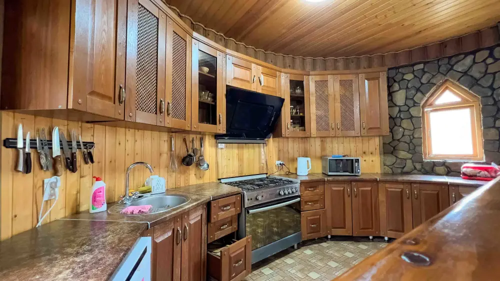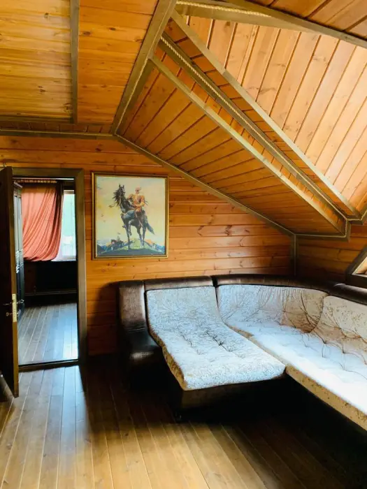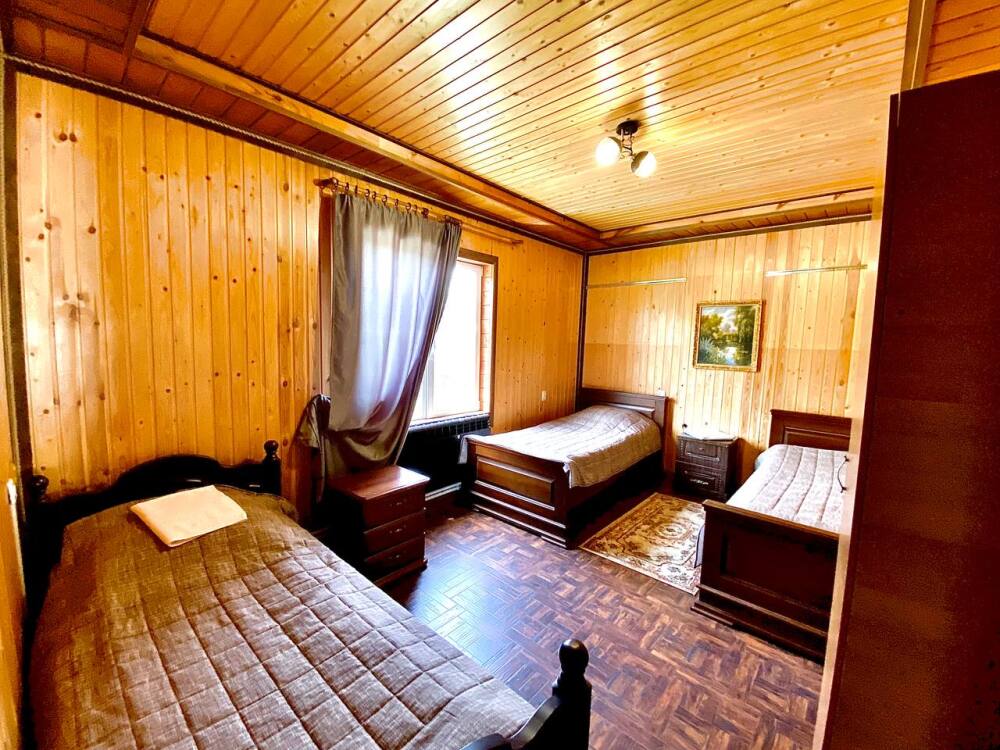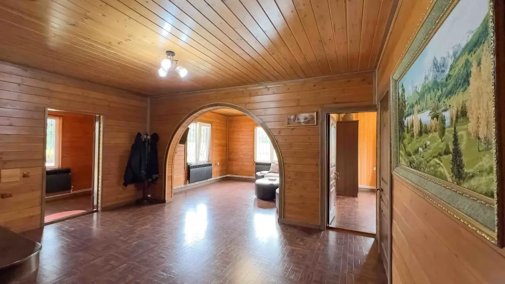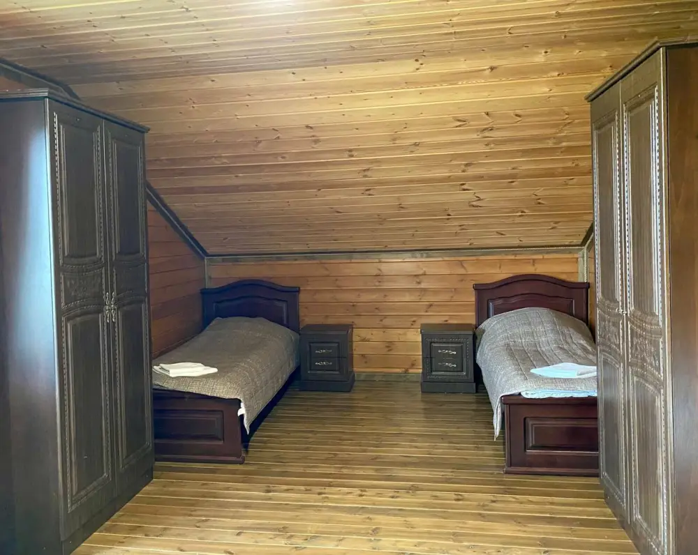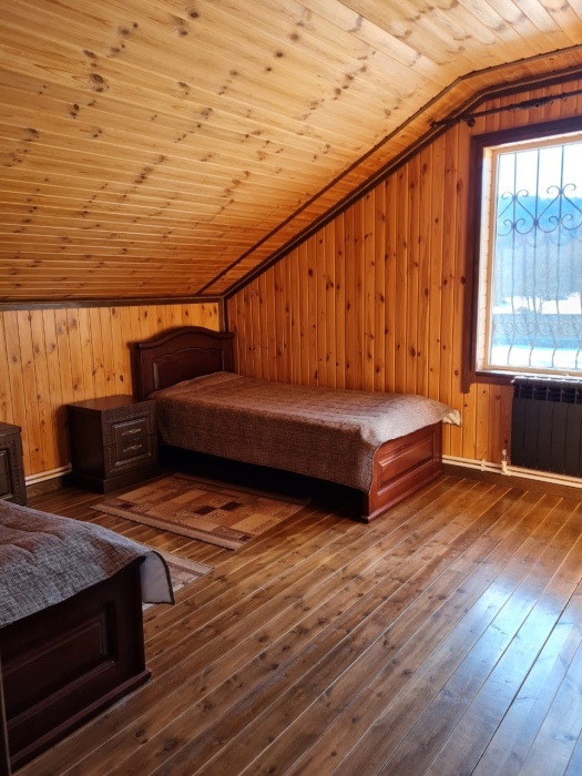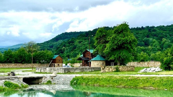 Дома из соснового сруба расположены в лесу, на берегу горной реки, есть озеро с рыбами, из окон открывается потрясающий вид на горы.