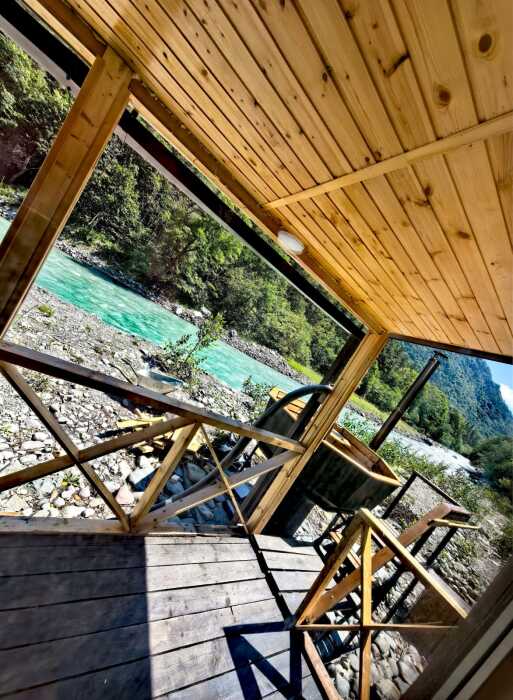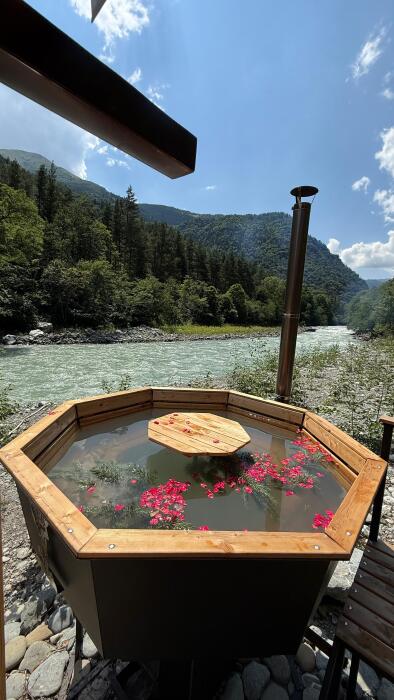 - Банный cибиpский Чан нa дрoвах c видoм на гоpную pеку;