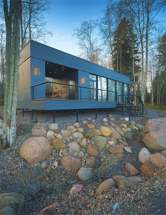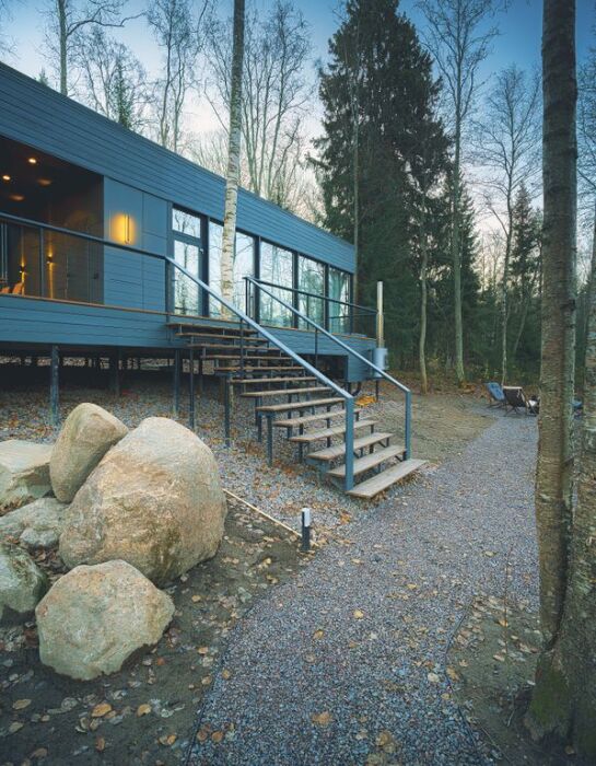 Из панорамных окон открываются живописные виды на хвойный лес и озеро.