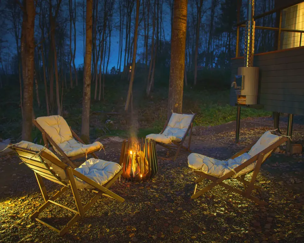 Вила с панорамными окнами, собственной всепогодной купелью, мангалом и общей костровой зоной.