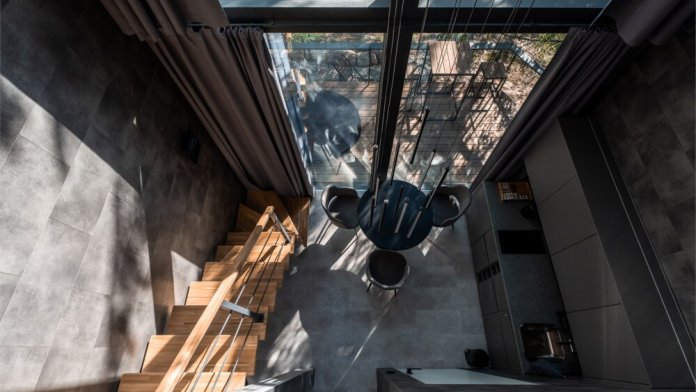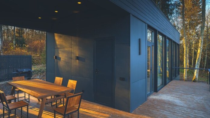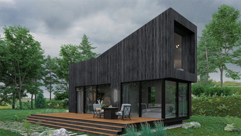 Вилла без купели с панорамными окнами, террасой, мангалом и собственной костровой зоной.