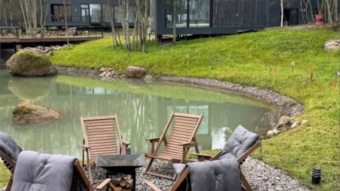 Помимо уютных домов на территории расположен дизайнерский пруд и видовые качели.