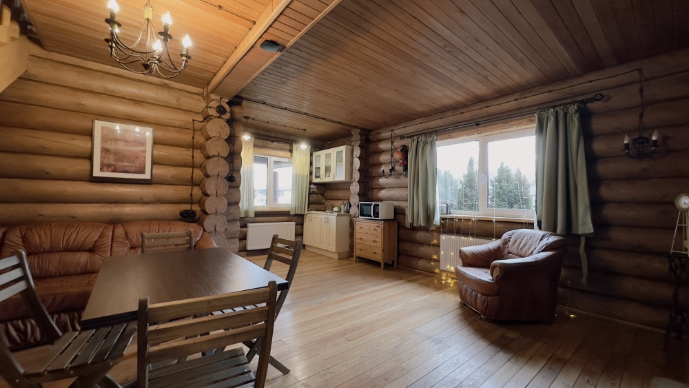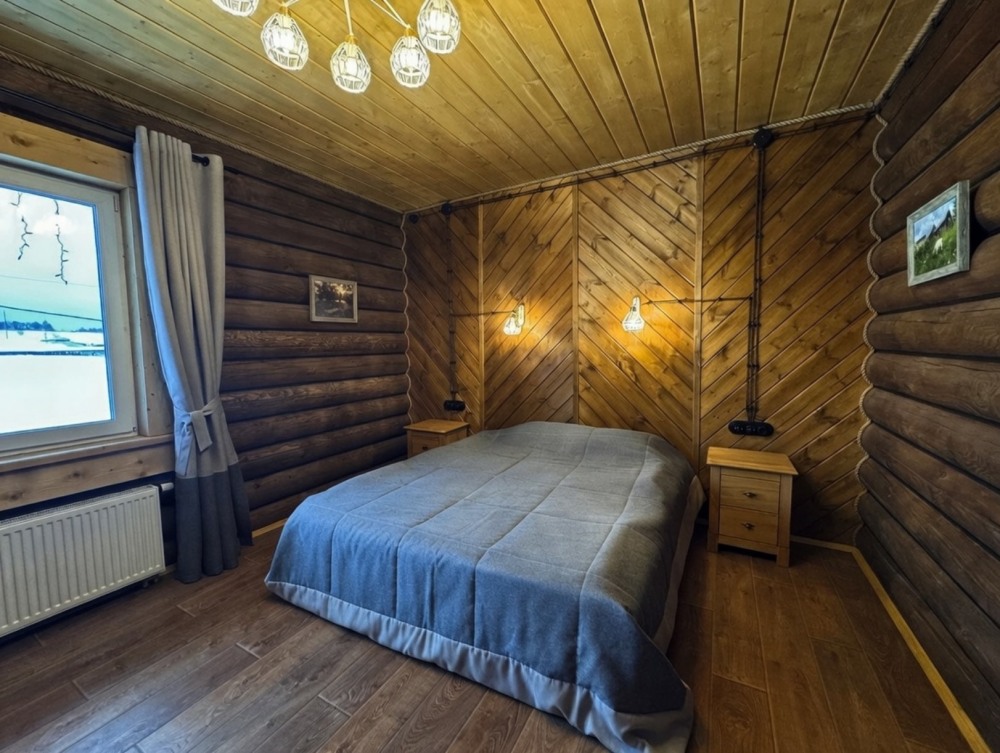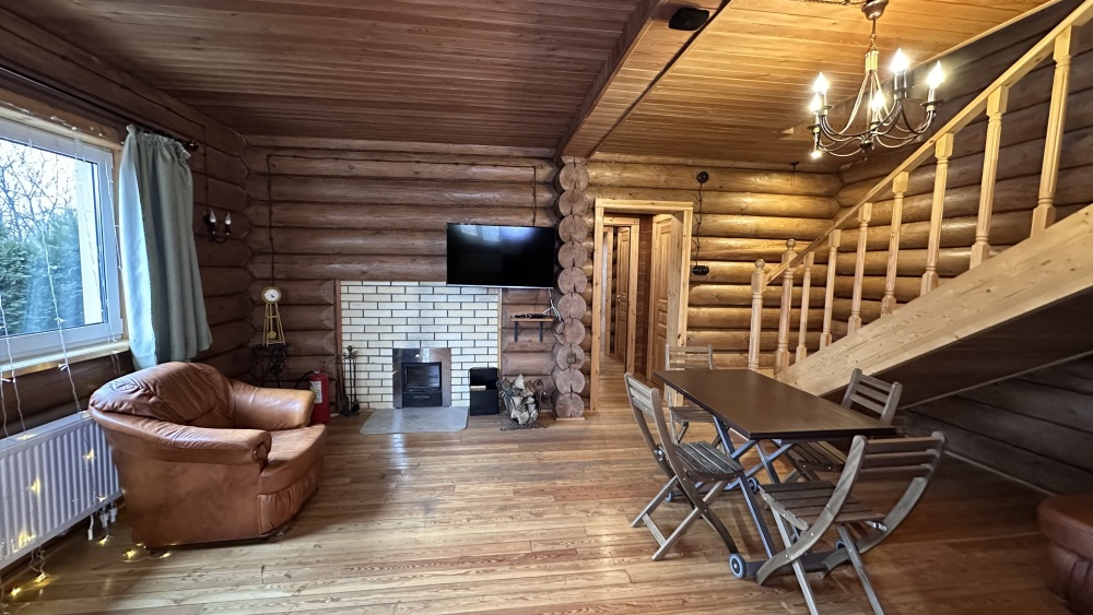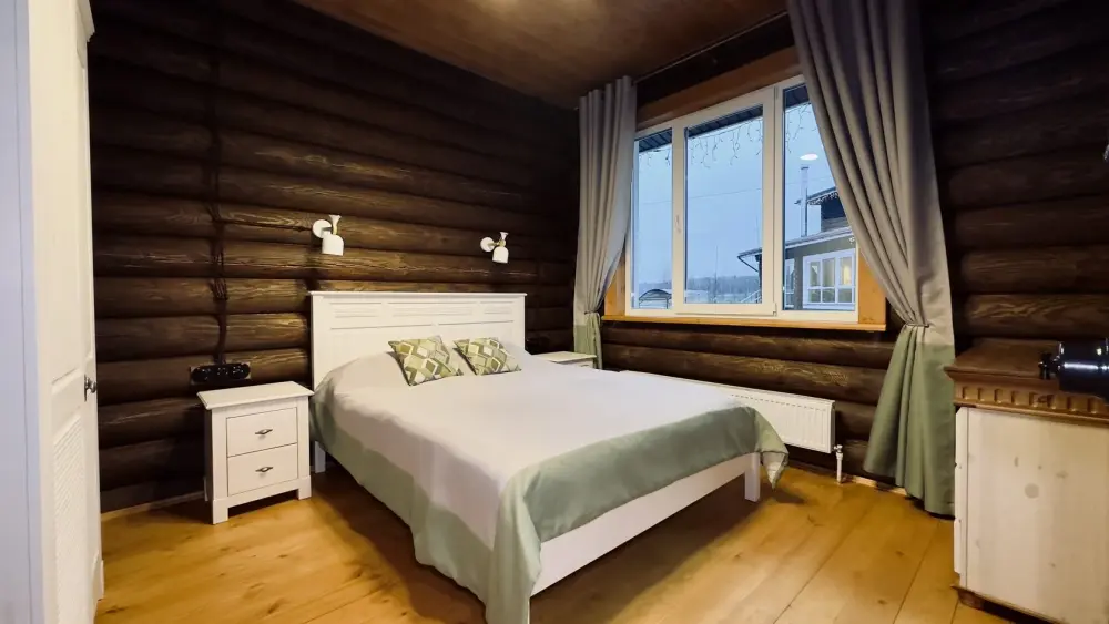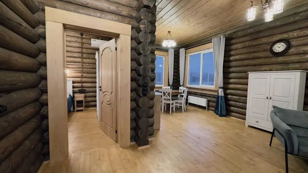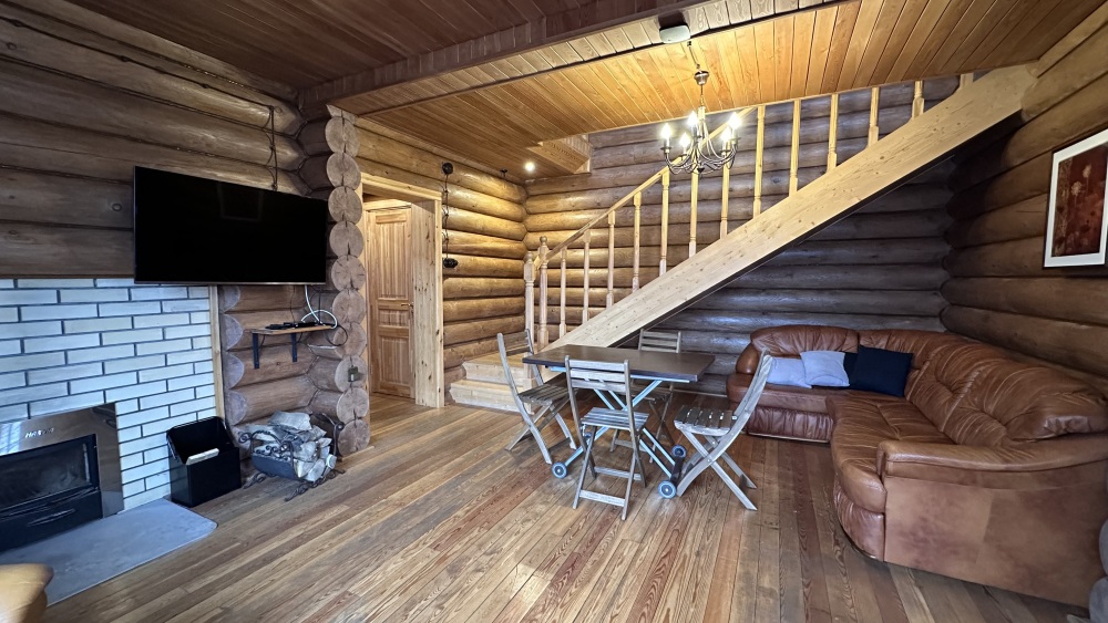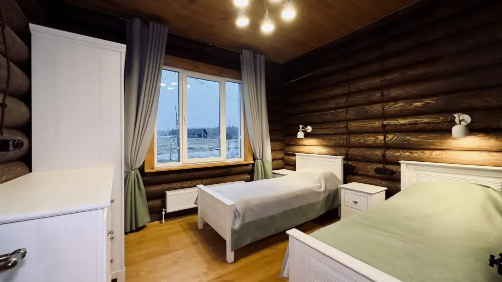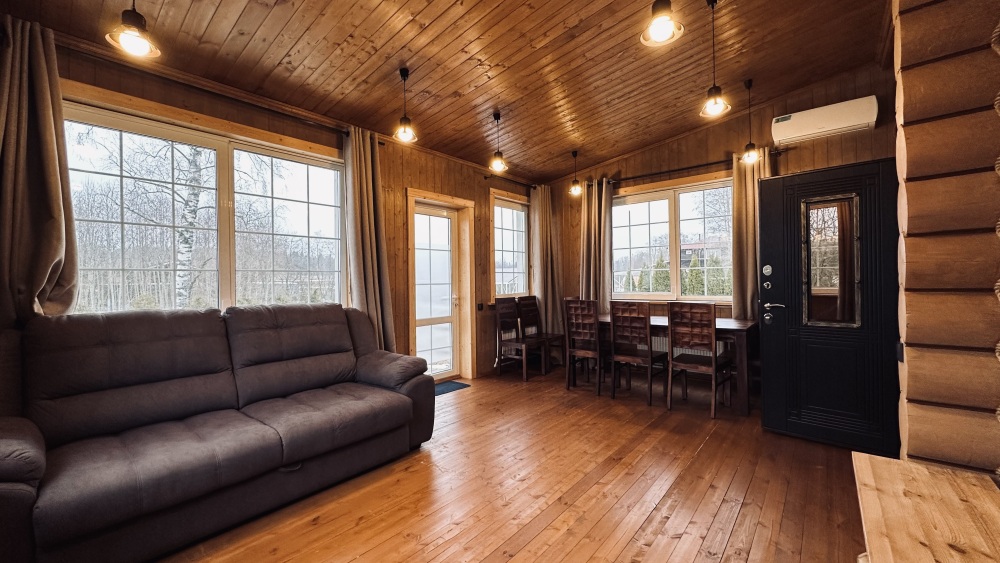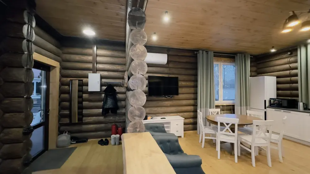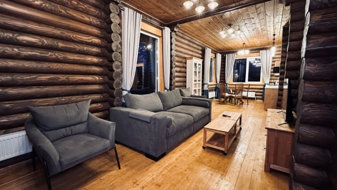 Просторный дом из сруба площадью 145 м² с камином — это идеальное место для семейного отдыха или уикенда с друзьями. Натуральное дерево создаёт особую атмосферу тепла и уюта, а камин в гостиной наполняет вечера загородным шармом. В доме две спальни: одна с двуспальной кроватью, другая — с двумя односпальными, а при необходимости в гостиной могут с комфортом разместиться ещё 2 гостя.