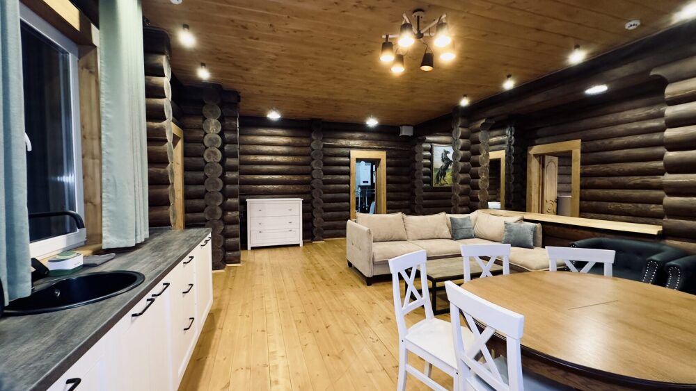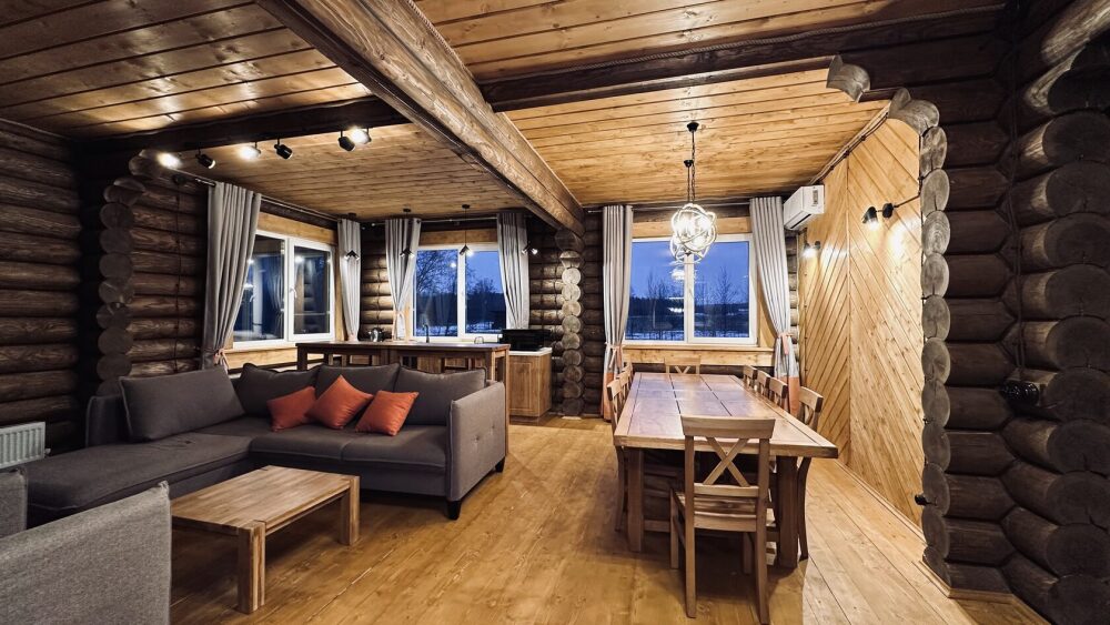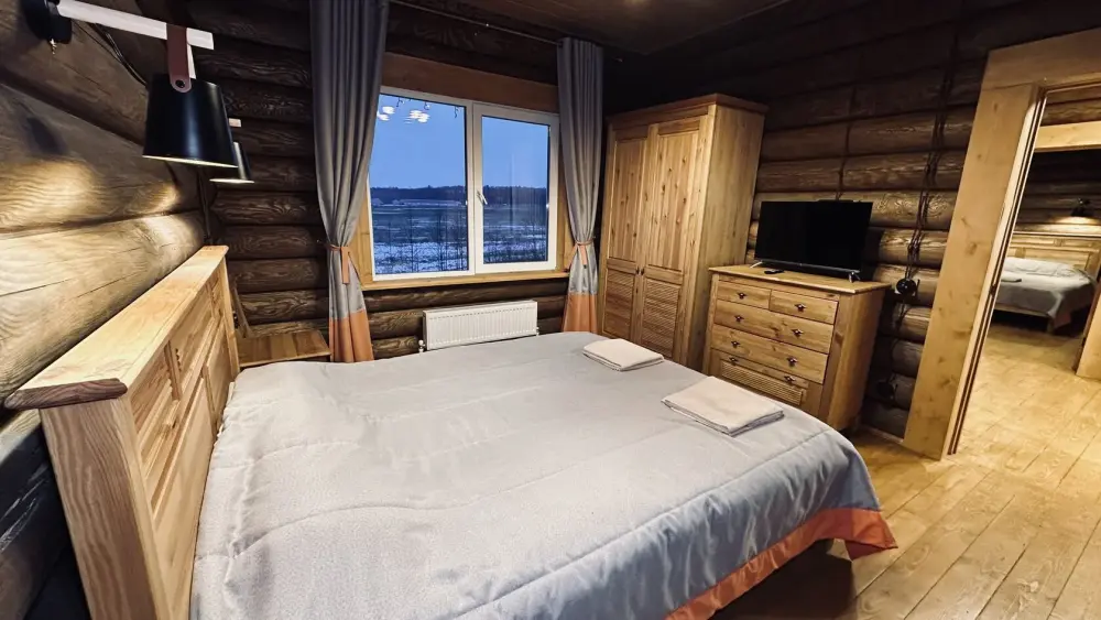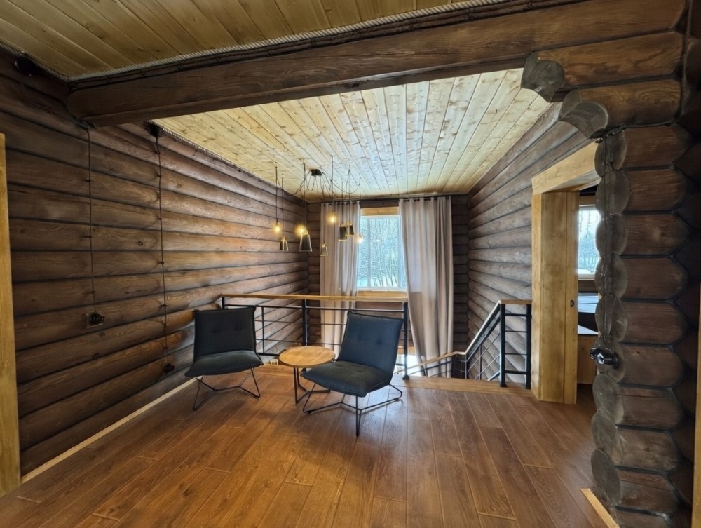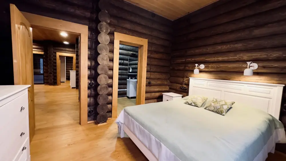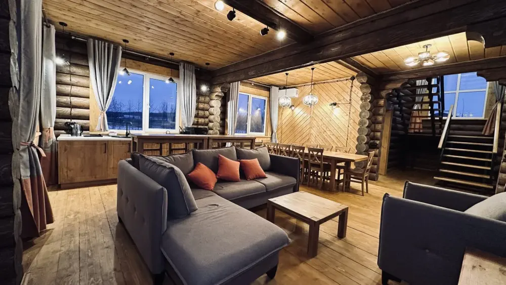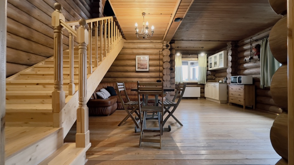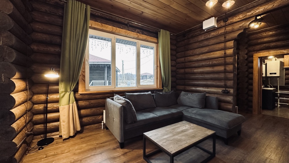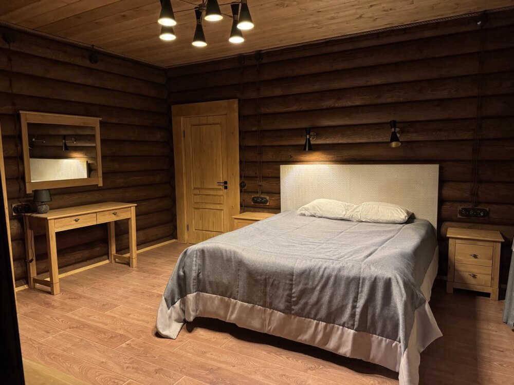 Просторный дом из сруба площадью 145 м² с камином — это идеальное место для семейного отдыха или уикенда с друзьями. Натуральное дерево создаёт особую атмосферу тепла и уюта, а камин в гостиной наполняет вечера загородным шармом. В доме две спальни: одна с двуспальной кроватью, другая — с двумя односпальными, а при необходимости в гостиной могут с комфортом разместиться ещё 2 гостя.