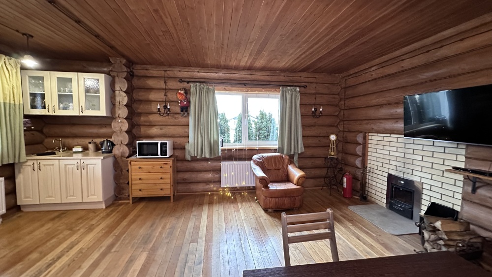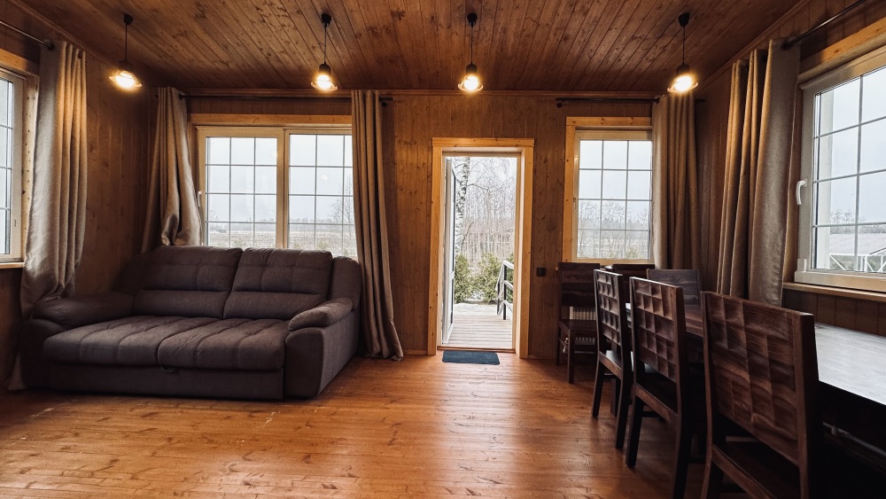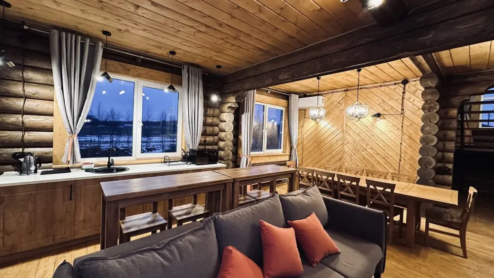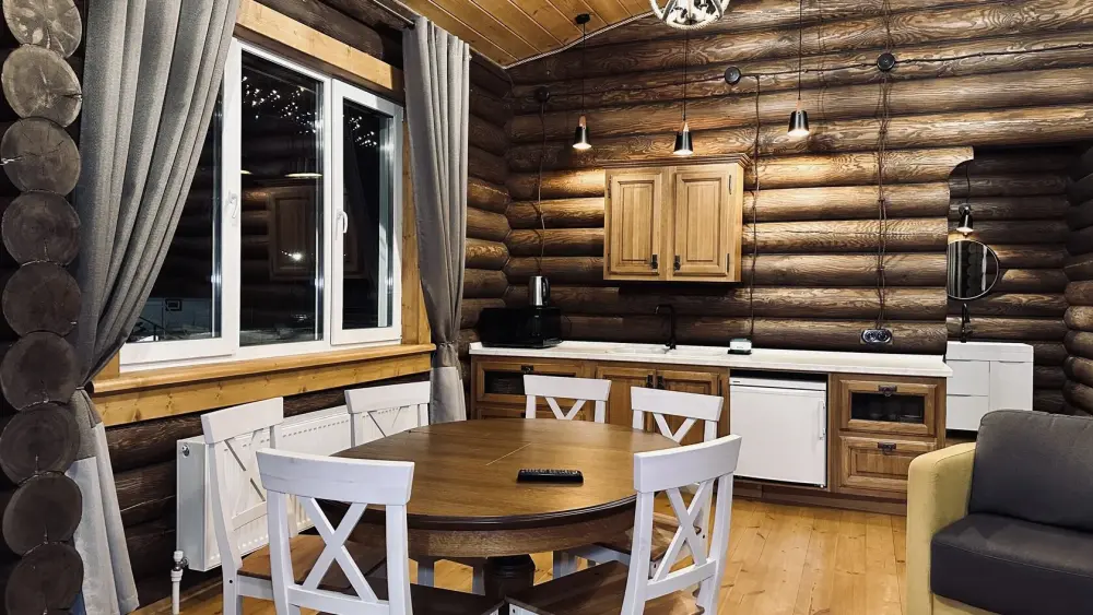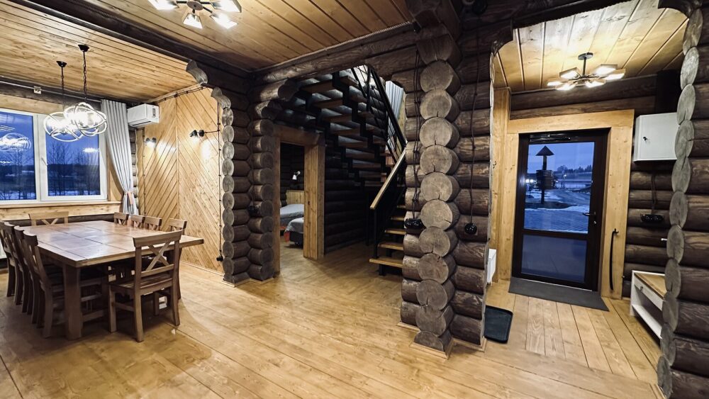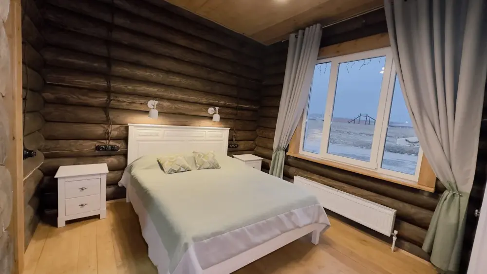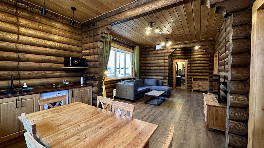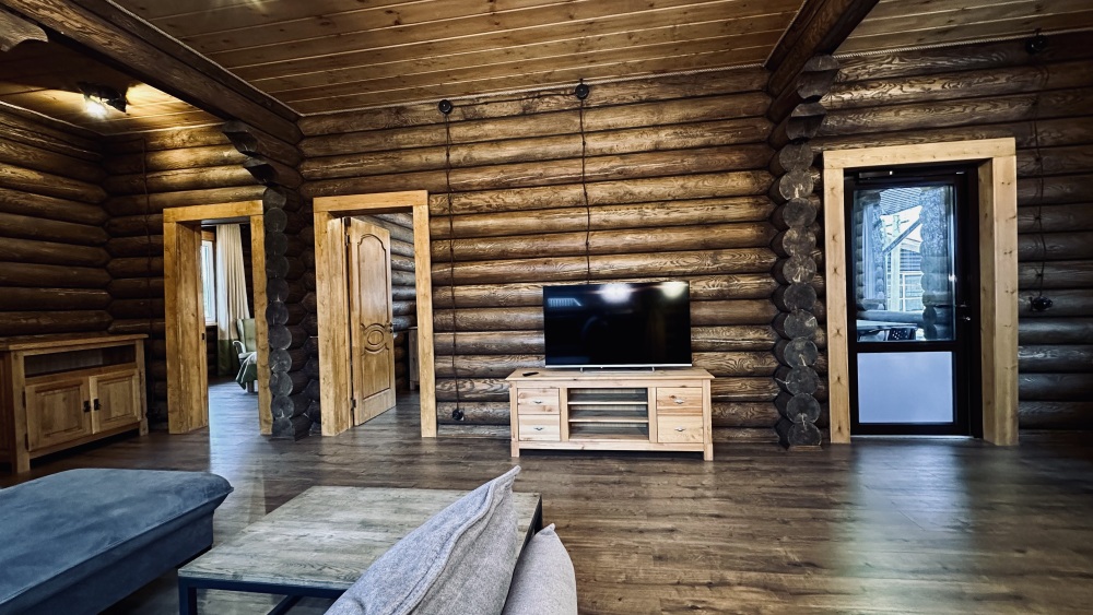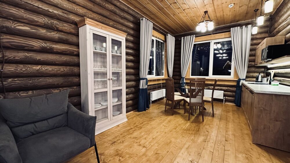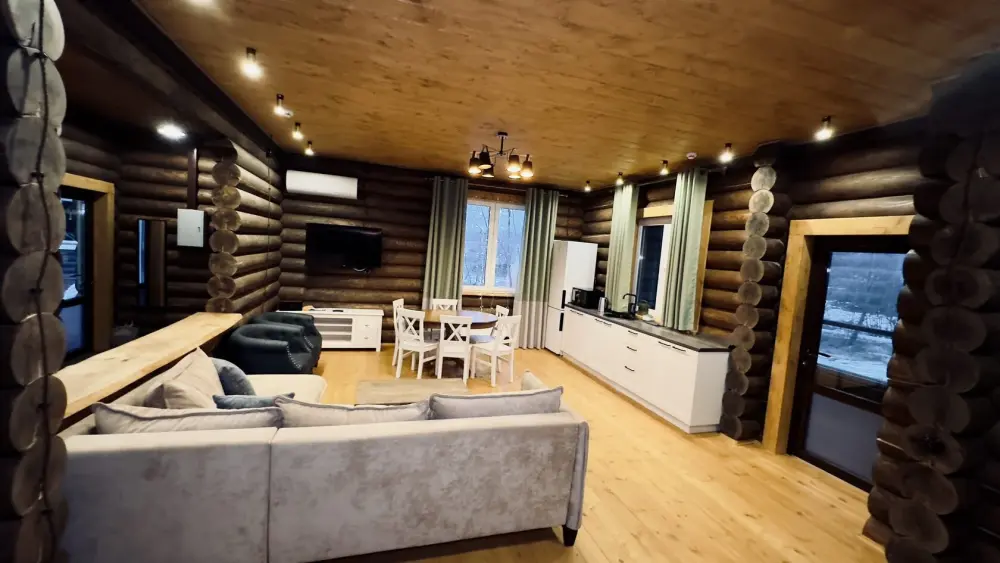 Просторный дом из сруба площадью 145 м² с камином — это идеальное место для семейного отдыха или уикенда с друзьями. Натуральное дерево создаёт особую атмосферу тепла и уюта, а камин в гостиной наполняет вечера загородным шармом. В доме две спальни: одна с двуспальной кроватью, другая — с двумя односпальными, а при необходимости в гостиной могут с комфортом разместиться ещё 2 гостя.