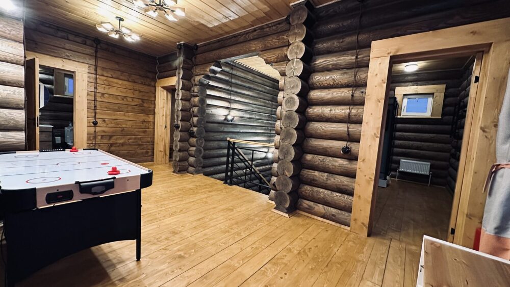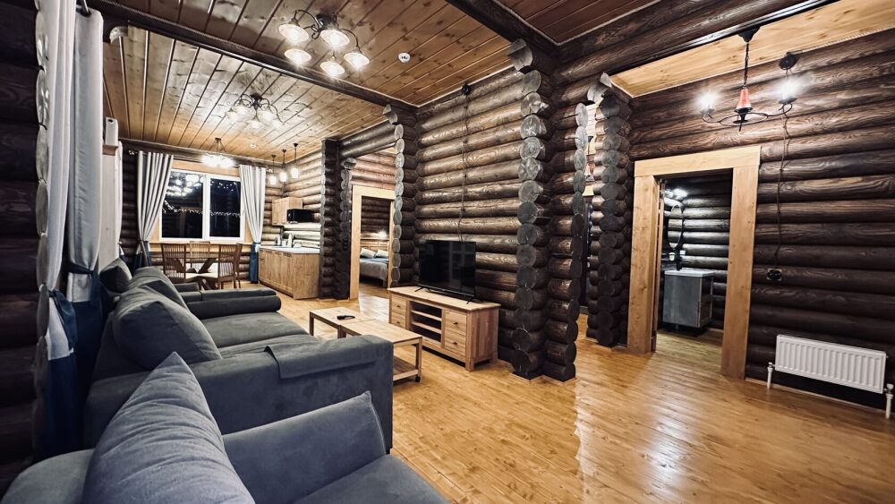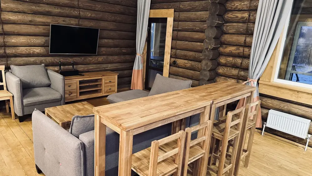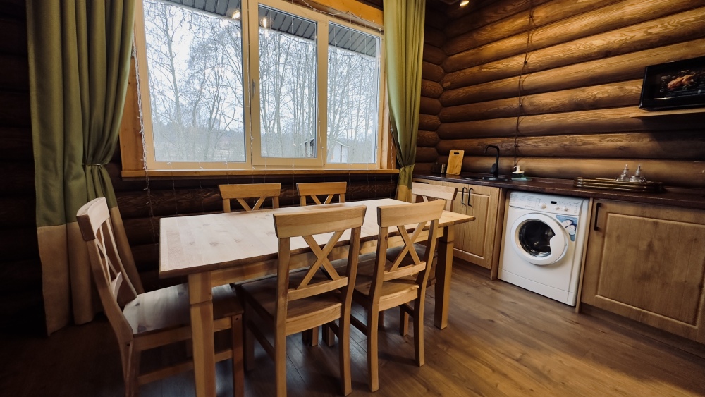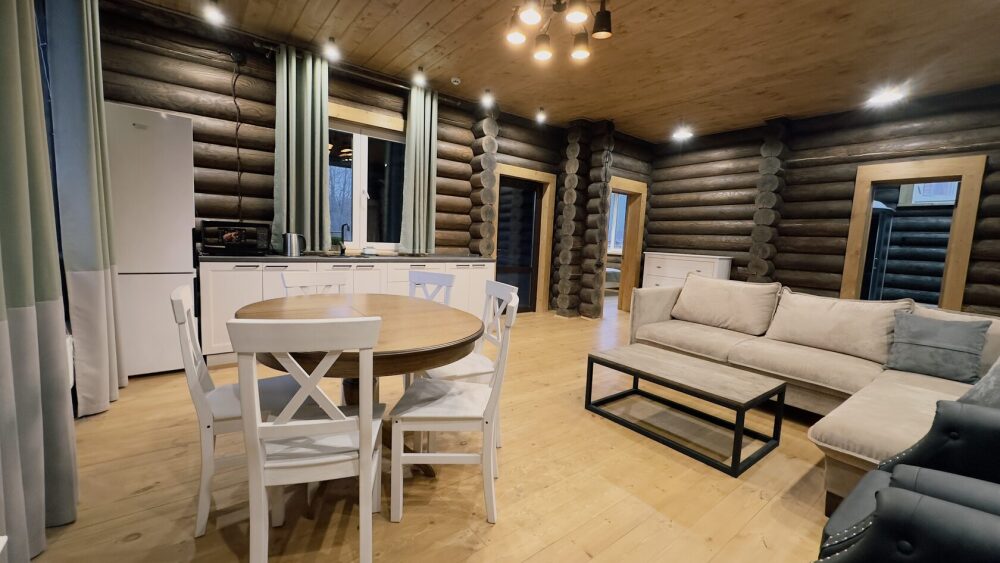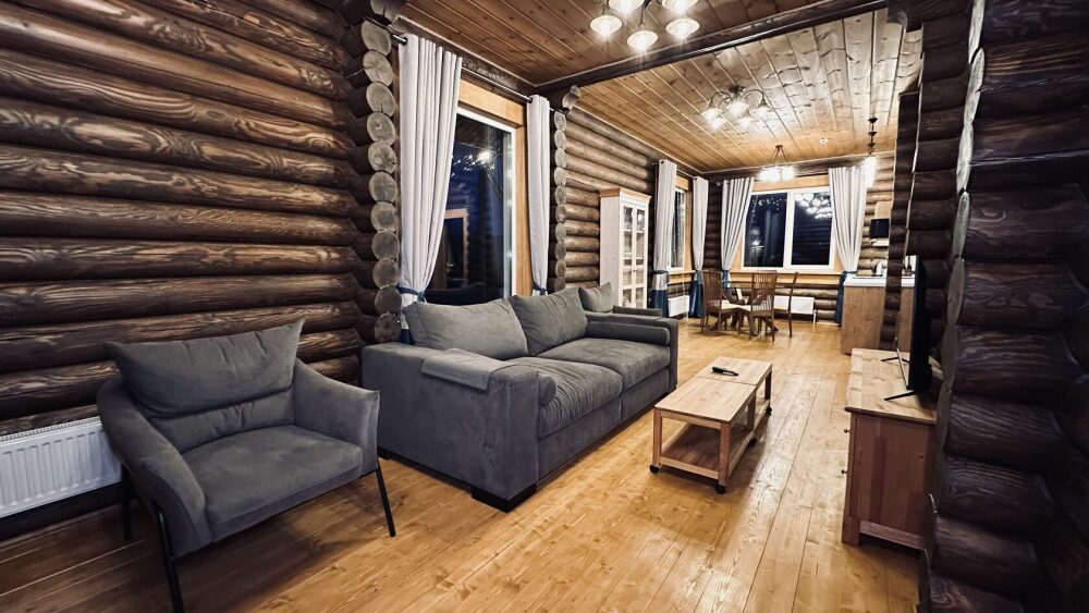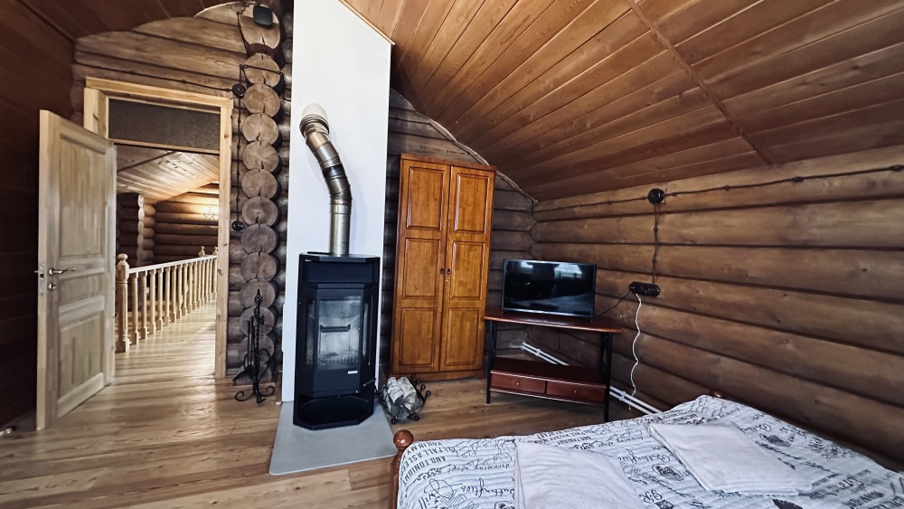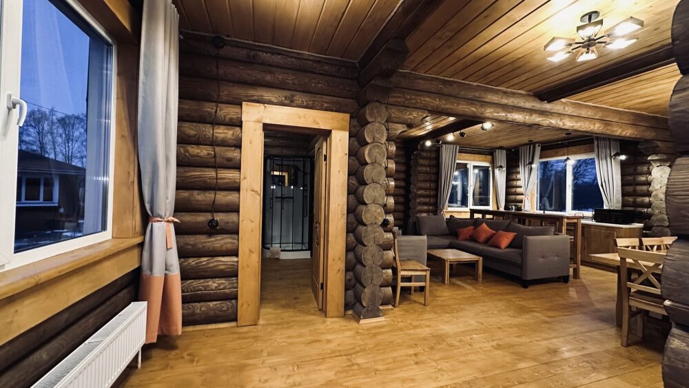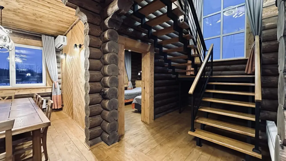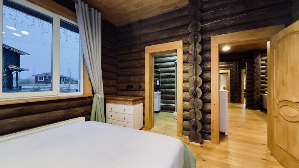 Просторный дом из сруба площадью 145 м² с камином — это идеальное место для семейного отдыха или уикенда с друзьями. Натуральное дерево создаёт особую атмосферу тепла и уюта, а камин в гостиной наполняет вечера загородным шармом. В доме две спальни: одна с двуспальной кроватью, другая — с двумя односпальными, а при необходимости в гостиной могут с комфортом разместиться ещё 2 гостя.