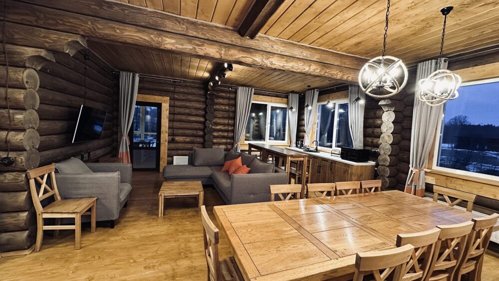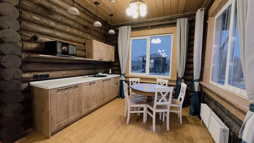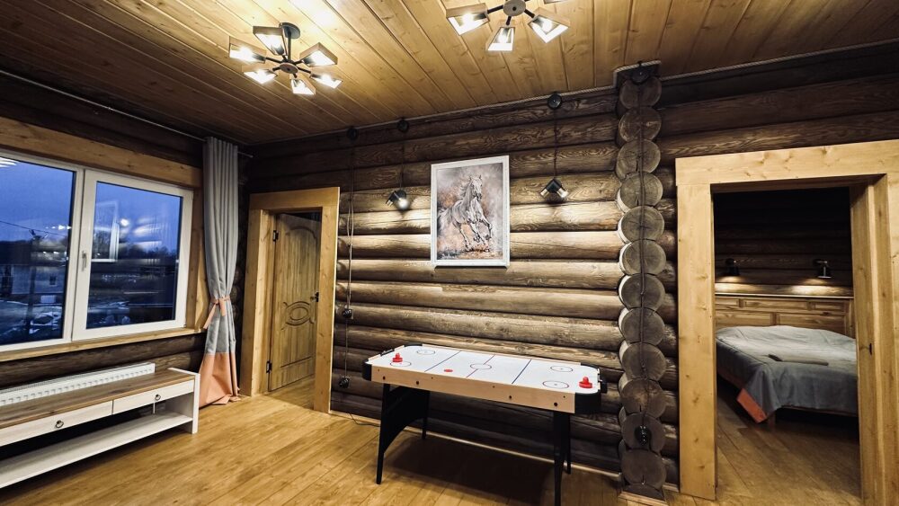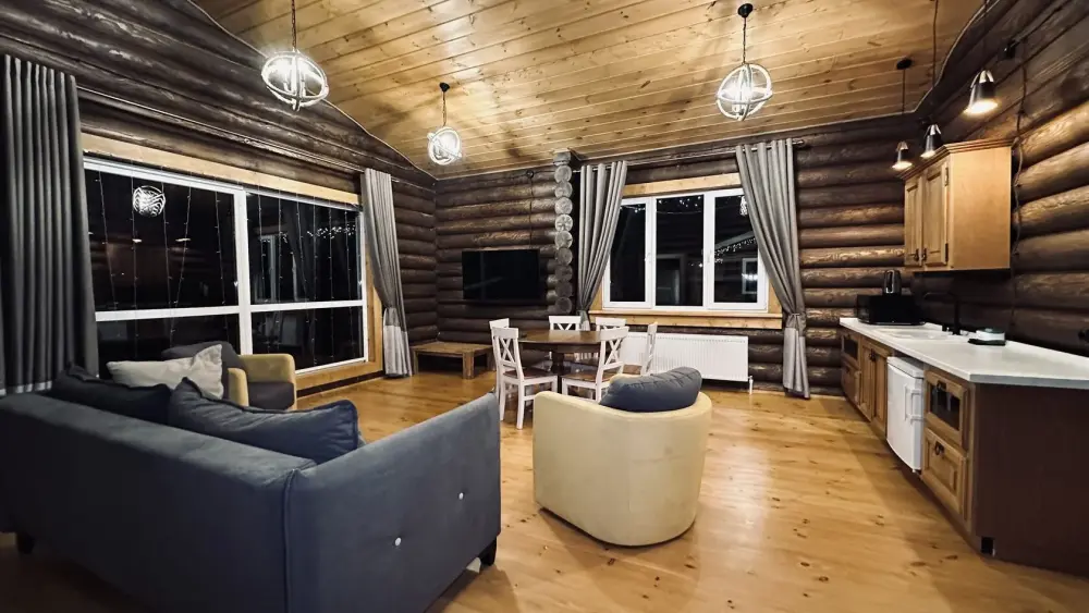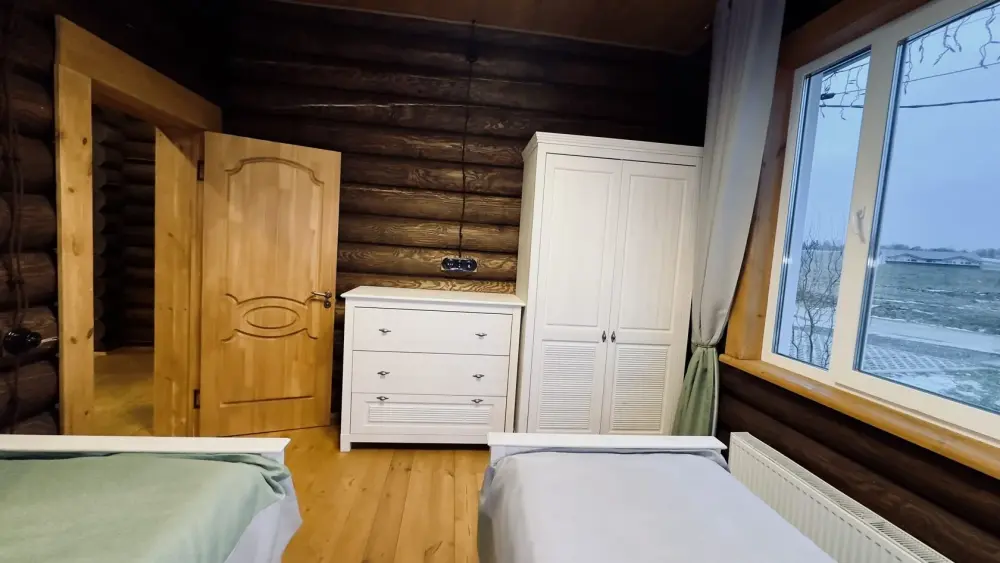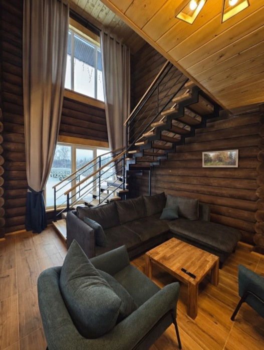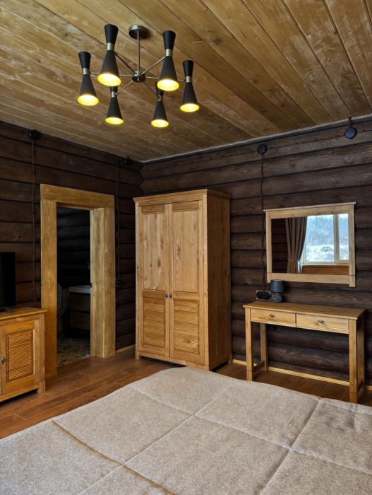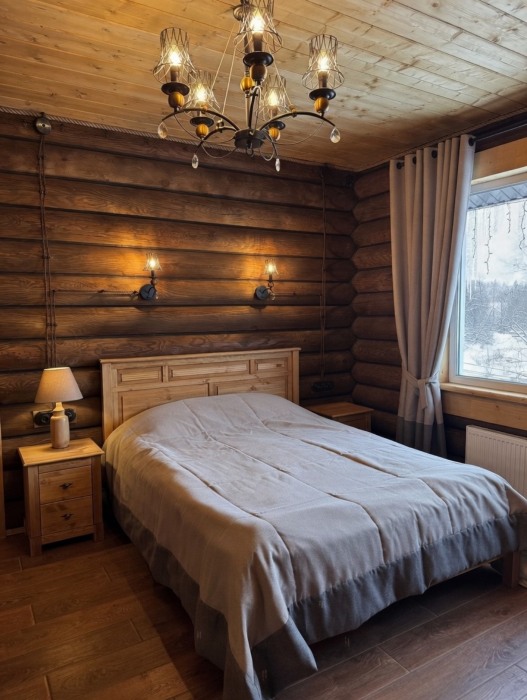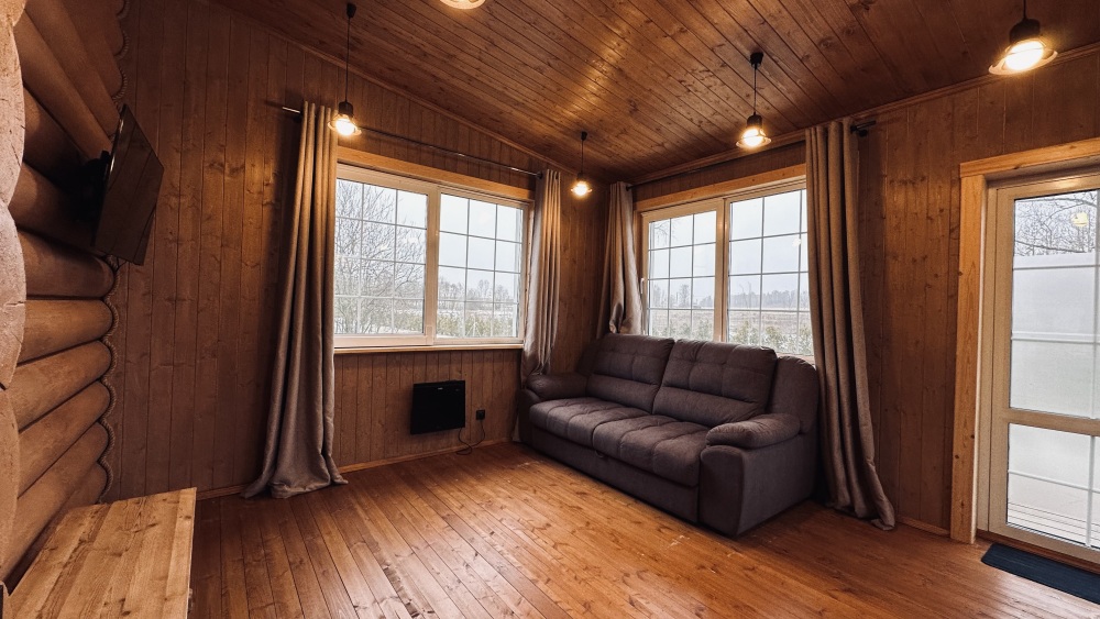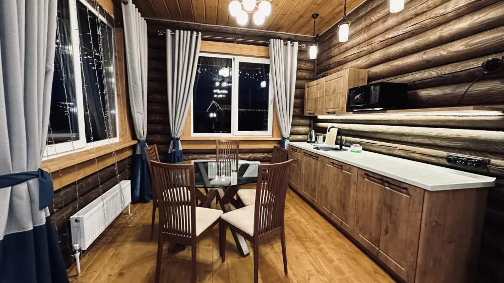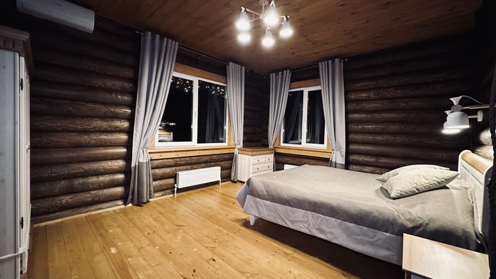 Просторный дом из сруба площадью 145 м² с камином — это идеальное место для семейного отдыха или уикенда с друзьями. Натуральное дерево создаёт особую атмосферу тепла и уюта, а камин в гостиной наполняет вечера загородным шармом. В доме две спальни: одна с двуспальной кроватью, другая — с двумя односпальными, а при необходимости в гостиной могут с комфортом разместиться ещё 2 гостя.