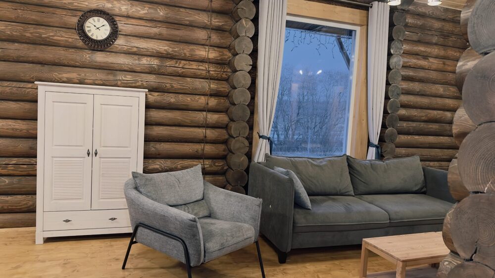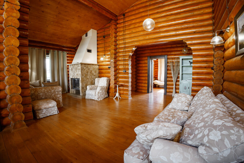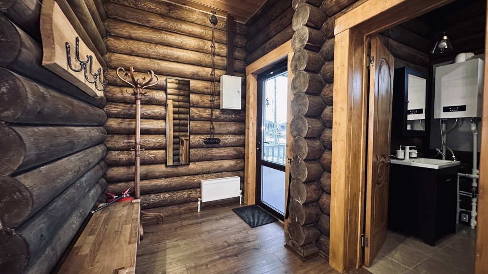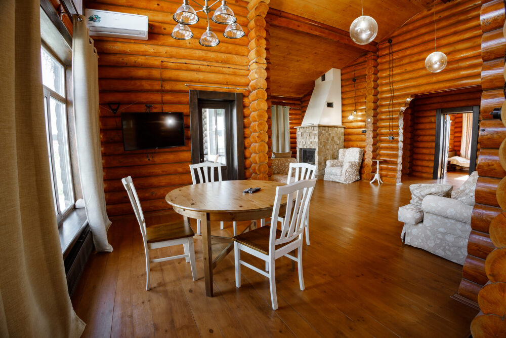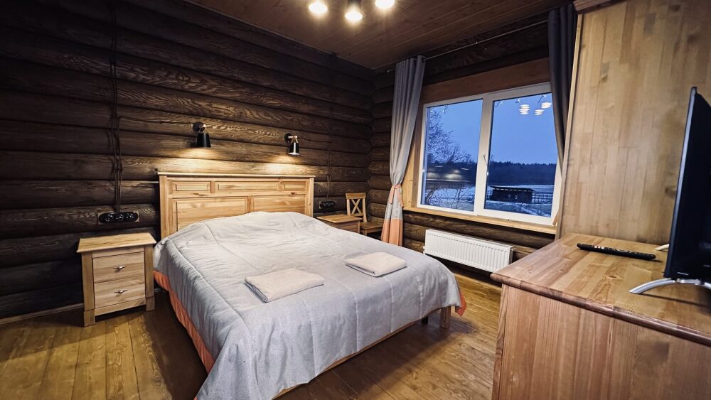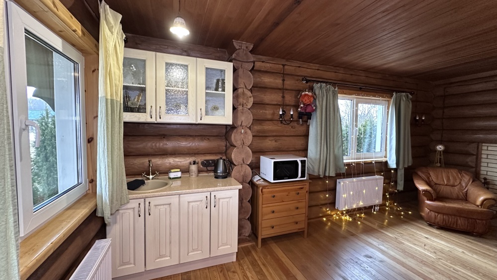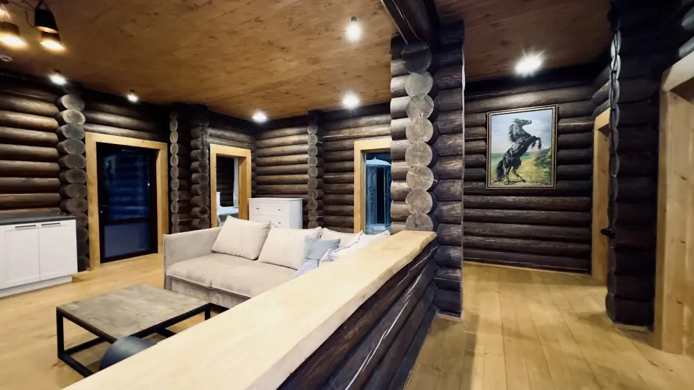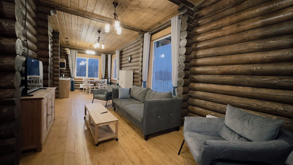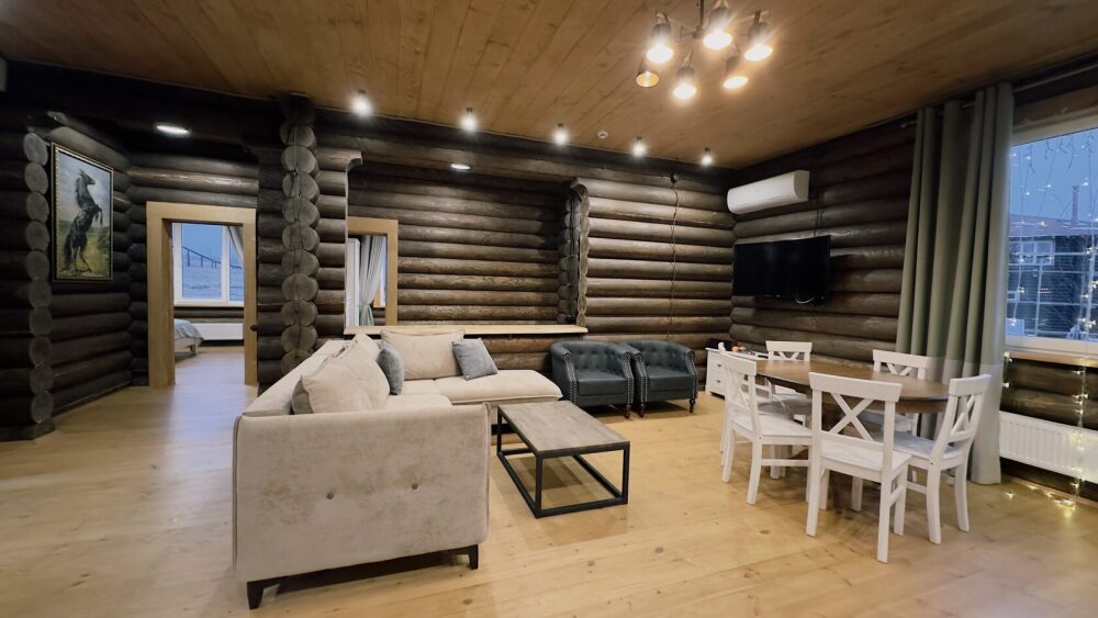 Просторный дом из сруба площадью 145 м² с камином — это идеальное место для семейного отдыха или уикенда с друзьями. Натуральное дерево создаёт особую атмосферу тепла и уюта, а камин в гостиной наполняет вечера загородным шармом. В доме две спальни: одна с двуспальной кроватью, другая — с двумя односпальными, а при необходимости в гостиной могут с комфортом разместиться ещё 2 гостя.