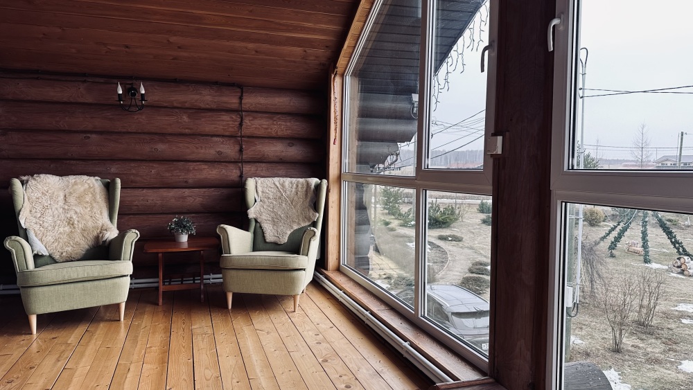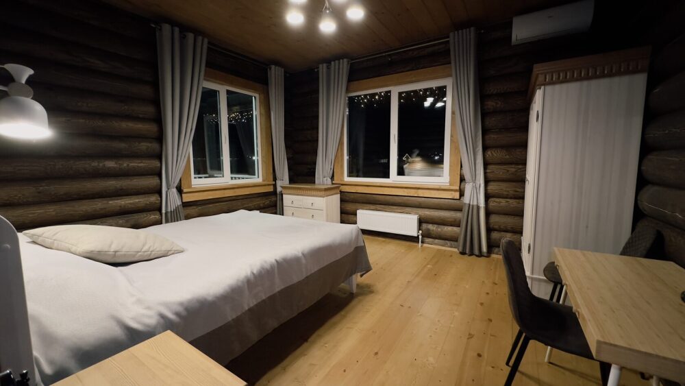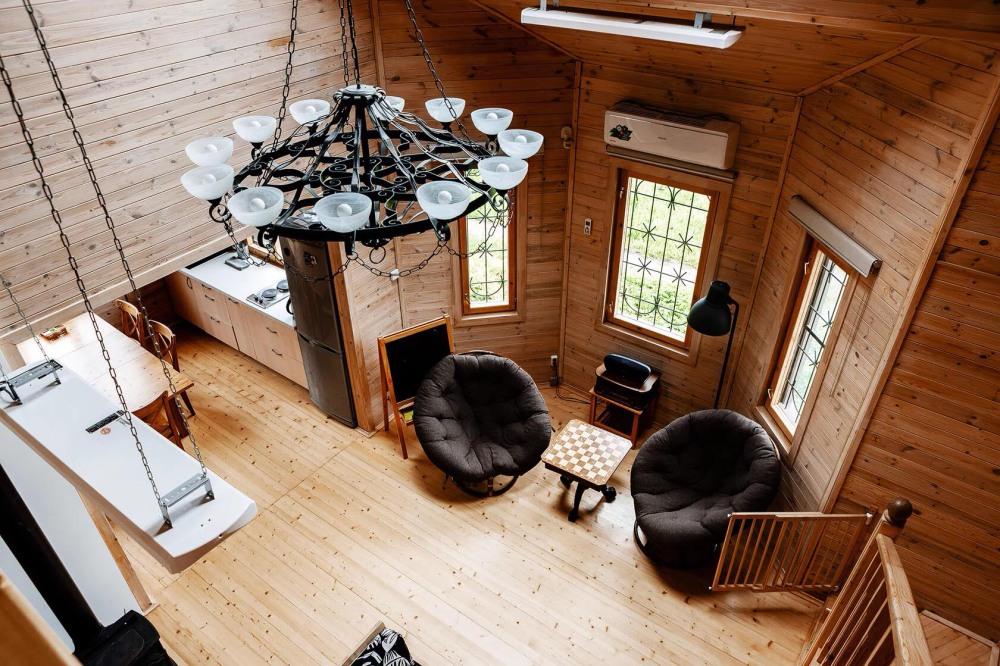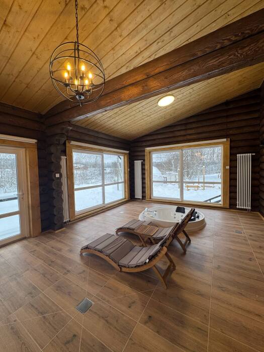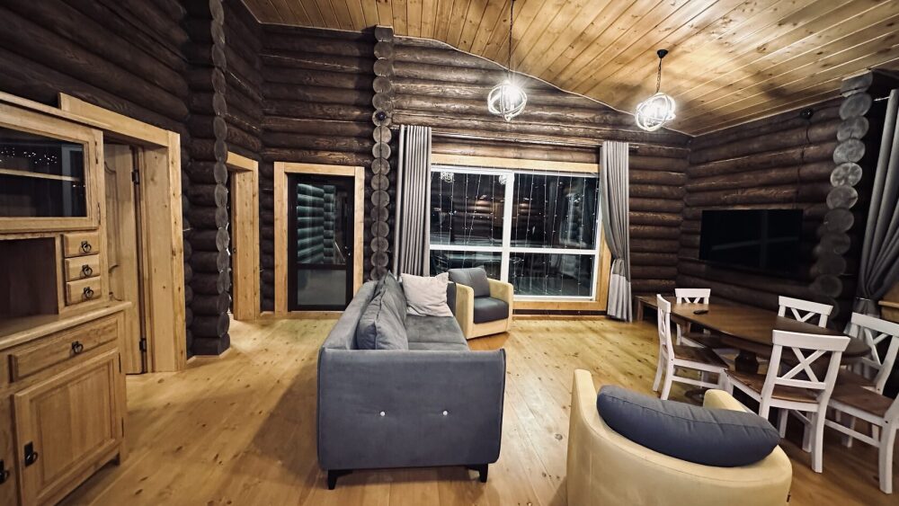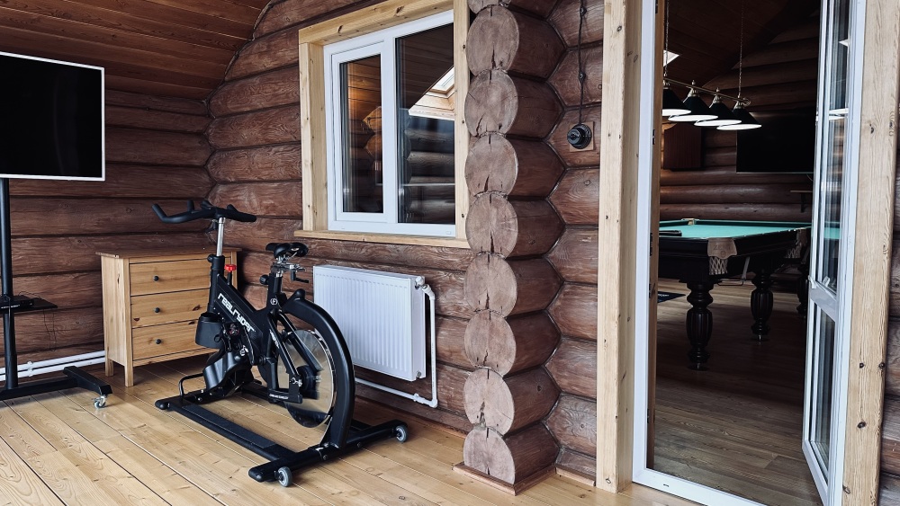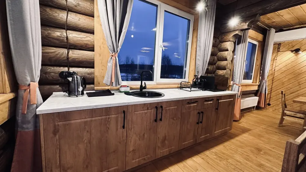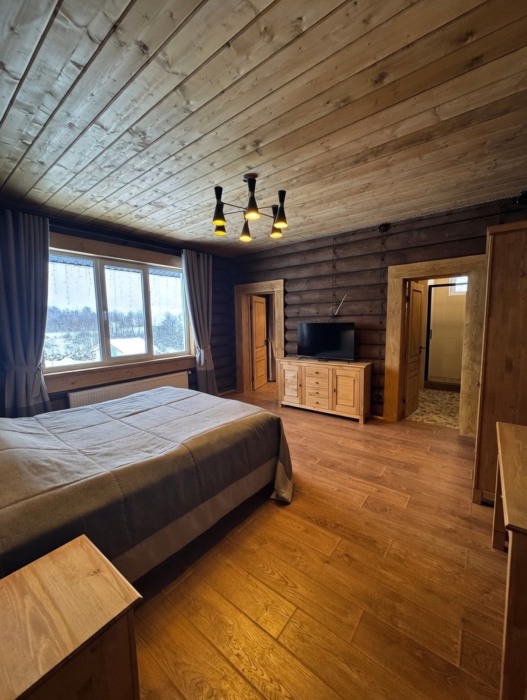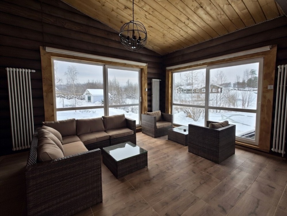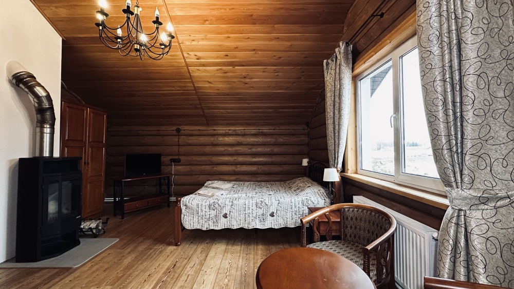 Просторный дом из сруба площадью 145 м² с камином — это идеальное место для семейного отдыха или уикенда с друзьями. Натуральное дерево создаёт особую атмосферу тепла и уюта, а камин в гостиной наполняет вечера загородным шармом. В доме две спальни: одна с двуспальной кроватью, другая — с двумя односпальными, а при необходимости в гостиной могут с комфортом разместиться ещё 2 гостя.