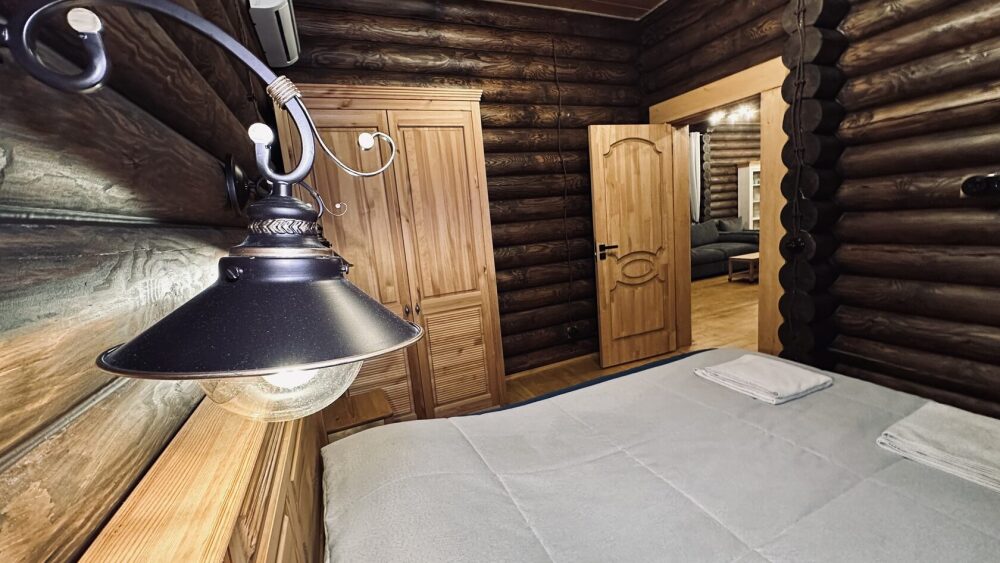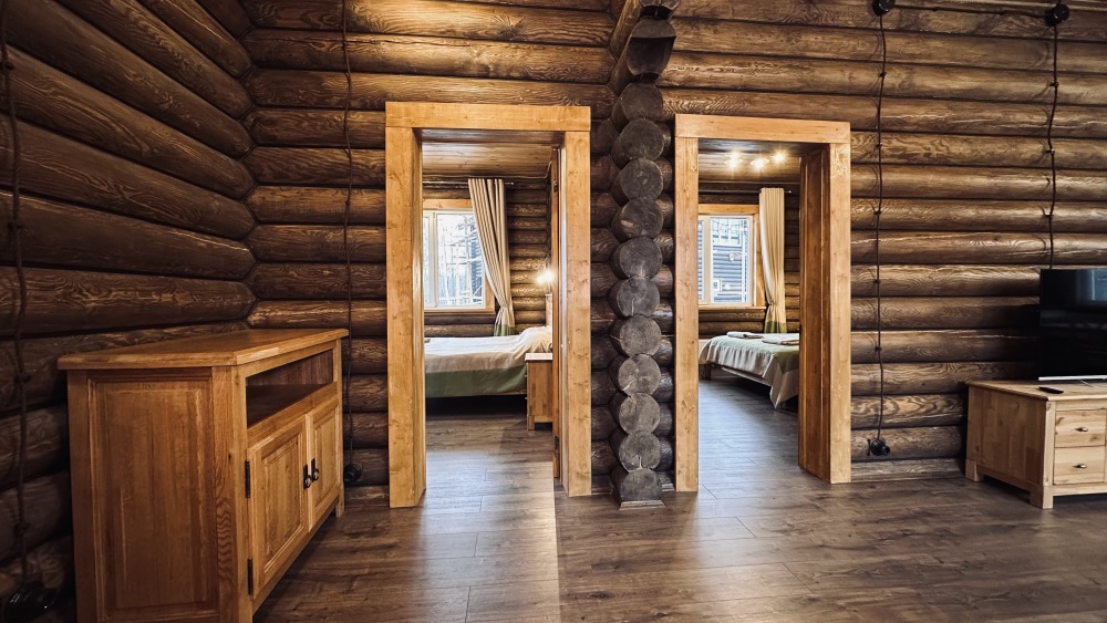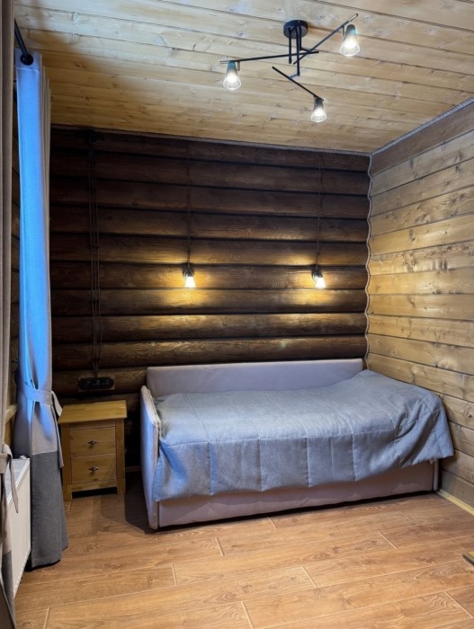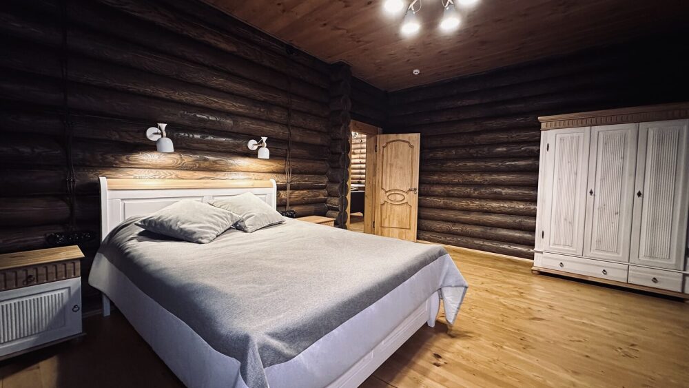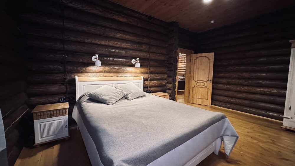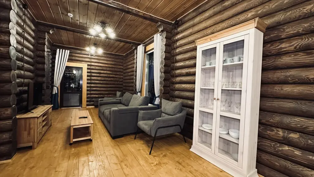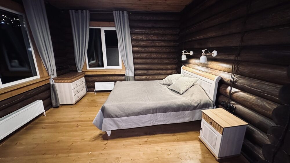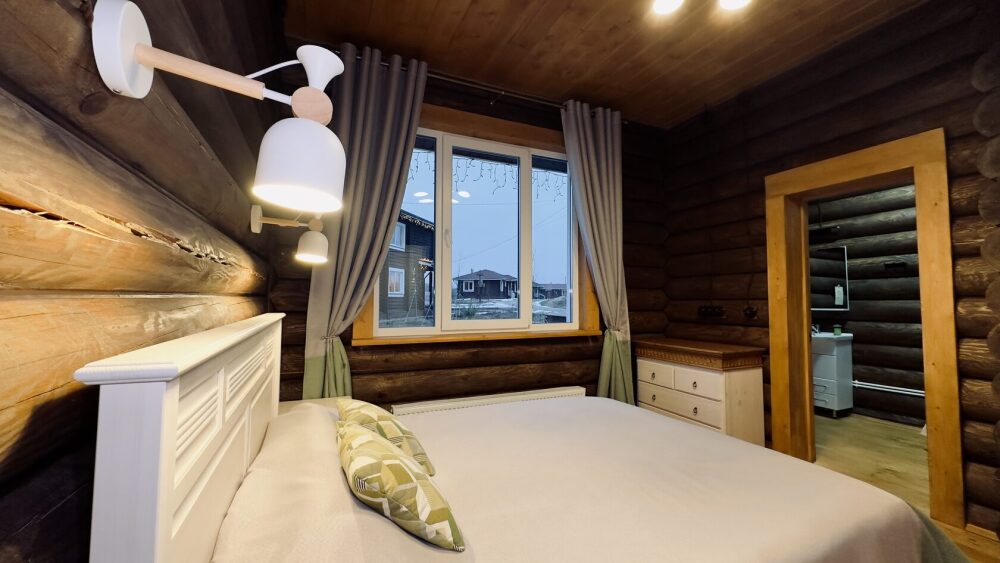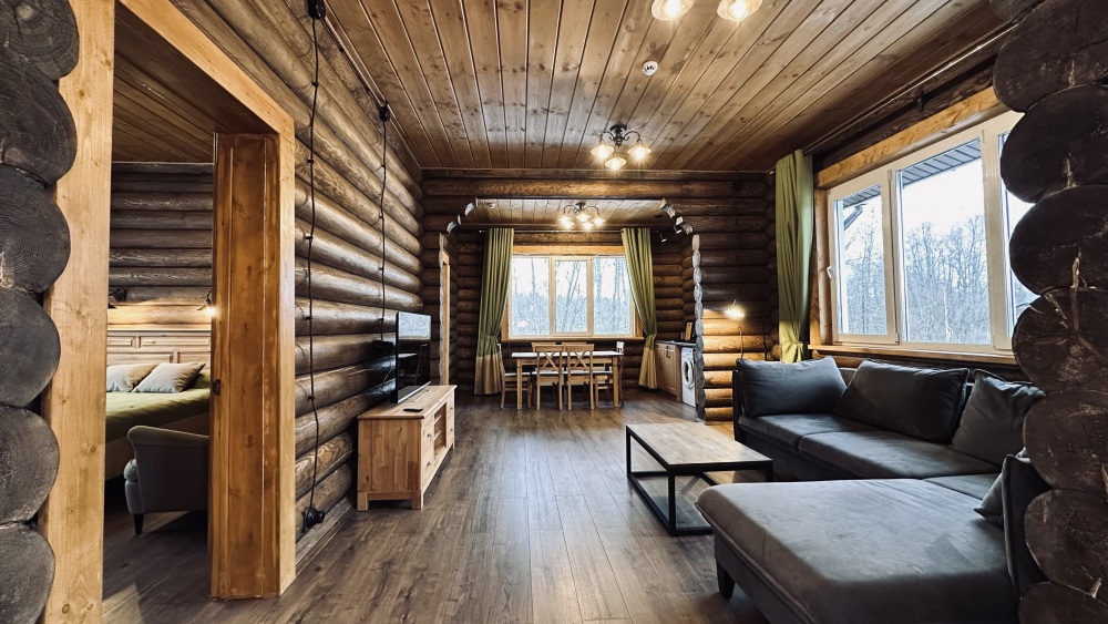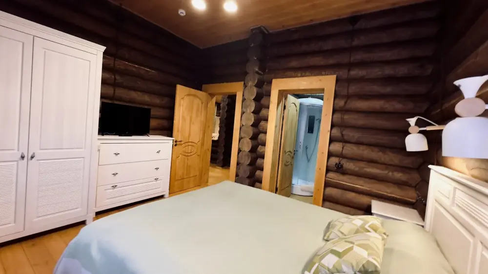 Уютный дом из сруба площадью 105 м² идеально подойдёт для отдыха двумя семьями или небольшой компанией. Натуральное дерево наполняет дом особым теплом, а продуманная планировка делает пребывание максимально комфортным. В доме две изолированные спальни с двуспальными кроватями, каждая со своим отдельным санузлом и душевой кабиной, что особенно удобно для гостей. В просторной гостиной расположен раскладной двуспальный диван, позволяющий разместить до 6 человек.