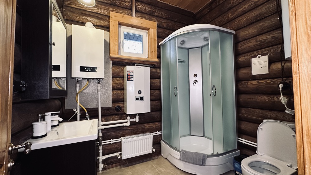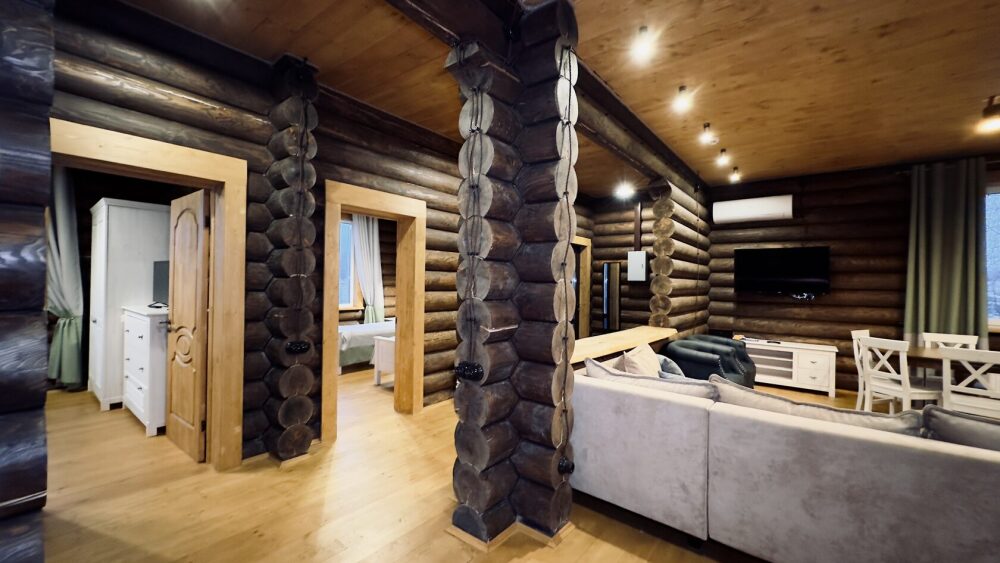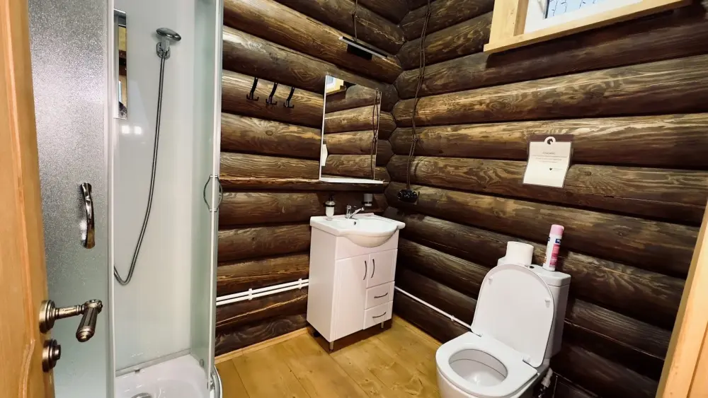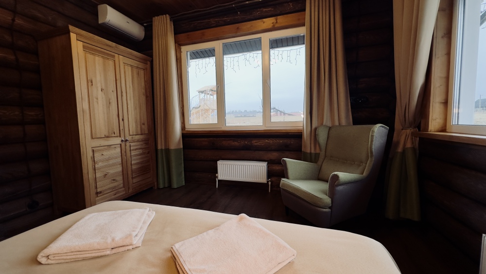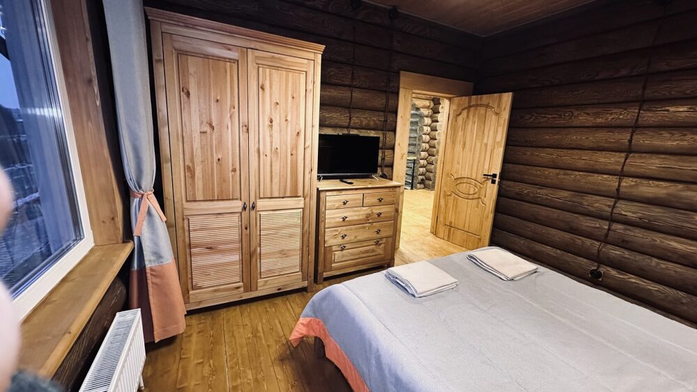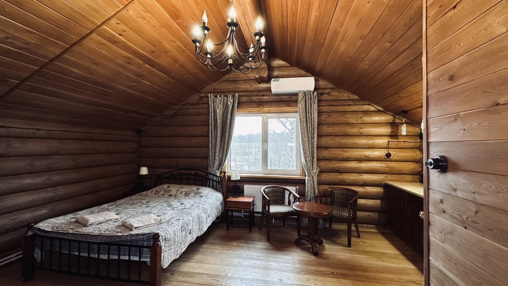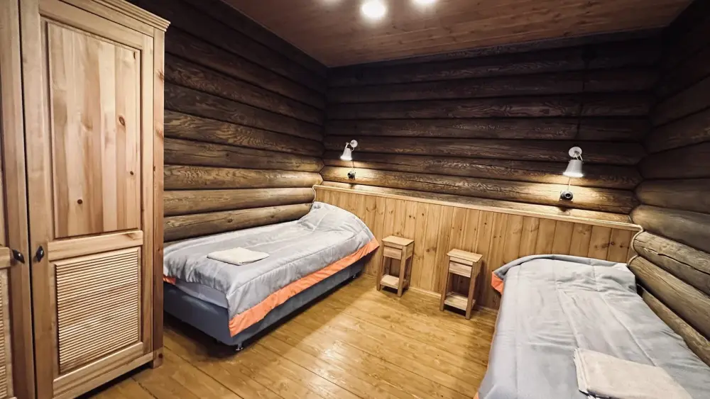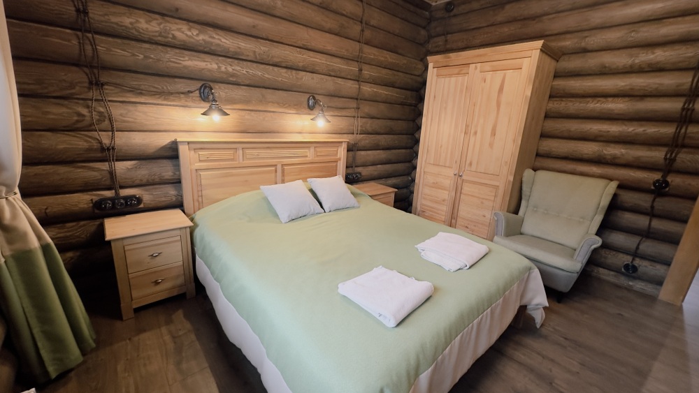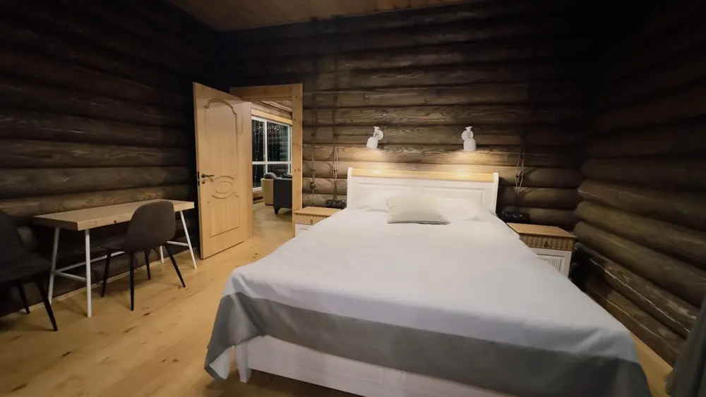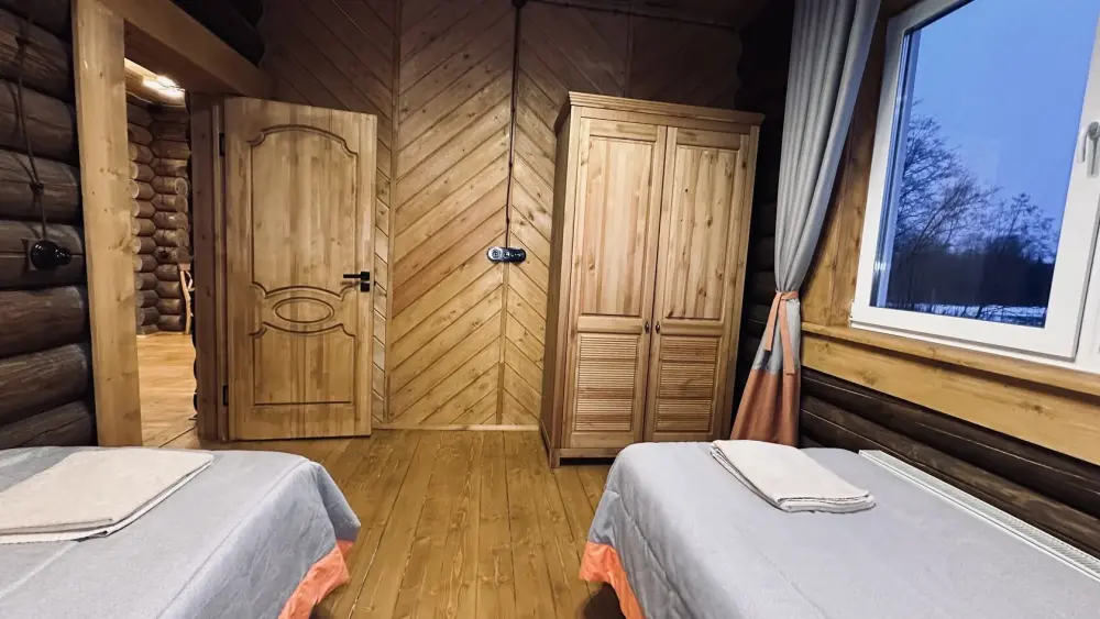 Уютный дом из сруба площадью 105 м² идеально подойдёт для отдыха двумя семьями или небольшой компанией. Натуральное дерево наполняет дом особым теплом, а продуманная планировка делает пребывание максимально комфортным. В доме две изолированные спальни с двуспальными кроватями, каждая со своим отдельным санузлом и душевой кабиной, что особенно удобно для гостей. В просторной гостиной расположен раскладной двуспальный диван, позволяющий разместить до 6 человек.