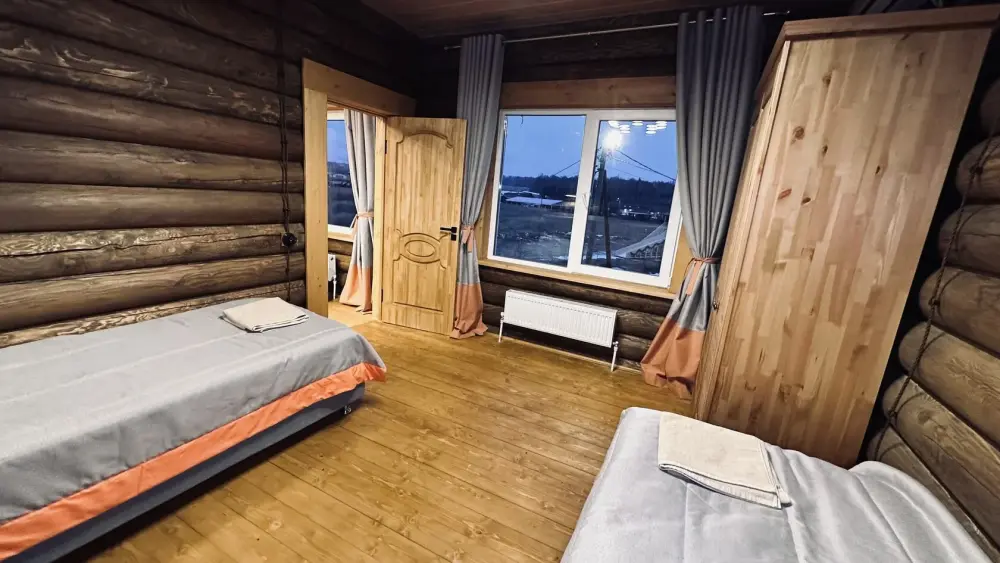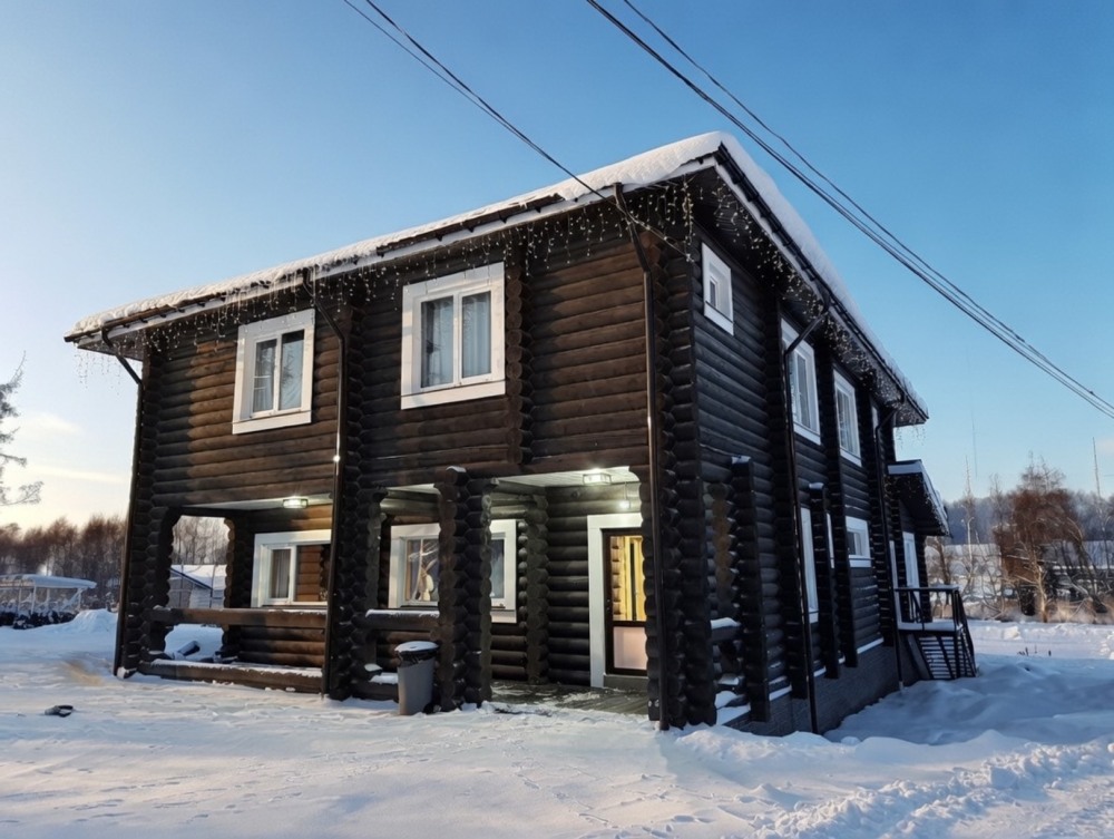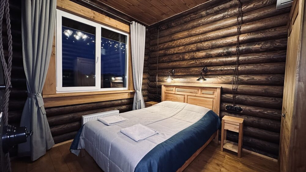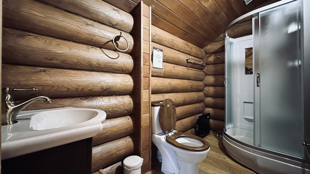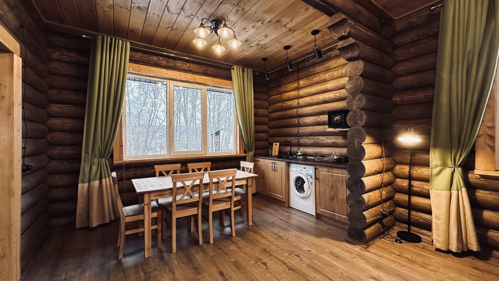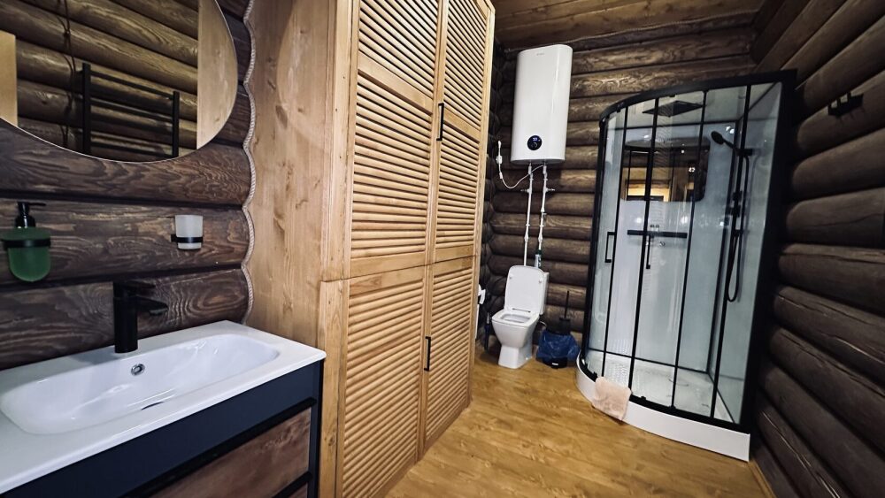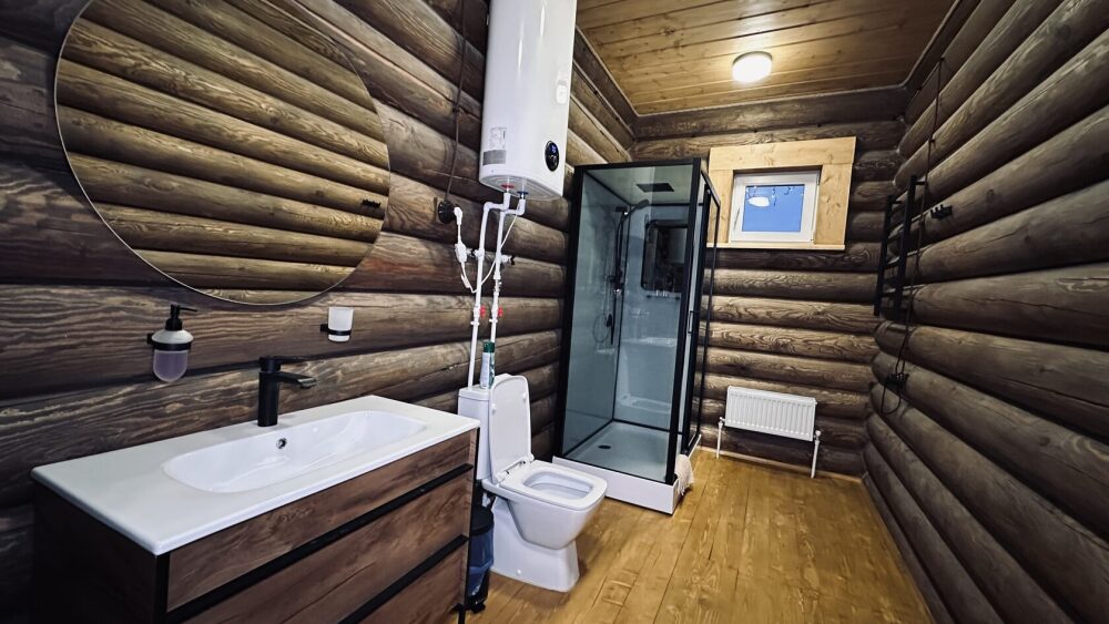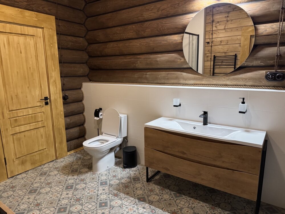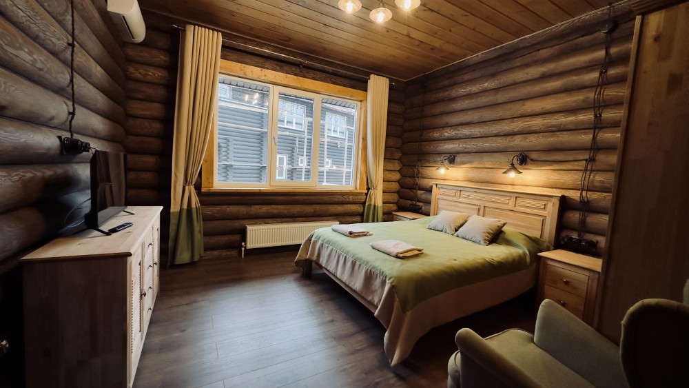 Уютный дом из сруба площадью 105 м² идеально подойдёт для отдыха двумя семьями или небольшой компанией. Натуральное дерево наполняет дом особым теплом, а продуманная планировка делает пребывание максимально комфортным. В доме две изолированные спальни с двуспальными кроватями, каждая со своим отдельным санузлом и душевой кабиной, что особенно удобно для гостей. В просторной гостиной расположен раскладной двуспальный диван, позволяющий разместить до 6 человек.
