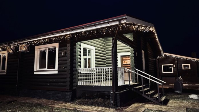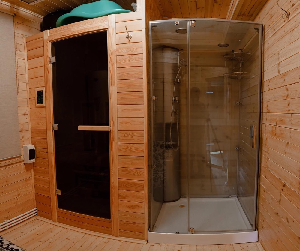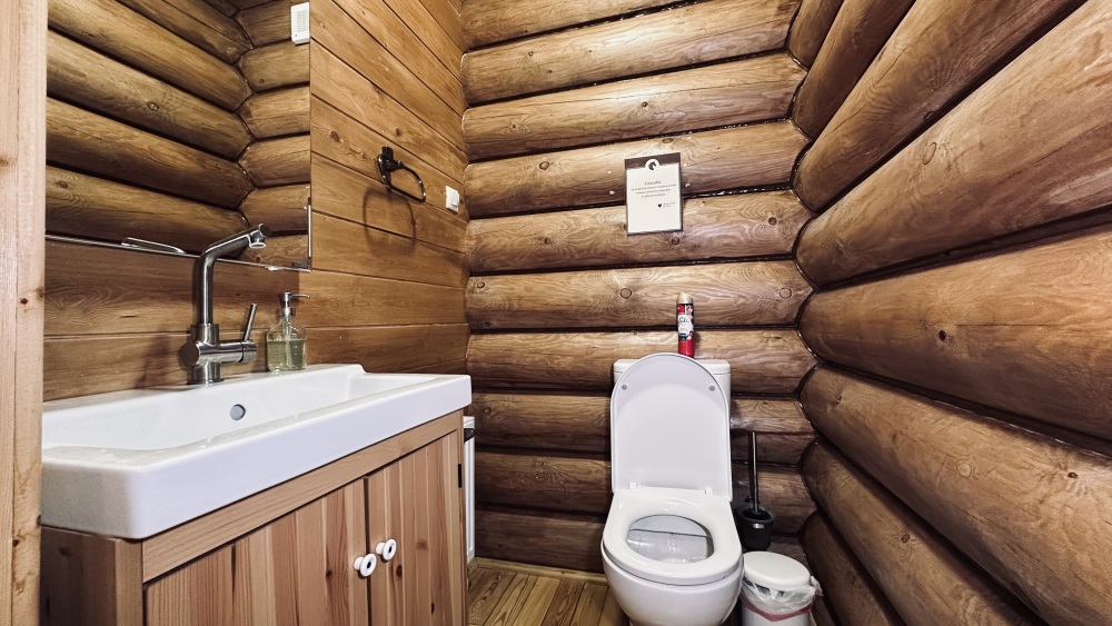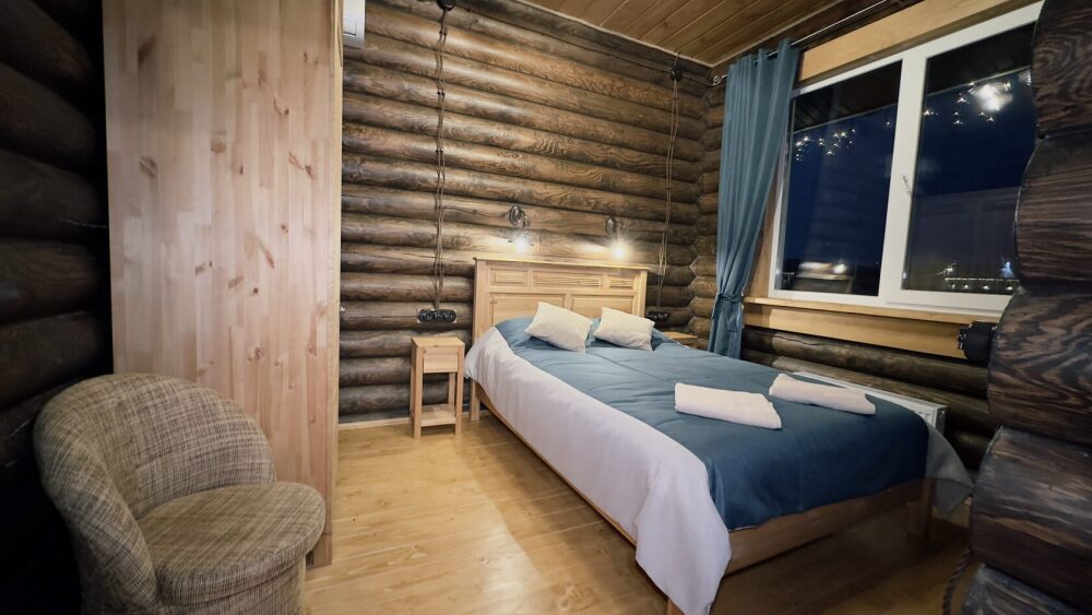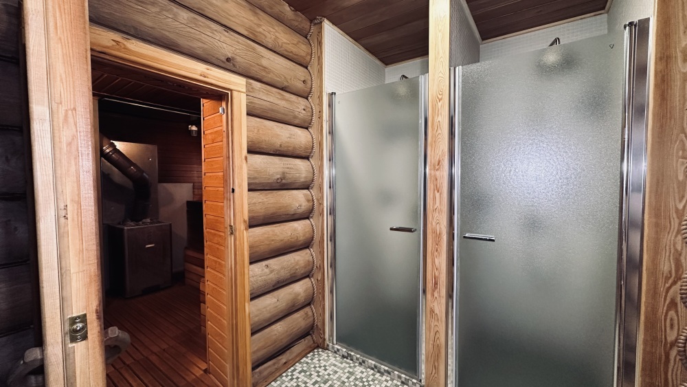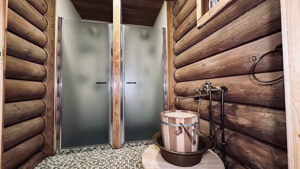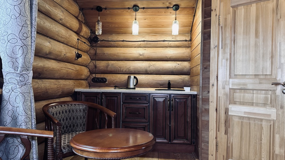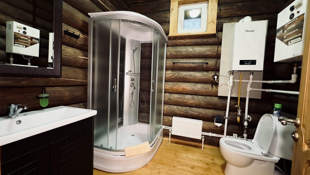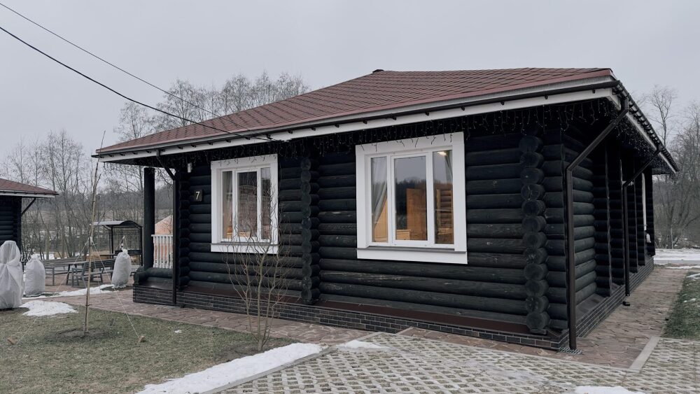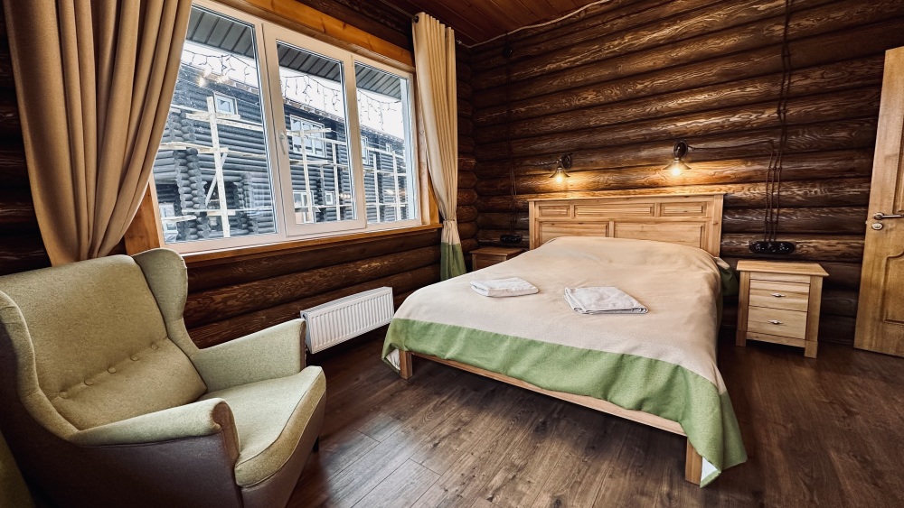 Уютный дом из сруба площадью 105 м² идеально подойдёт для отдыха двумя семьями или небольшой компанией. Натуральное дерево наполняет дом особым теплом, а продуманная планировка делает пребывание максимально комфортным. В доме две изолированные спальни с двуспальными кроватями, каждая со своим отдельным санузлом и душевой кабиной, что особенно удобно для гостей. В просторной гостиной расположен раскладной двуспальный диван, позволяющий разместить до 6 человек.