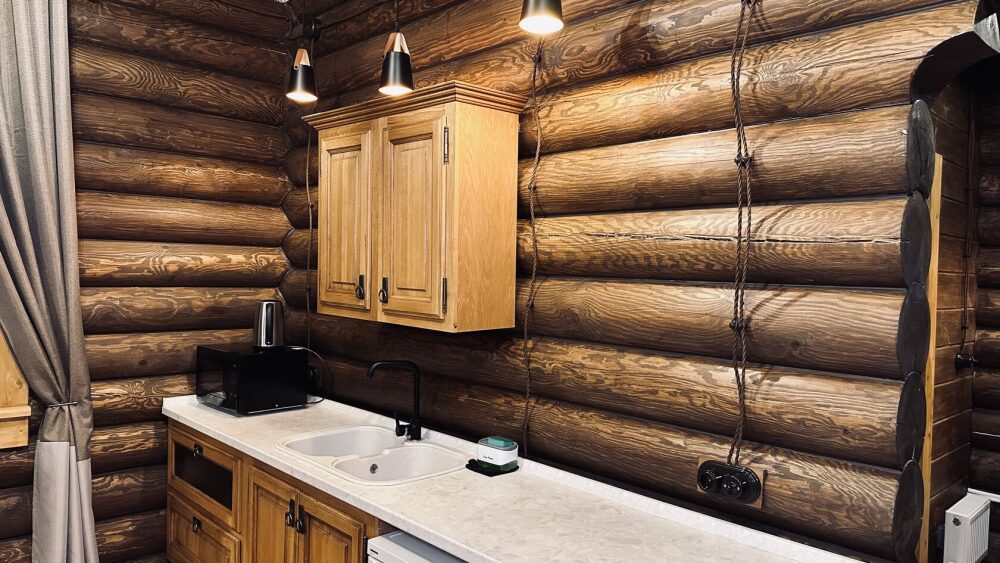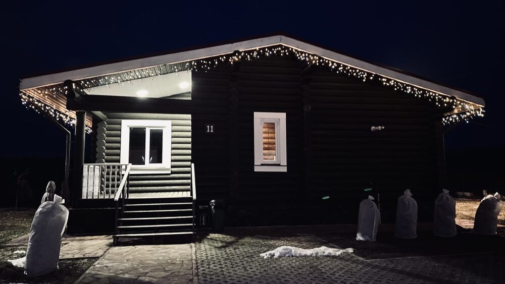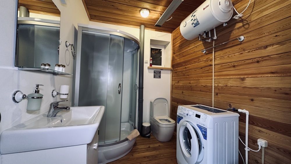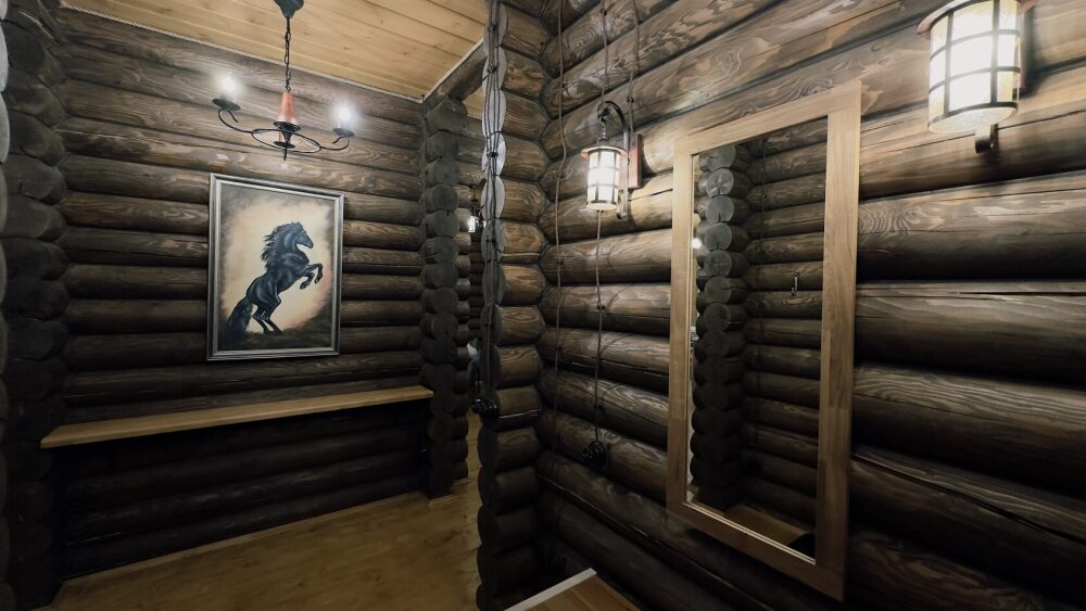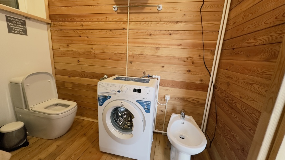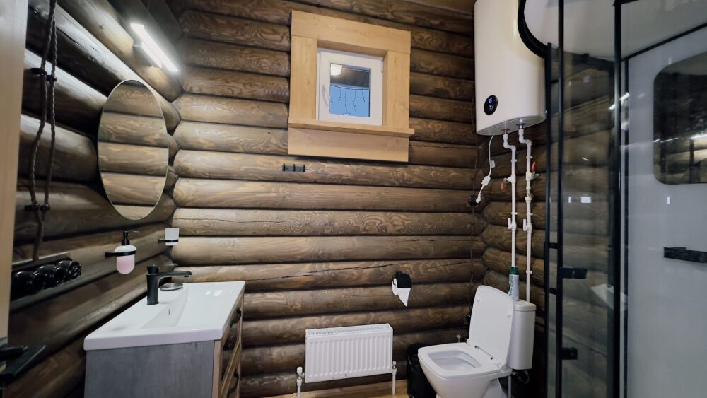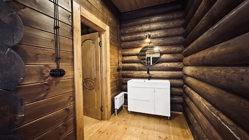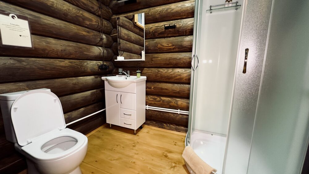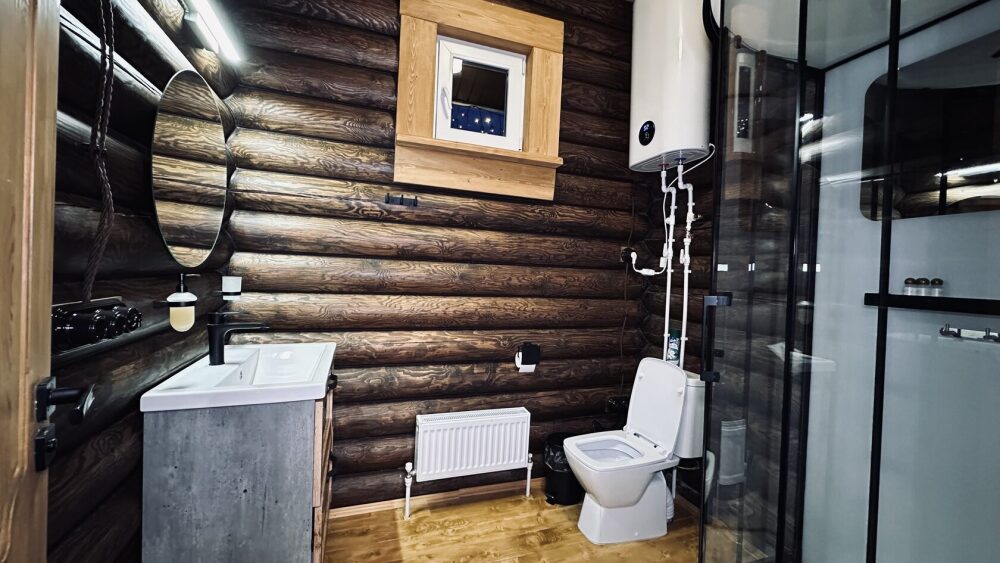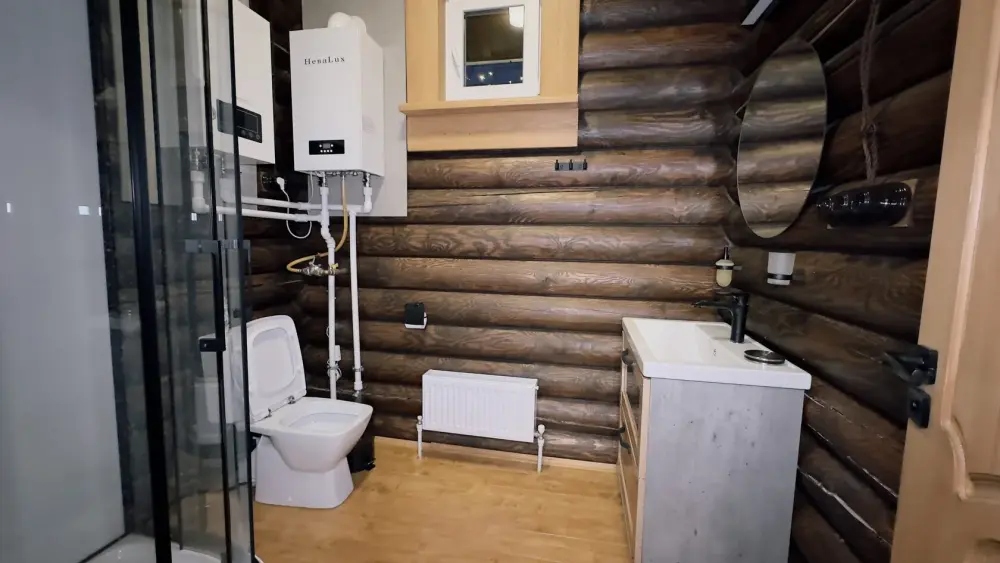 Уютный дом из сруба площадью 105 м² идеально подойдёт для отдыха двумя семьями или небольшой компанией. Натуральное дерево наполняет дом особым теплом, а продуманная планировка делает пребывание максимально комфортным. В доме две изолированные спальни с двуспальными кроватями, каждая со своим отдельным санузлом и душевой кабиной, что особенно удобно для гостей. В просторной гостиной расположен раскладной двуспальный диван, позволяющий разместить до 6 человек.
