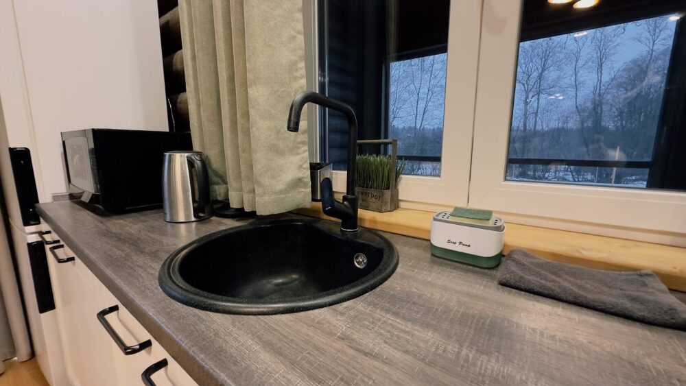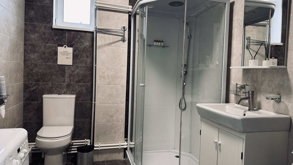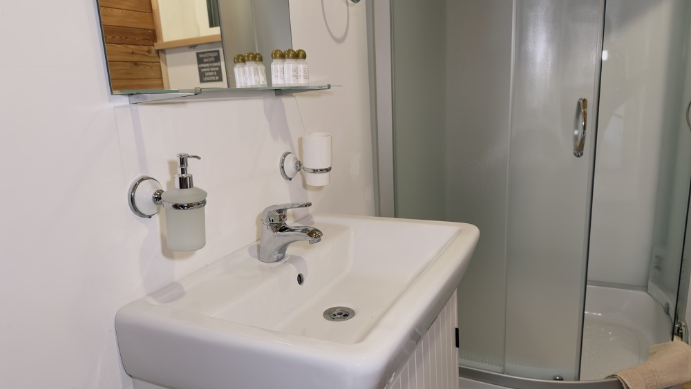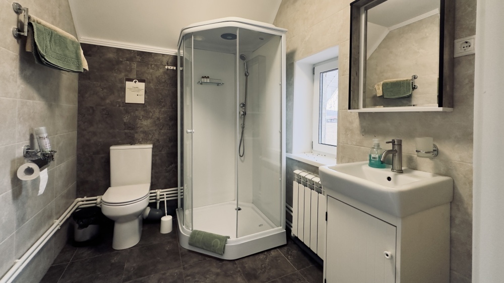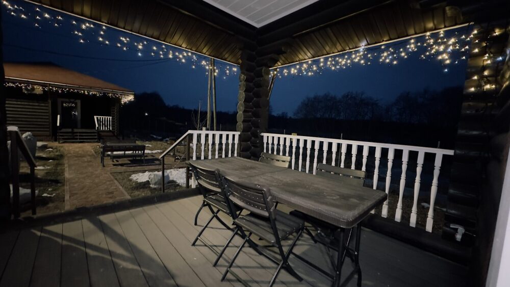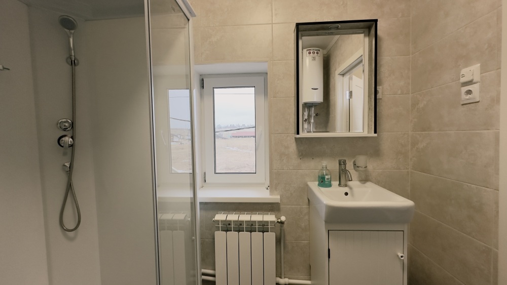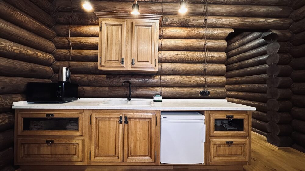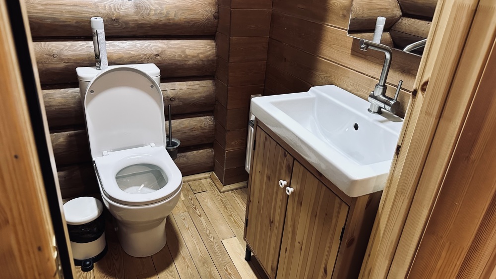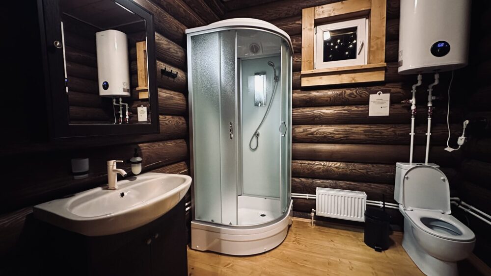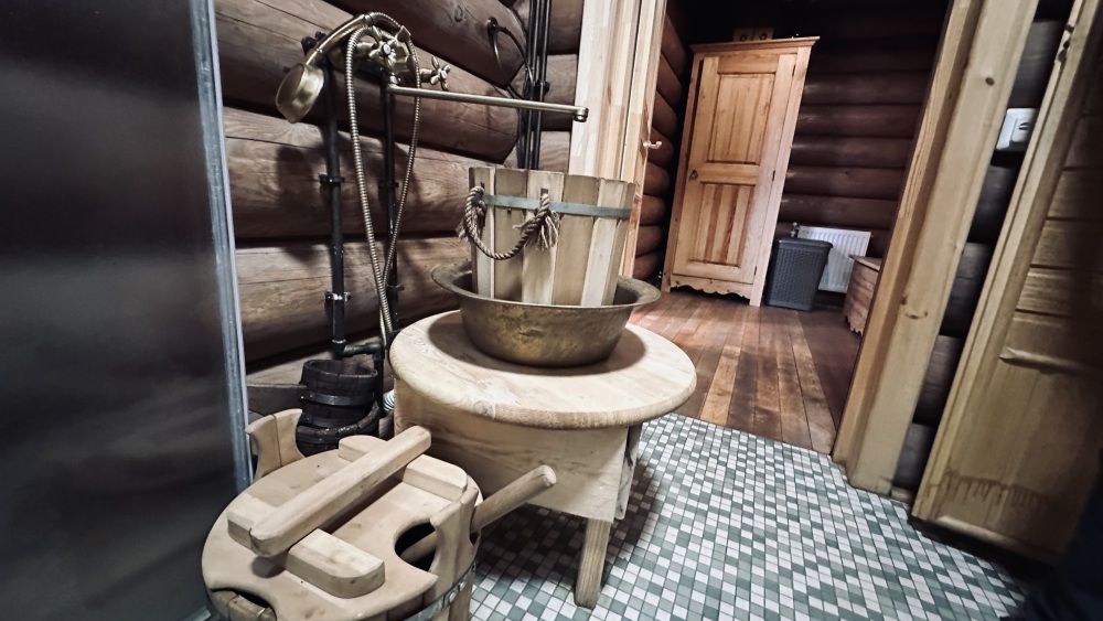 Уютный дом из сруба площадью 105 м² идеально подойдёт для отдыха двумя семьями или небольшой компанией. Натуральное дерево наполняет дом особым теплом, а продуманная планировка делает пребывание максимально комфортным. В доме две изолированные спальни с двуспальными кроватями, каждая со своим отдельным санузлом и душевой кабиной, что особенно удобно для гостей. В просторной гостиной расположен раскладной двуспальный диван, позволяющий разместить до 6 человек.