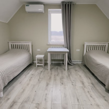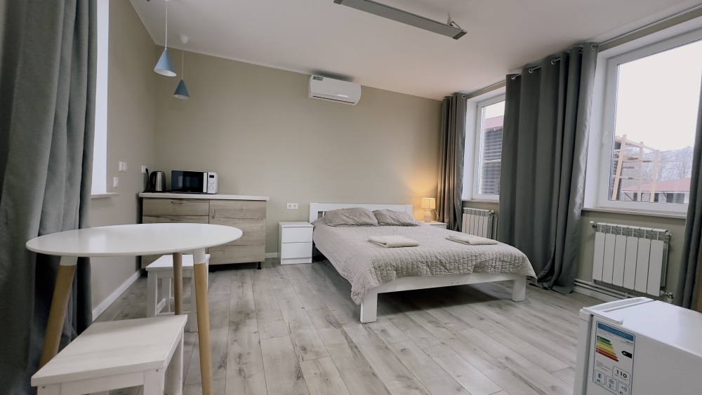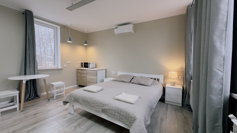 Уютные светлые апартаменты 30 м² с отдельным входом на втором этаже — отличный вариант для двух гостей. Комната с двумя полуторными кроватями, TV и кондиционером. Кухонный уголок с техникой и посудой, санузел с душем и стиральной машиной. Включены Wi-Fi, постельное бельё и полотенца. Парковка рядом с домом.