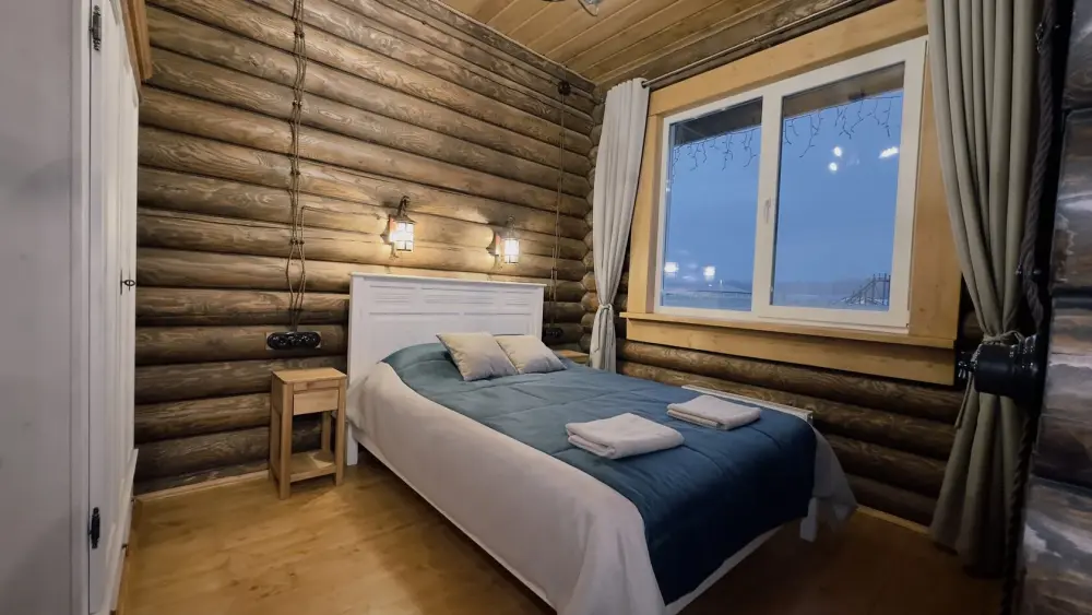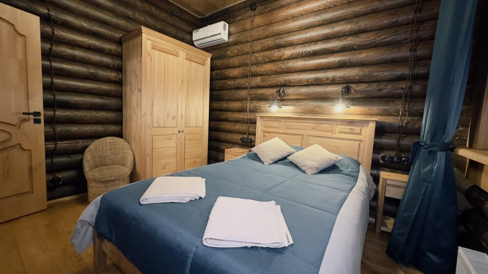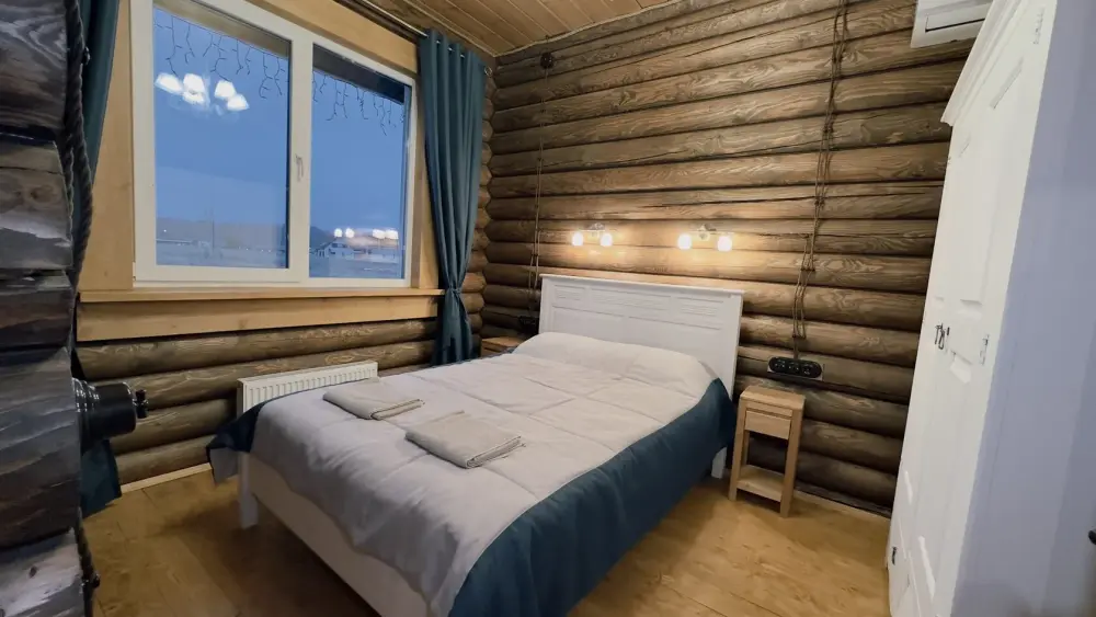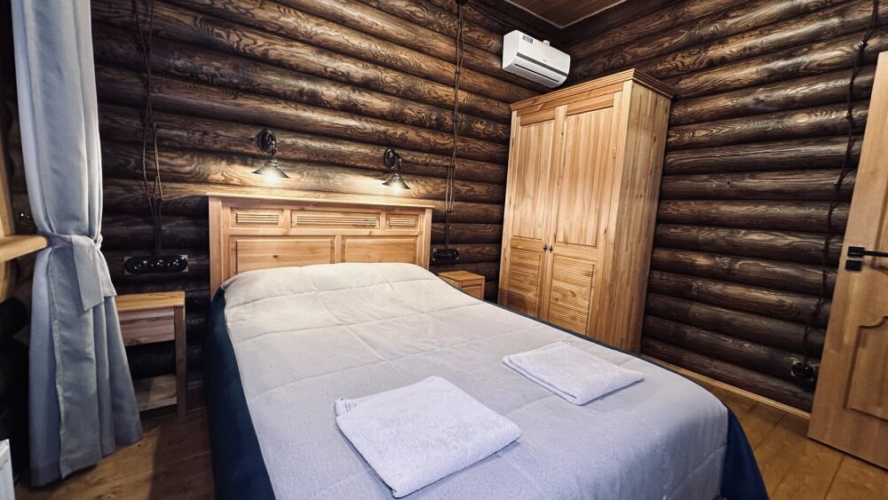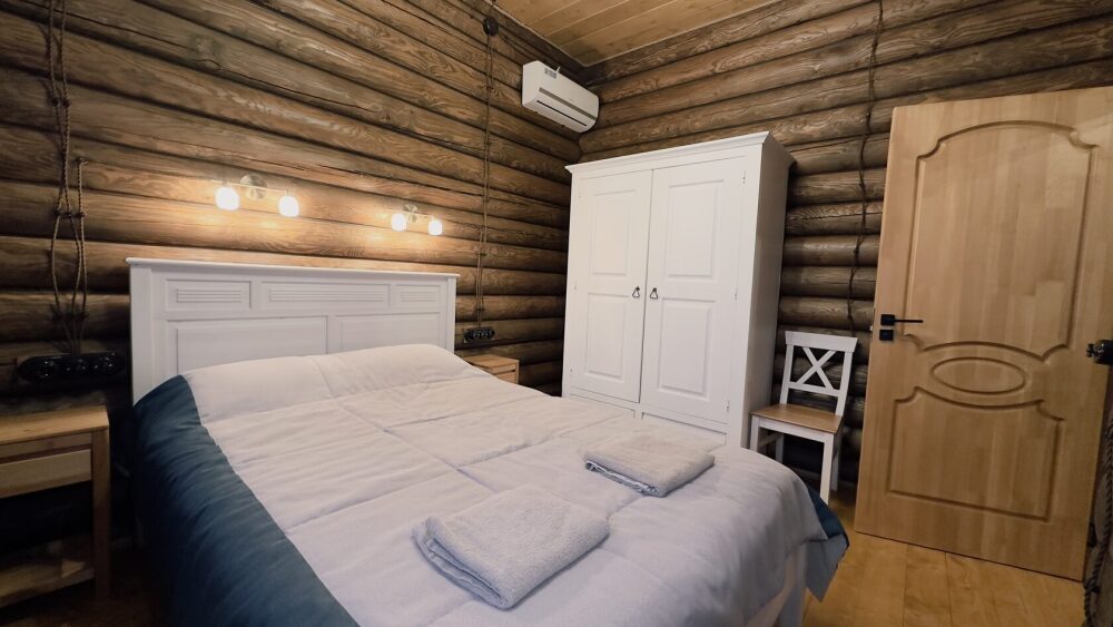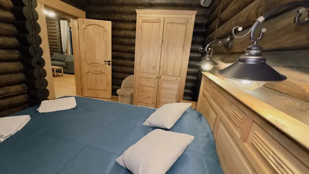Уютный дом из сруба площадью 105 м² с отдельной террасой идеально подойдёт для небольшой семьи или компании друзей. Натуральное дерево создаёт атмосферу тепла и спокойствия, а продуманная планировка обеспечивает комфорт каждому гостю. В доме две изолированные спальни с двуспальными кроватями — каждая оборудована кондиционером и собственным санузлом с душевой кабиной. В гостиной расположен раскладной двуспальный диван, что делает размещение ещё более удобным.