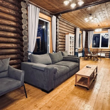 Просторный дом из сруба площадью 120 м² идеально подойдёт для большой семьи или компании друзей. Натуральное дерево и тёплый интерьер создают атмосферу загородного уюта, а продуманная планировка обеспечивает комфортное проживание для всех гостей. В доме 3 изолированные спальни: две с двуспальными кроватями и одна с двумя односпальными (вместимость 6 человек). В просторной гостиной расположена мягкая мебель и раскладной двуспальный диван, который при необходимости позволит разместить ещё 2 гостей.