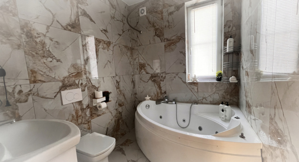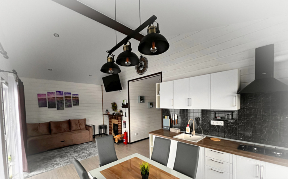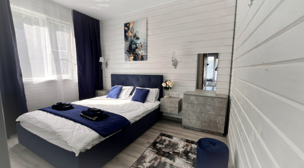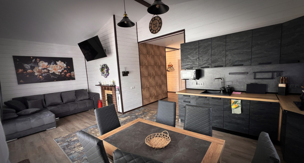 Мы понимаем, насколько Вы цените комфорт, поэтому предоставляем все удобства: современные технологии: система теплых полов по всему дому, горячая вода без ограничений, быстрый Wi-Fi, Smart TV, современный душ, туалет с септиком, кухня, посудомоечная машина, микроволновая печь, вся необходимая посуда, постельное белье, тапочки и полотенца для каждого гостя, большая терраса с качелями с живописными видами.