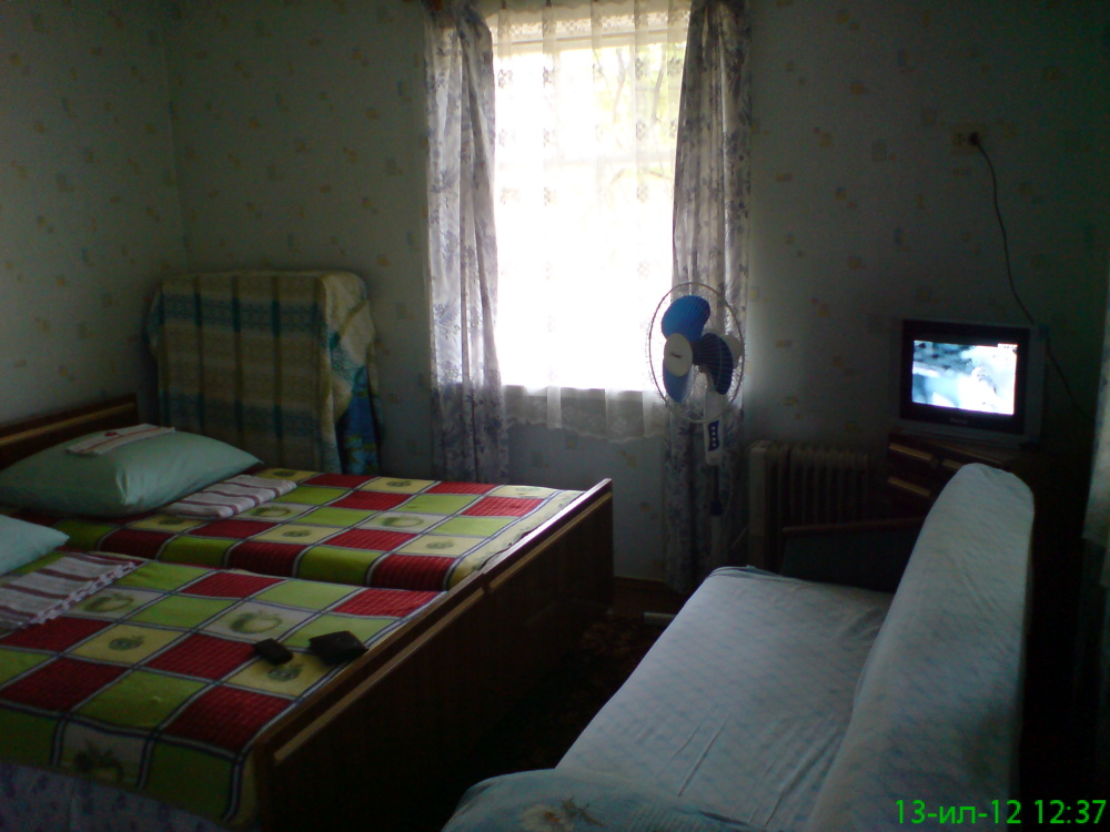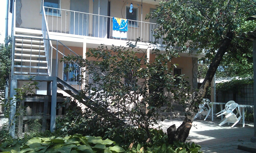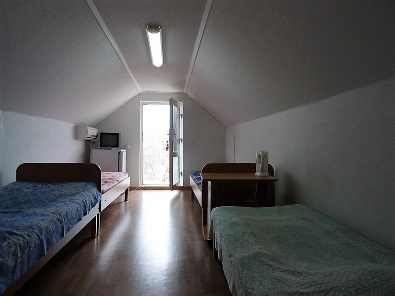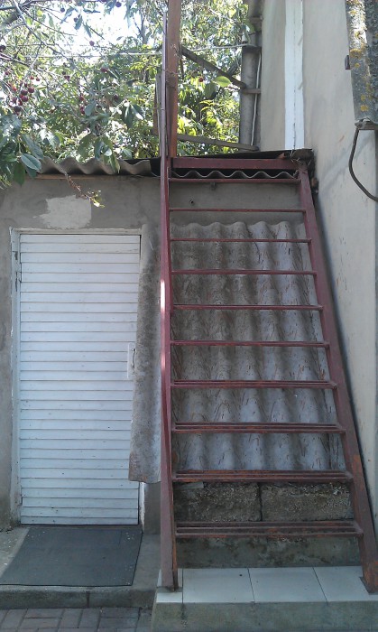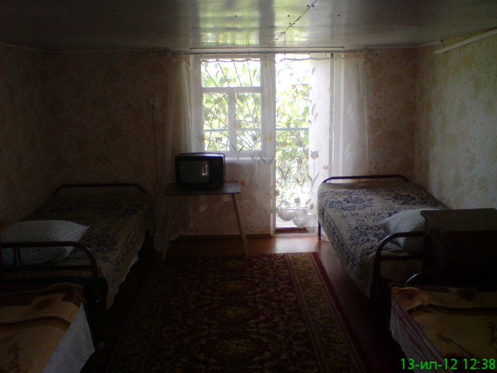 Номер в садовом домике старой постройки. В номере панцирные полуторные кровати с ватными матрасами, есть балкон, основной недостаток - неудобная крутая металлическая лестница, низкий потолок , удобства во дворе общие.