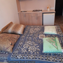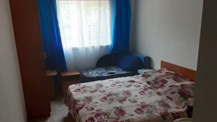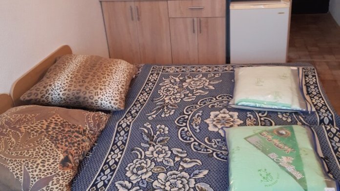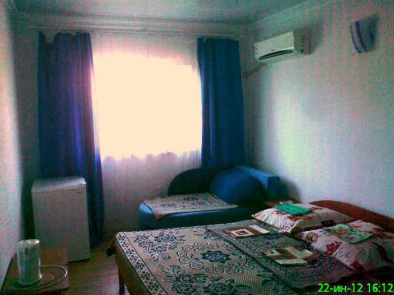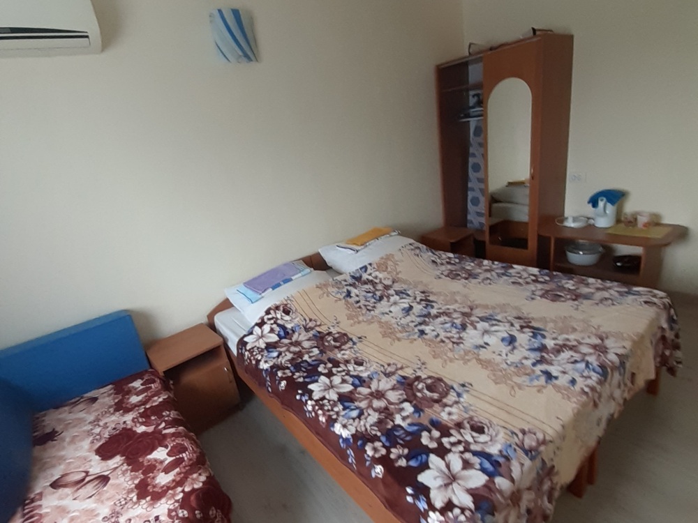 номер со всеми удобствами и встроенной мини-кухней. В Номере две кровати, диван, вешалка для одежды с зеркалом, тумба для обуви, прикроватные тумбочки, журнальный столик, вентилятор, стеклопакеты, москитные сетки. Отделан современными материалами.
