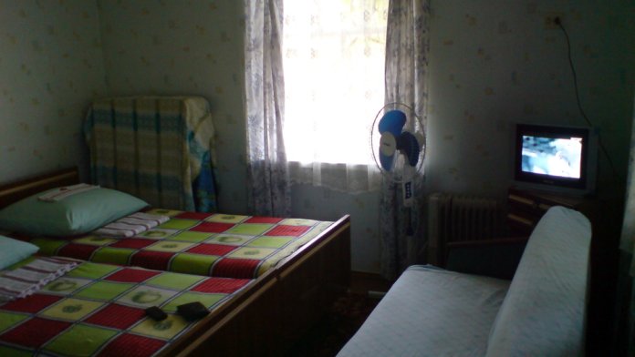 Небольшая уютная комната с двумя кроватями, телевизором, холодильником, вентилятором. Имеется журнальный столик, прикроватные тумбочки, Вешалка для одежды с зеркалом, тумба для обуви. Душ и туалет персональные в отдельных кабинках в 10 метрах от номера.