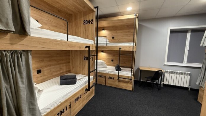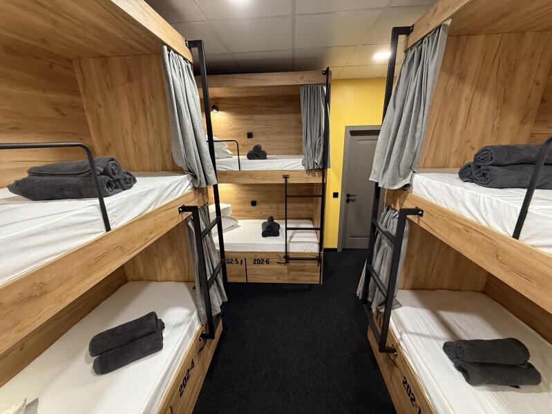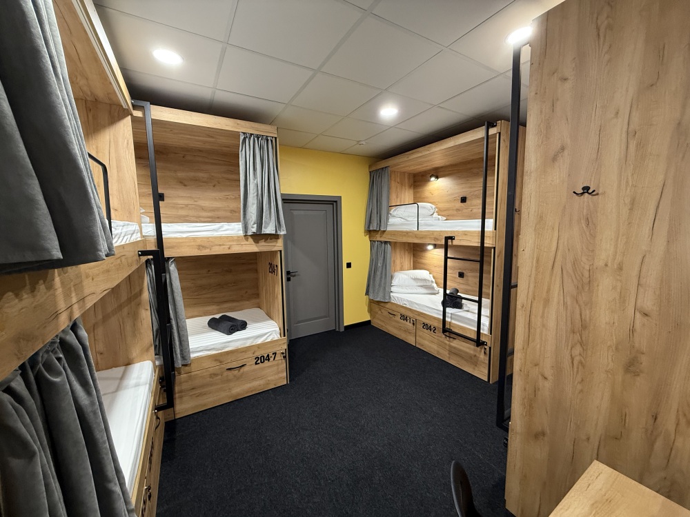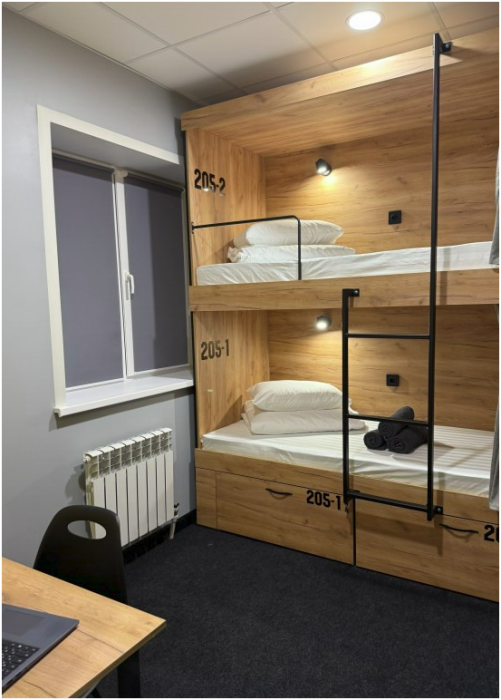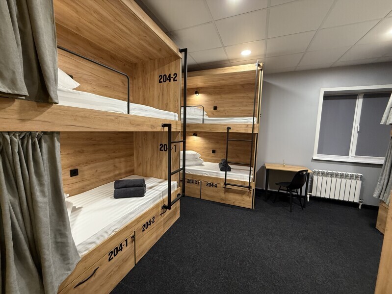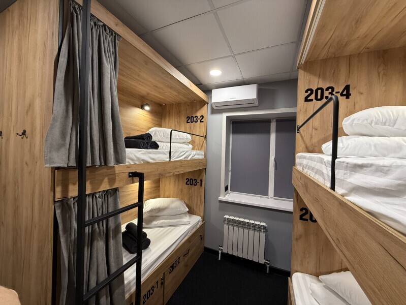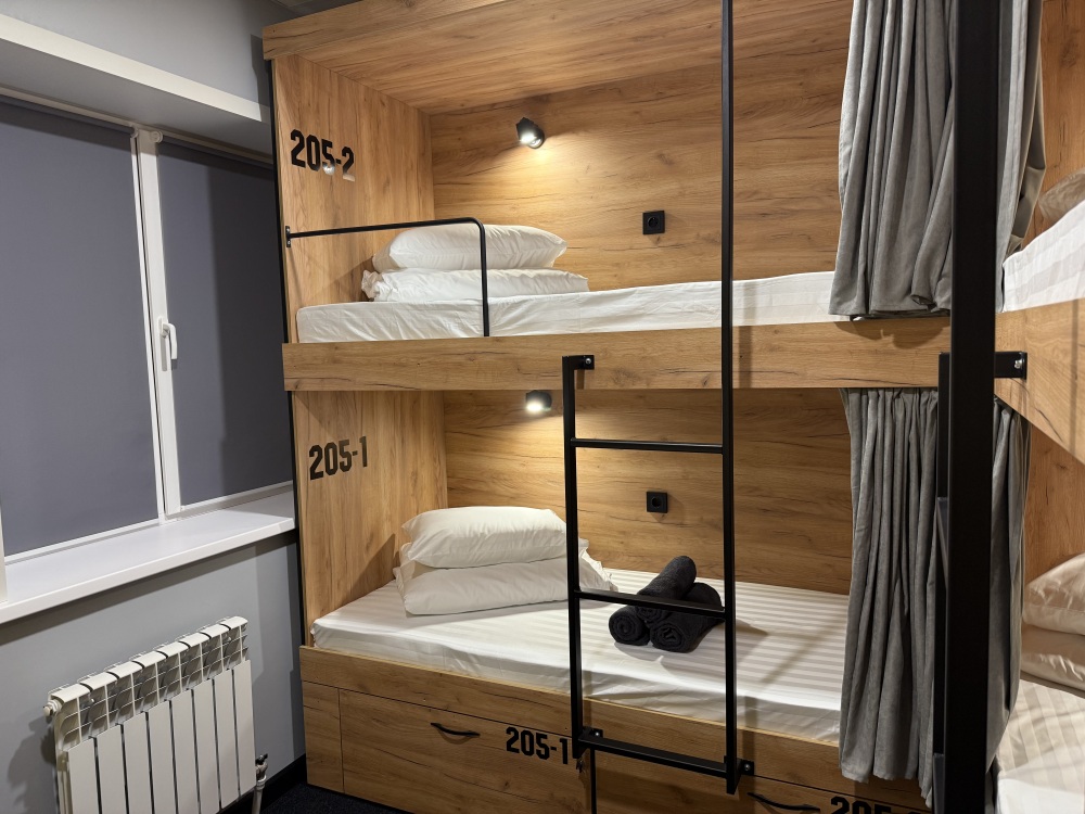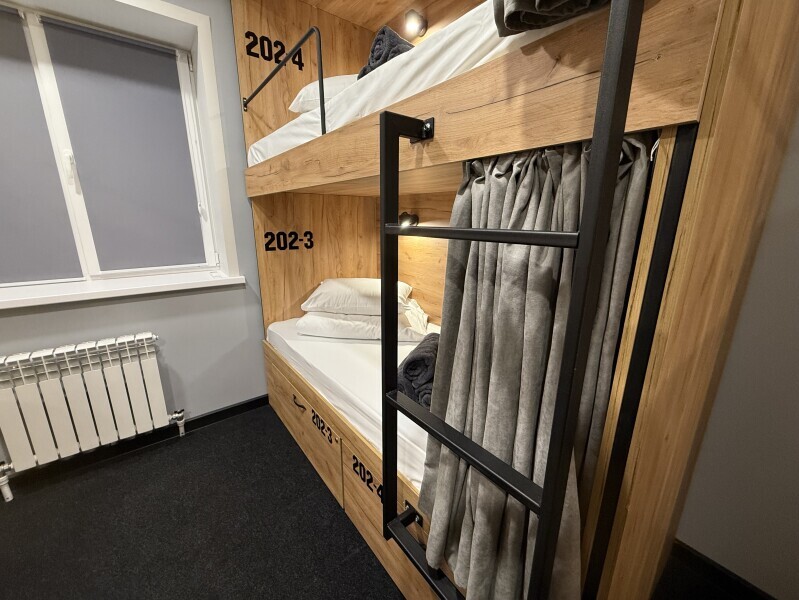 Комнаты оснащена несколькими двухъярусными кроватями, каждая из которых имеет индивидуальное освещение и розетку. Кровати обшиты мягким текстилем и шторками для обеспечения приватности. У нас Вы сможете не только отдохнуть, но и познакомиться с новыми людьми, узнать больше о нашей культуре и открыть для себя удивительную Казань.