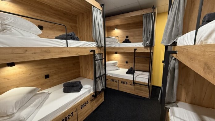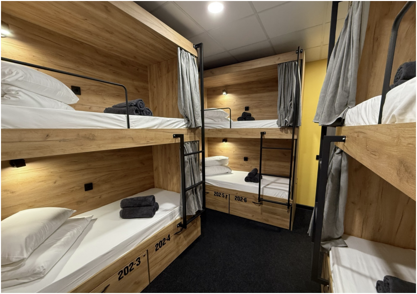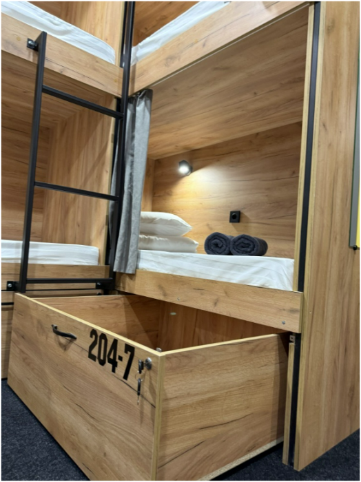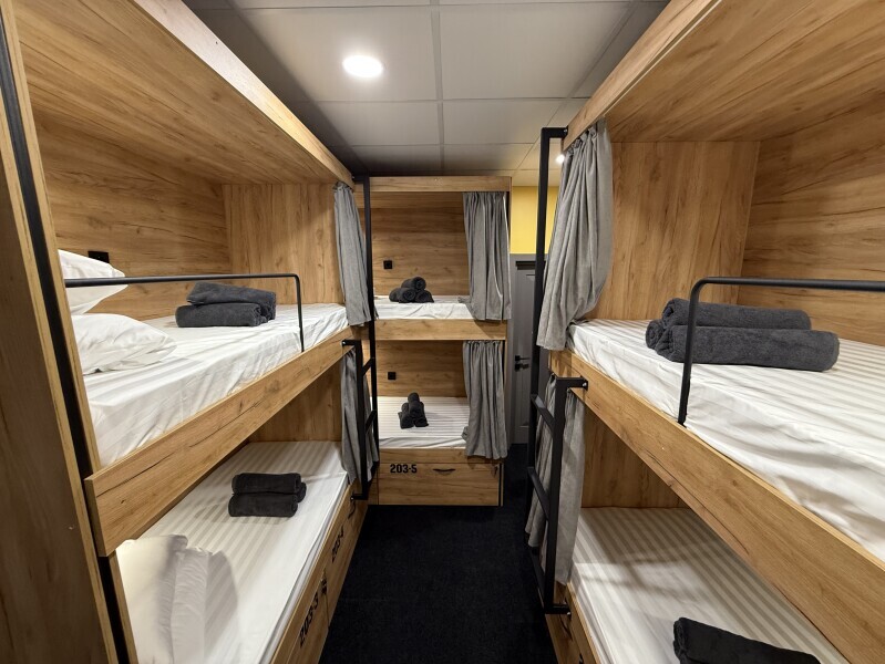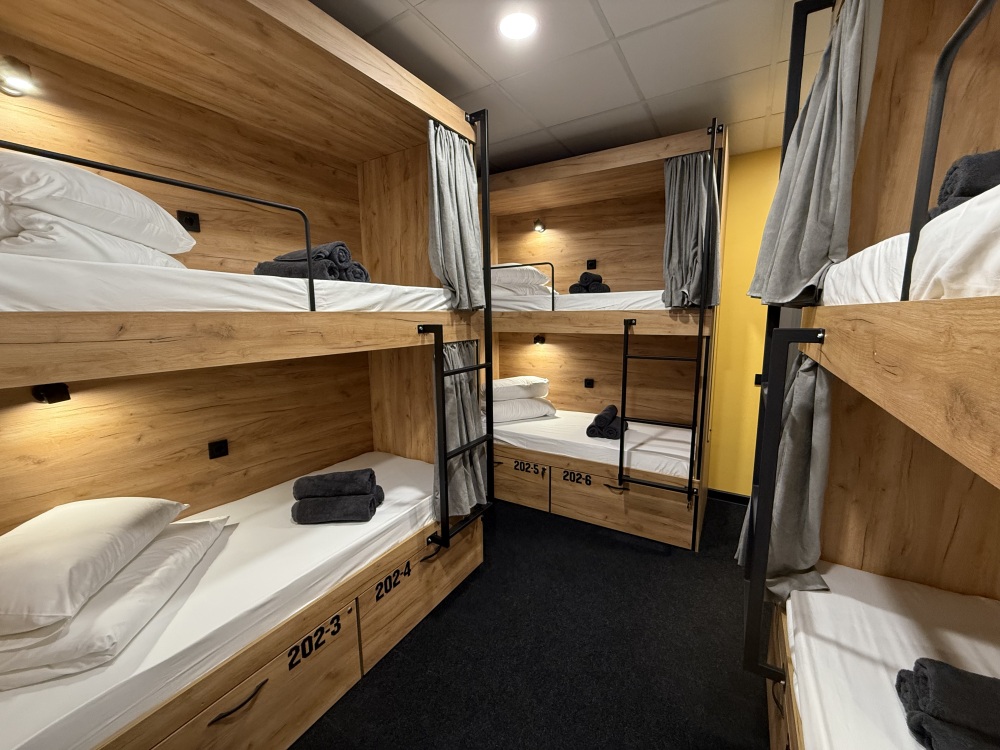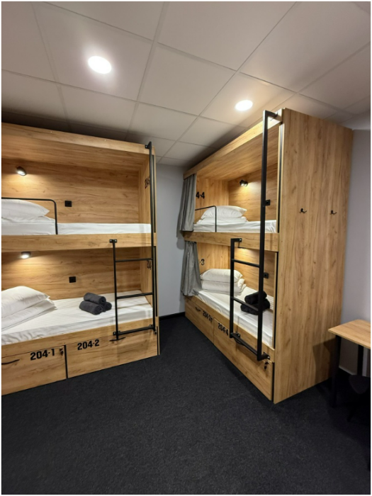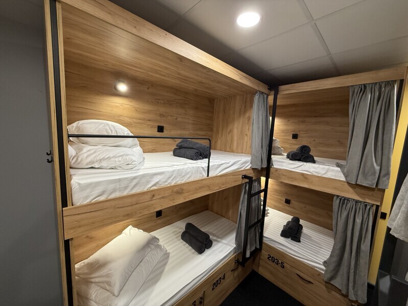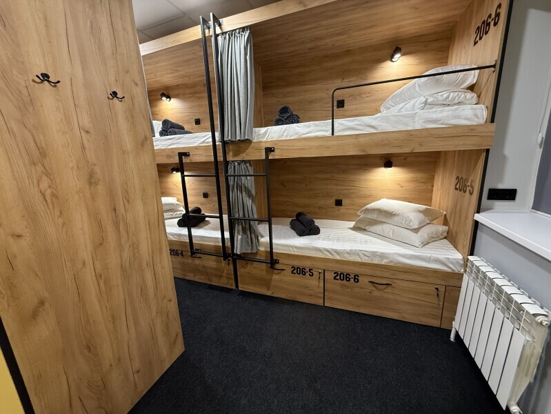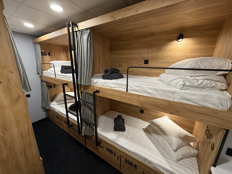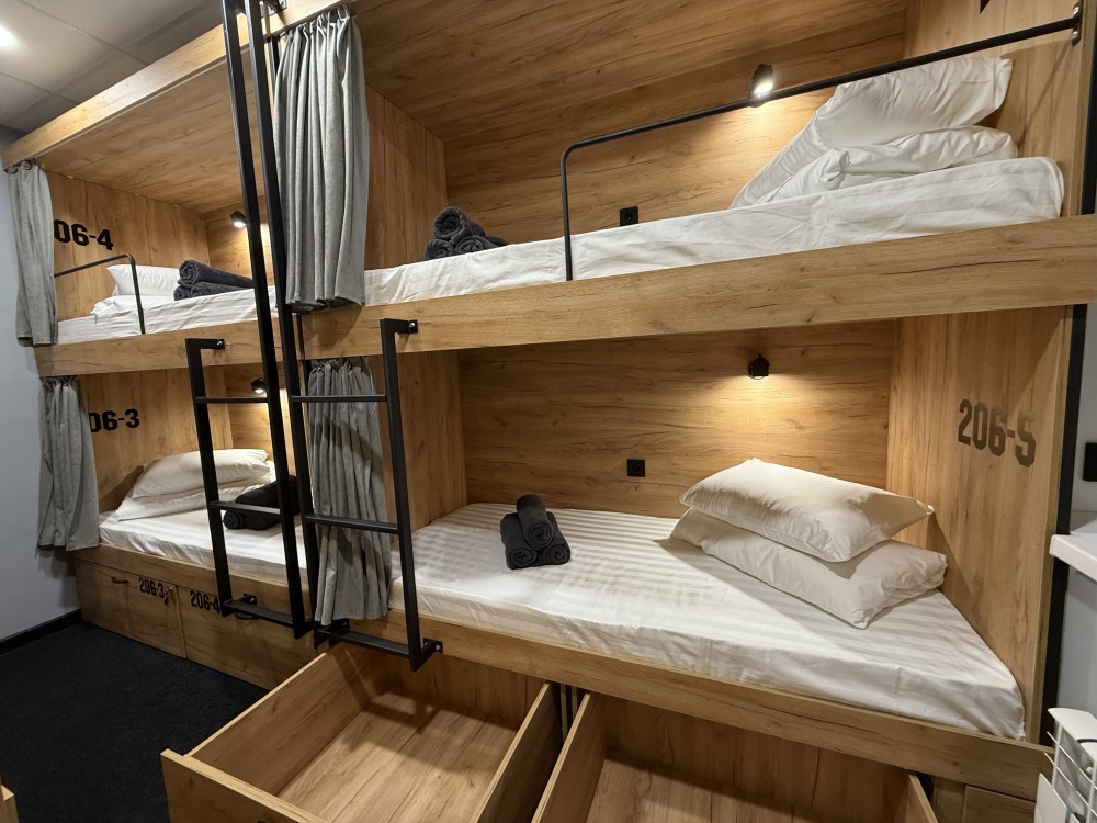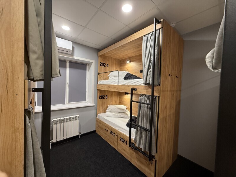 Комфортный номер с 3-мя двухъярусными кроватями. Каждая кровать с индивидуальной розеткой и освещением, закрывающаяся шторка позволяет создать уединенное пространство.