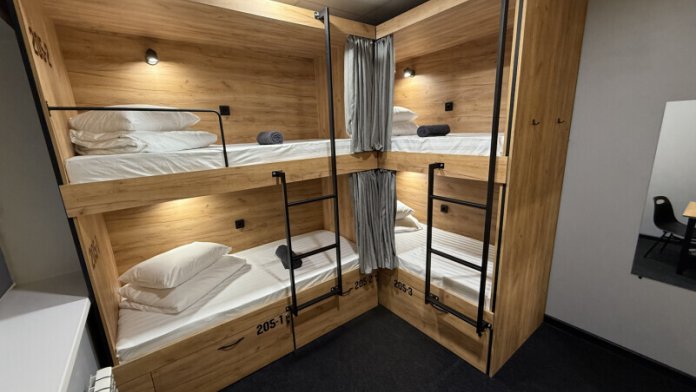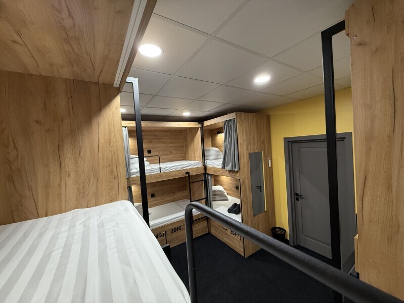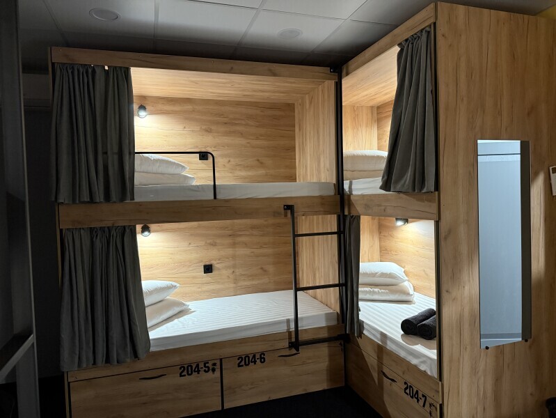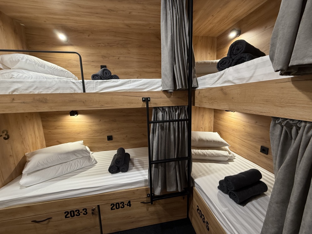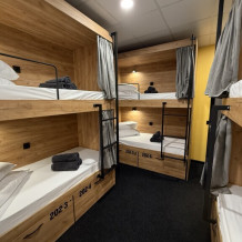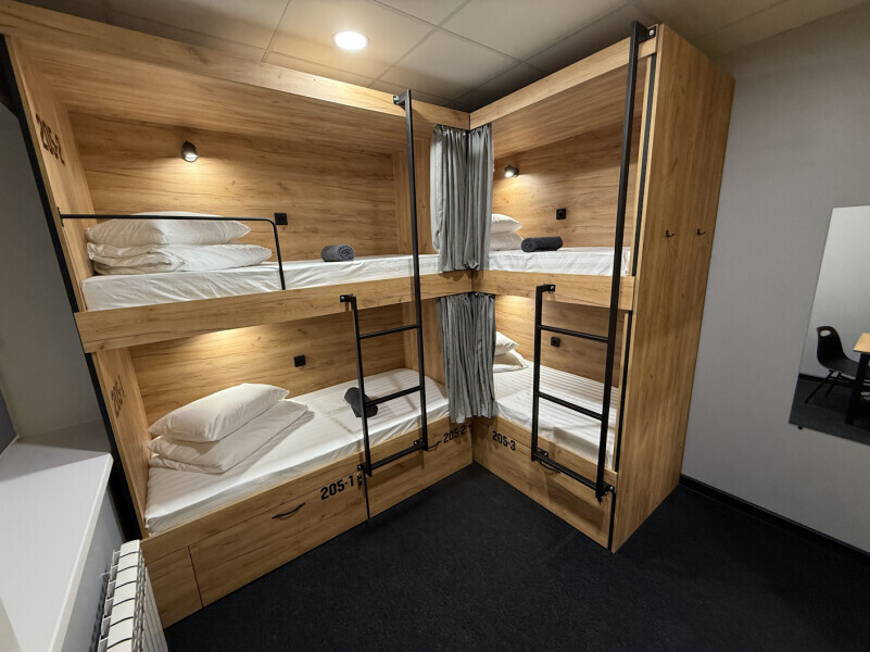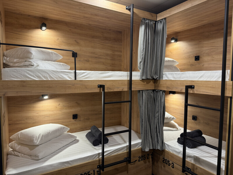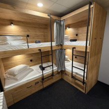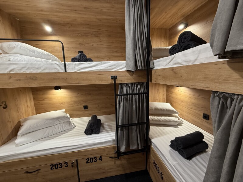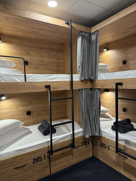 Комфортный номер с 4-мя двухъярусными кроватями. Каждая кровать с индивидуальной розеткой и освещением, закрывающаяся шторка позволяет создать уединенное пространство.