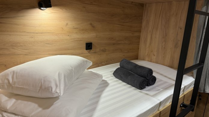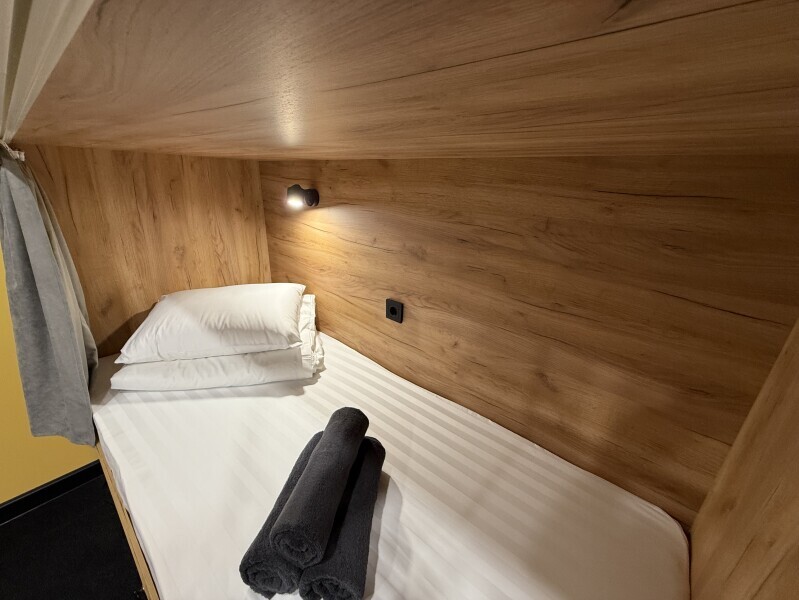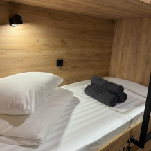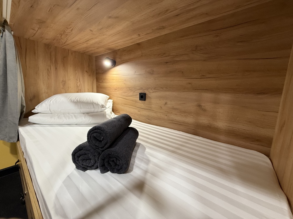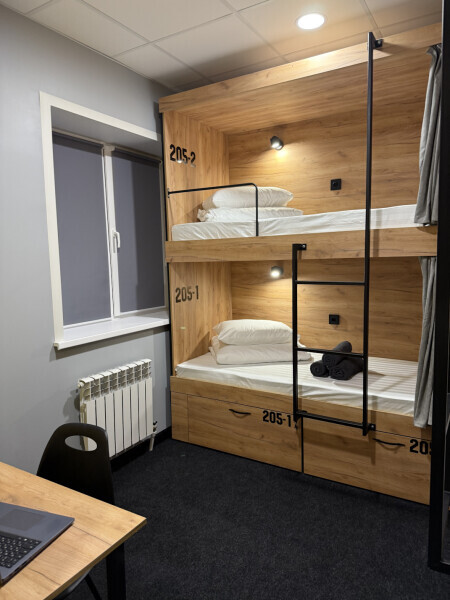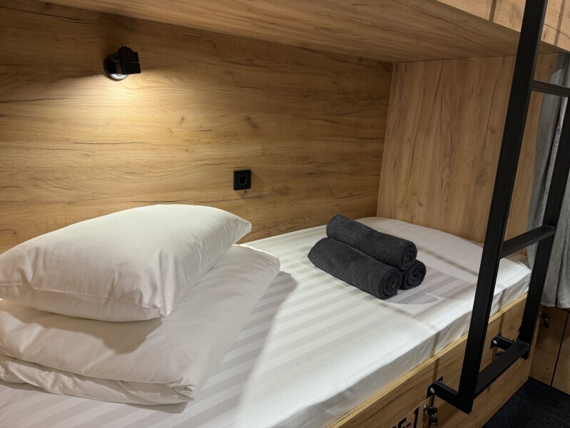 Комфортный номер с 2-мя двухъярусными кроватями. Каждая кровать с индивидуальной розеткой и освещением, закрывающаяся шторка позволяет создать уединенное пространство. Всегда чистое и свежее постельное белье, полотенце.