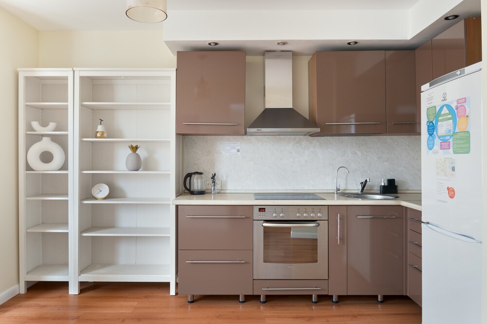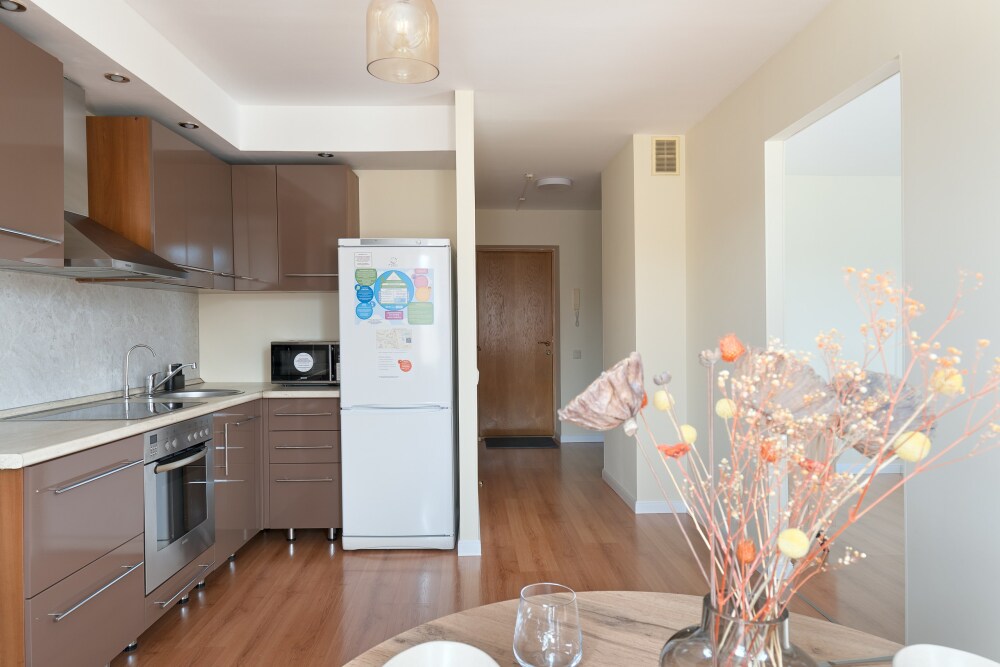 Современная мебель и ремонт, имеется вся необходимая бытовая техника, вплоть до блендера и мультиварки, посуда.