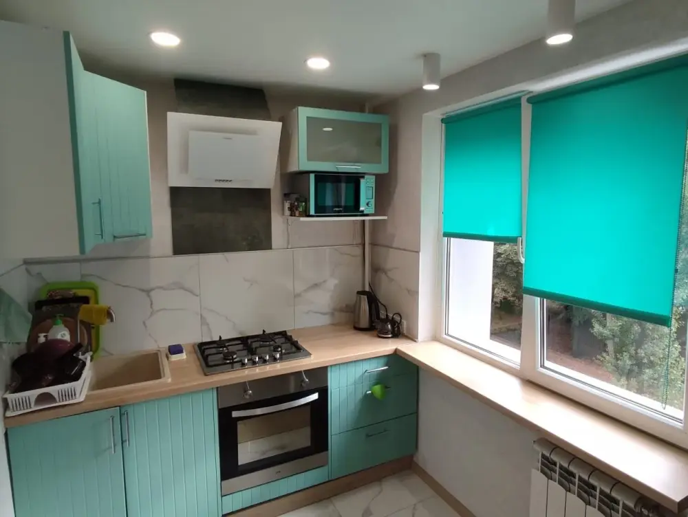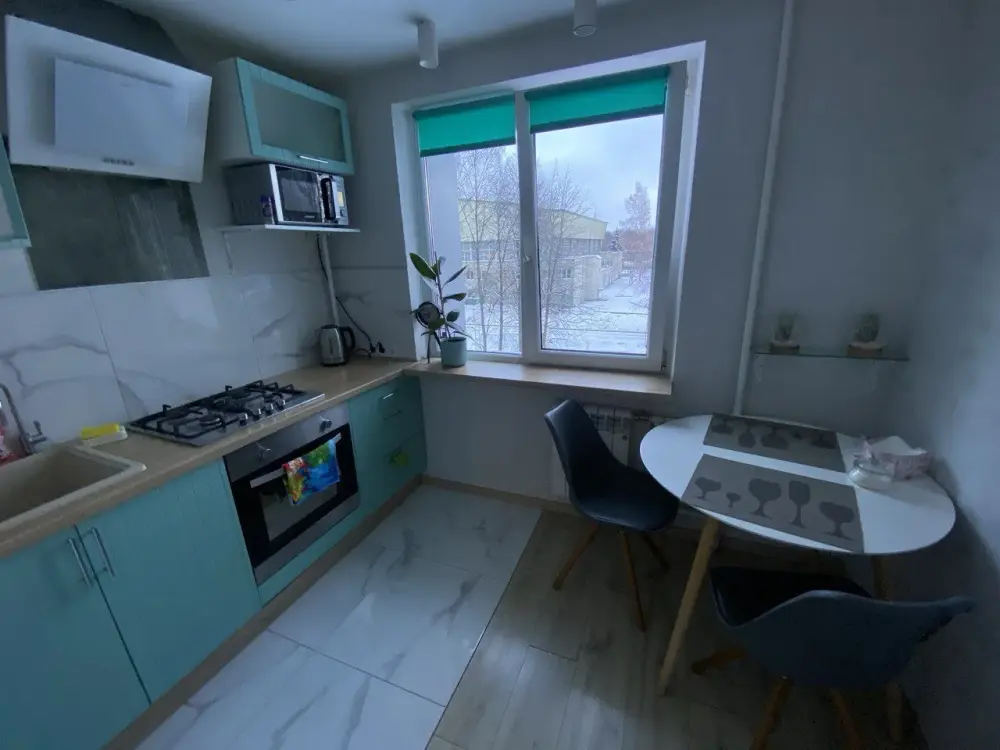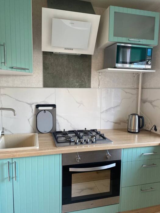 Внутри расположена яркая кухня с необходимой посудой и бытовой техникой для возможности приготовить еду самостоятельно.