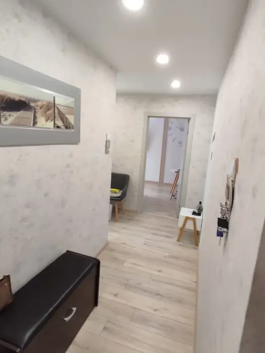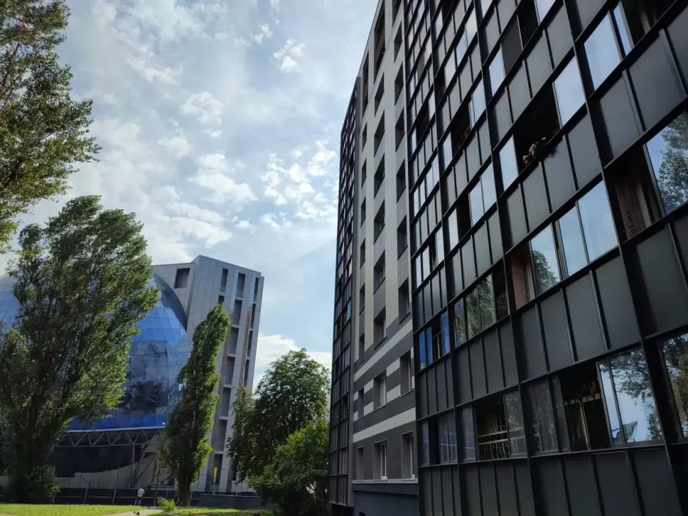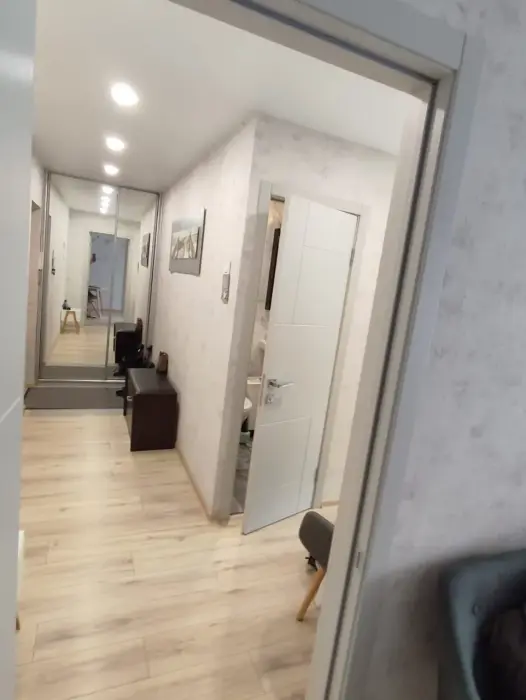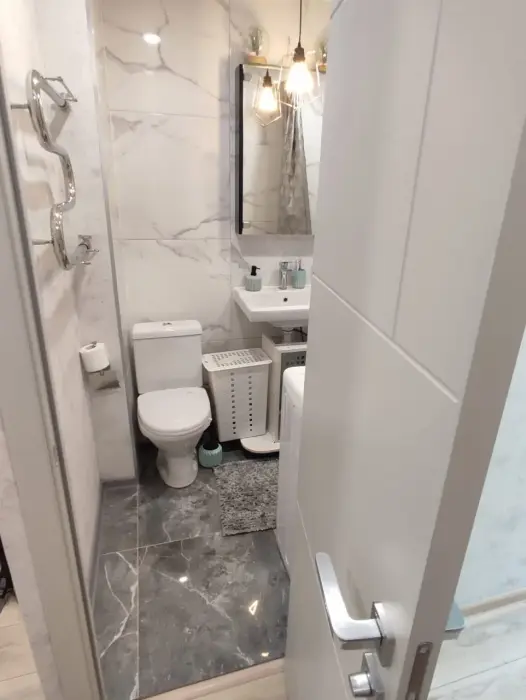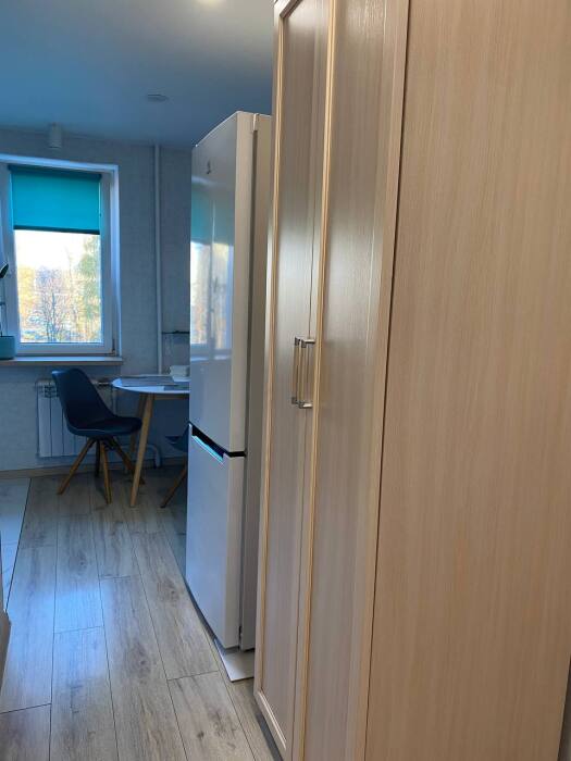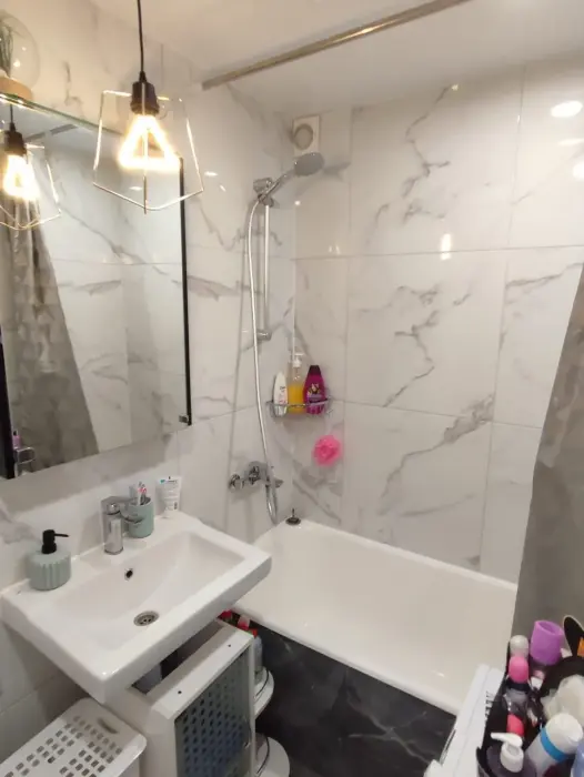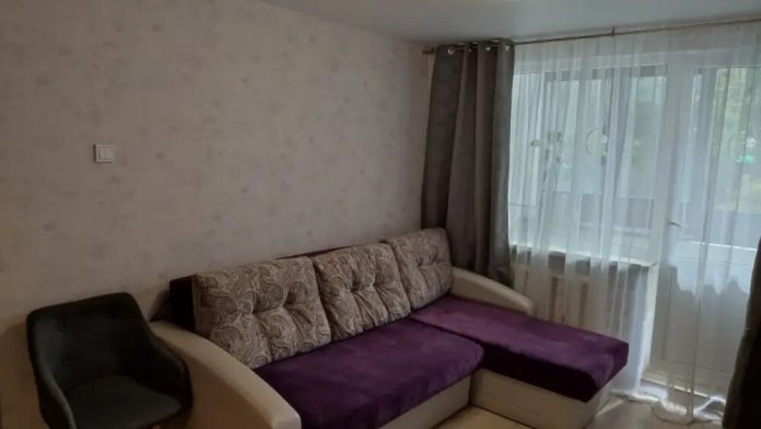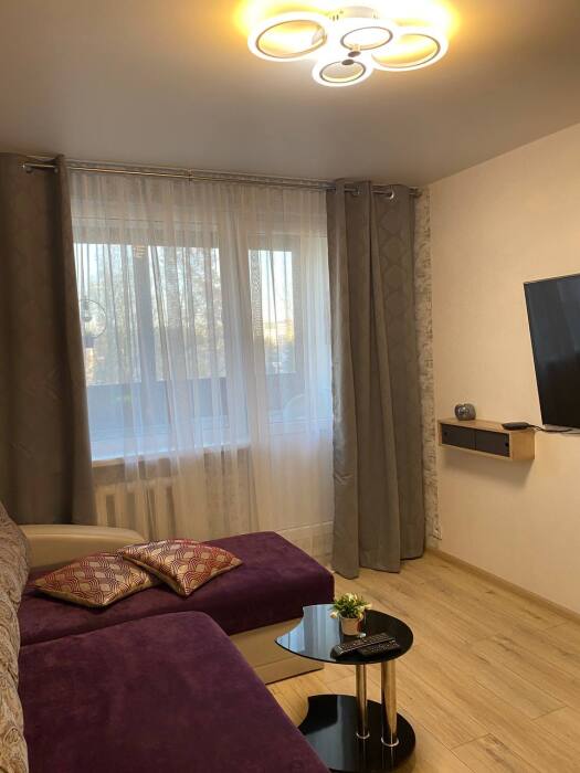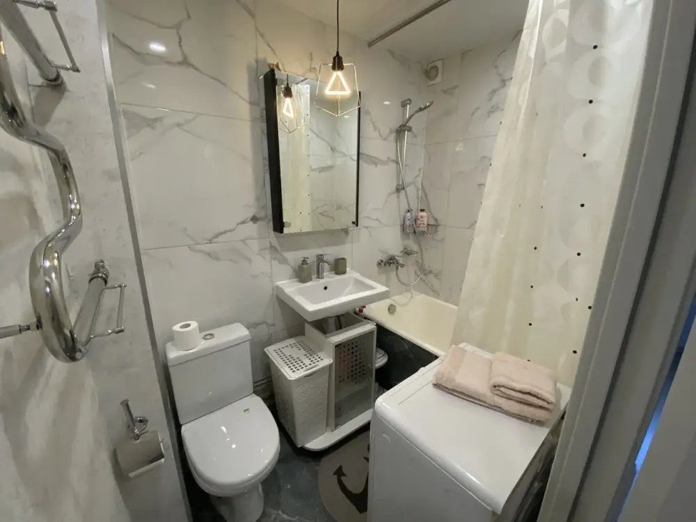 Потенциальным проживающим предложена квартира с необходимой бытовой техникой и мебелью. В ней - диван, большой современный телевизор, санузел.