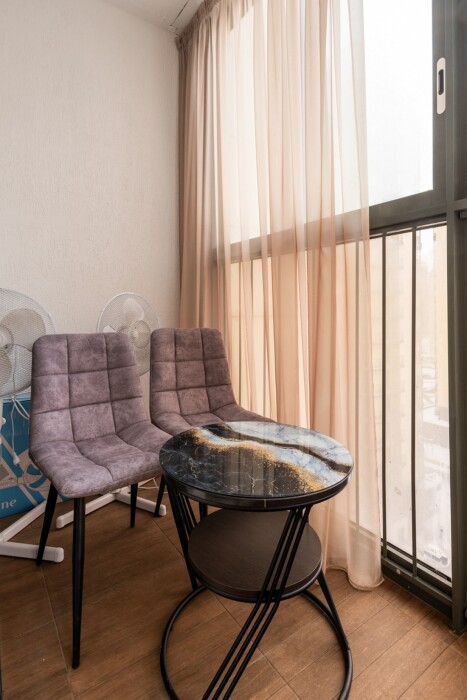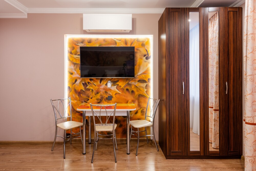 Имеется телевизор, кондиционер, шкаф, вешалка, рабочий стол, чайник, холодильник, стулья, зеркало, посуда, плита, столовые приборы, стиральная машина, сушилка для белья, утюг, гладильная доска.