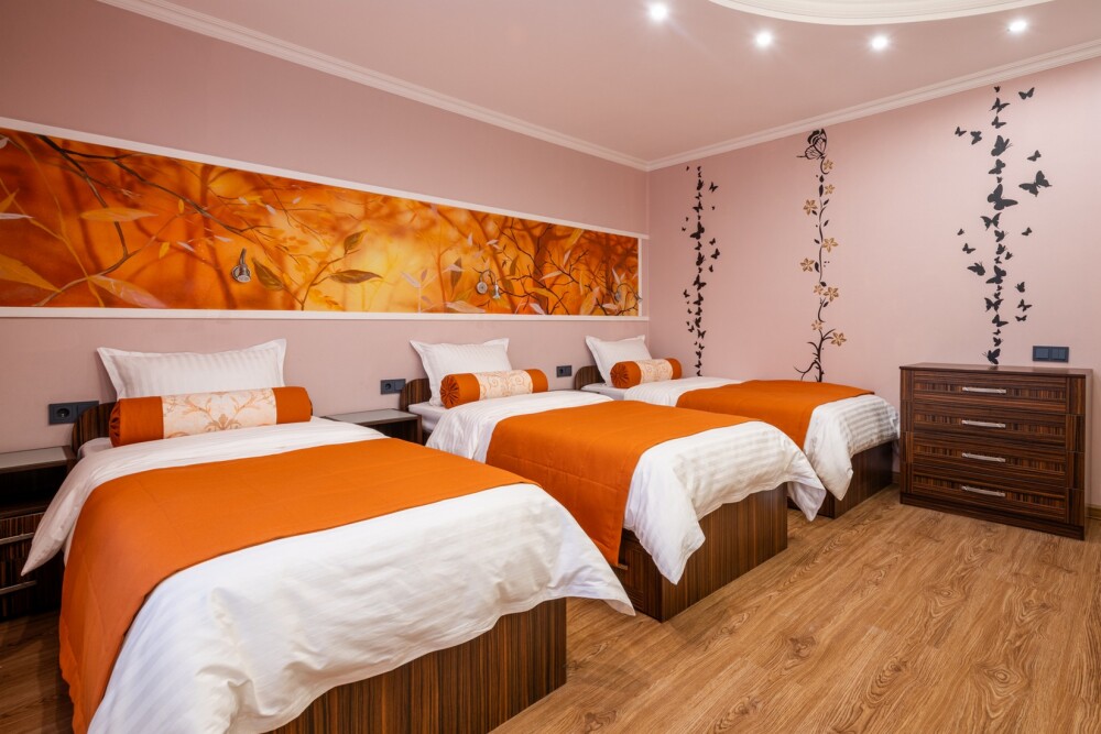 Имеет 4 спальни с приятным интерьером и гостиную.