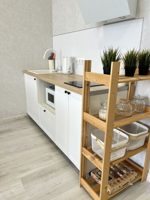 Техника на кухне: холодильник, индукционная плита, электрочайник, микроволновка.