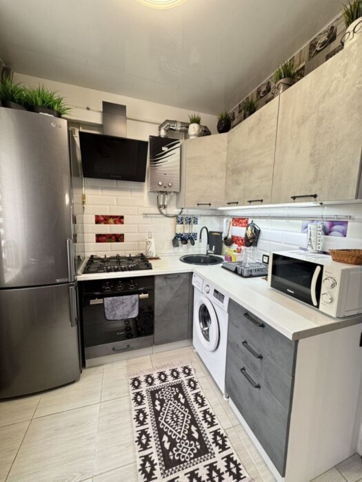 Техника на кухне: большой холодильник, газовая плита, электрочайник, микроволновка.