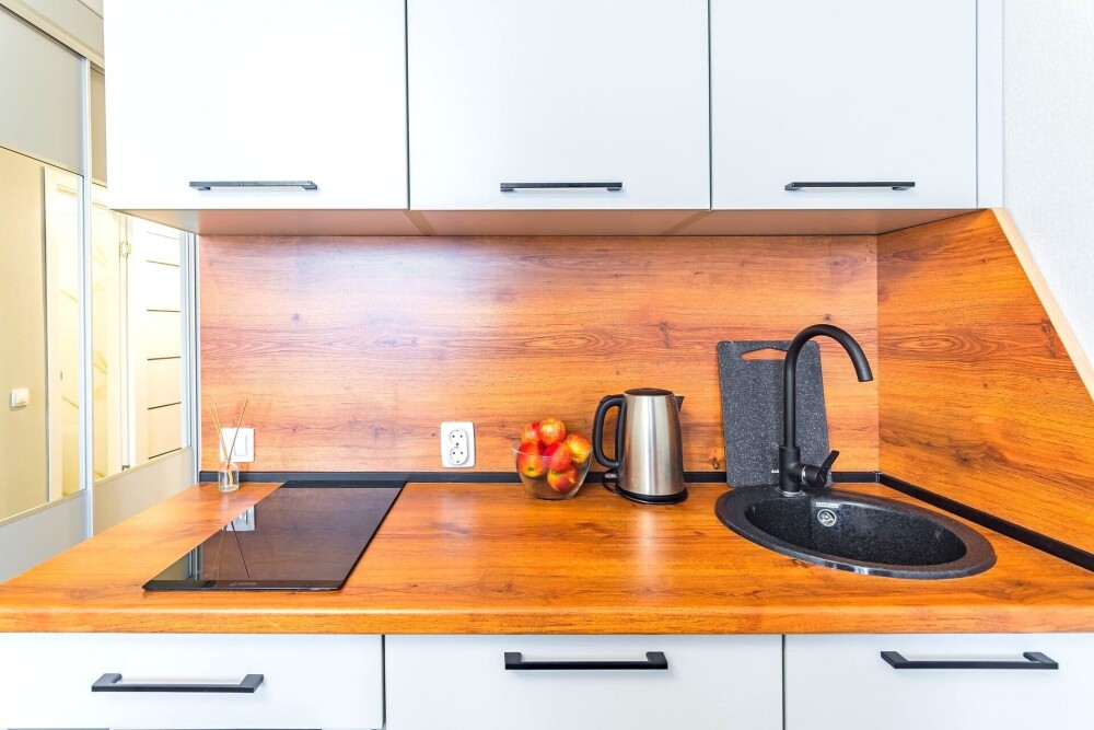 - полностью оборудованная кухня (холодильник, плита, СВЧ-печь, чайник, набор посуды);