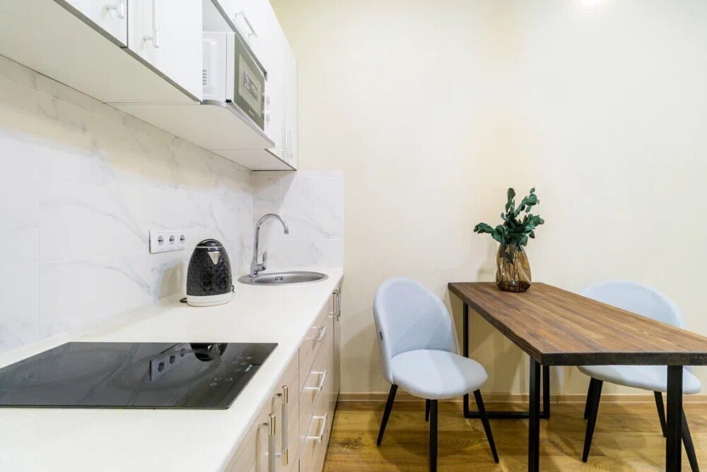 - Полностью оборудованная кухня (холодильник, плита, СВЧ-печь, чайник, набор посуды);