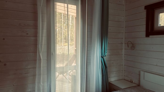 - спальня с большой двуспальной кроватью 160/200 и двумя большими окнами с видом на Карельский лес, комод для личных вещей;