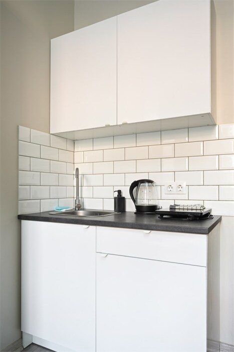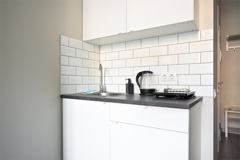 - Полноценная кухонная зона с электрической плиткой, - холодильником и раковиной.