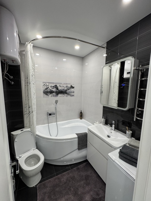 В ванной есть стиральная машинка, ванна, шампунь, полотенца, туалетные принадлежности.