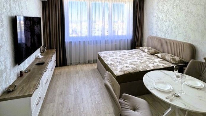 В квартире евроремонт, укомплектована современной новой мебелью и техникой, встроенный кухонный гарнитур, есть посуда.