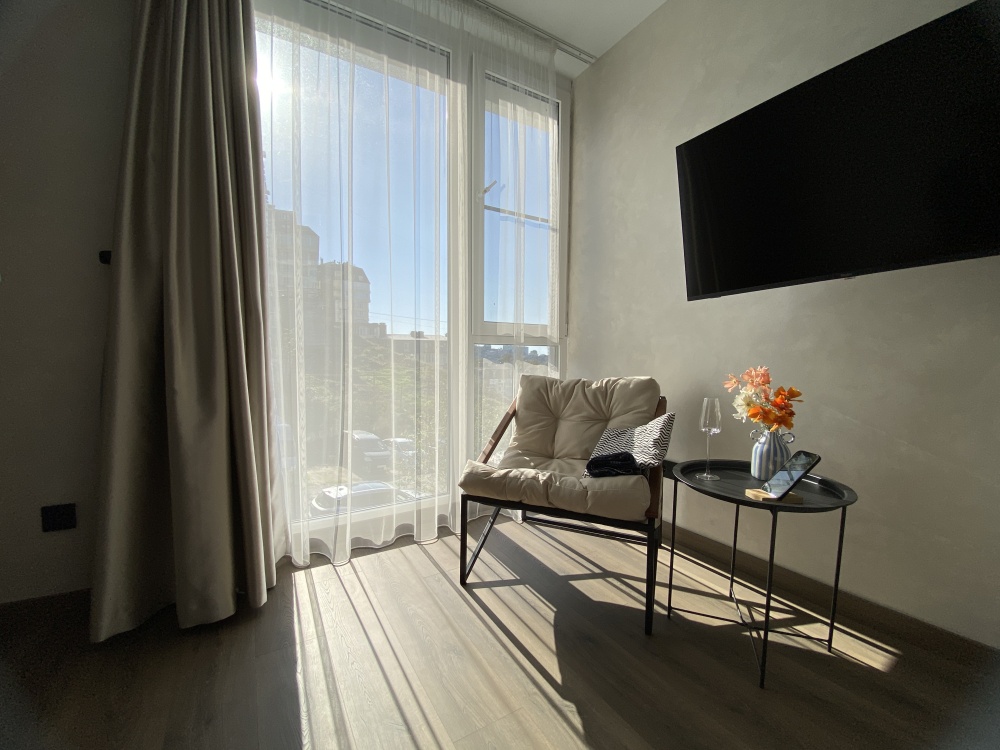 - панорамные окна и светонепроницаемые шторы Блэкаут;