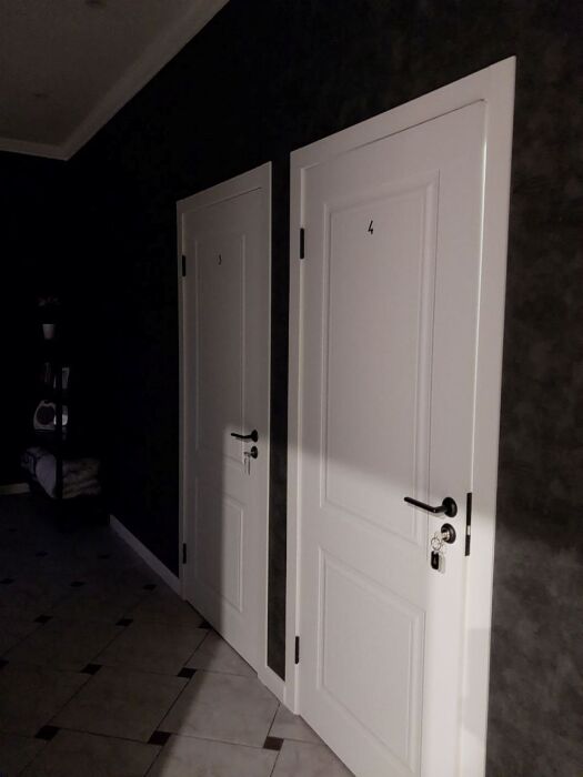 В каждой комнате установлены: телевизор смарт, одна двуспальная кровать с постельным бельем, прикроватные тумбочки, журнальный стол, кресло или стул.